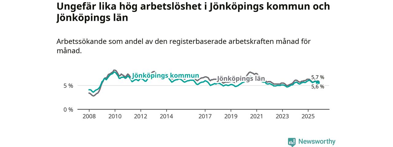 Jönköping går därmed mot strömmen i förhållande till andra kommuner i Jönköpings län. I de flesta andra kommuner i länet går arbetslösheten nedåt. Störst är minskningen i Vetlanda, där arbetslösheten sjunker med 1,1 procentenheter. I tabellen längre ner ser du utvecklingen i samtliga kommuner i länet.