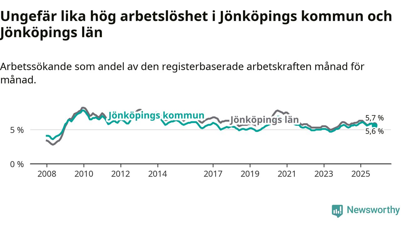 Arbetslösheten i Jönköping ligger därmed kvar på i stort sett samma nivå som i hela Jönköpings län. Habo har den lägsta arbetslösheten i länet (3,4 procent), medan Nässjö har den högsta (7,6 procent). För att Jönköping skulle komma ner i samma arbetslöshetsnivå som Habo skulle 1 688 personer behöva sysselsättas.
