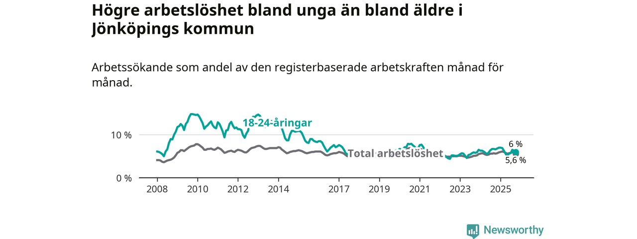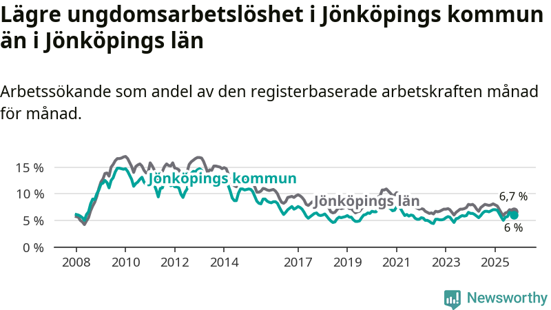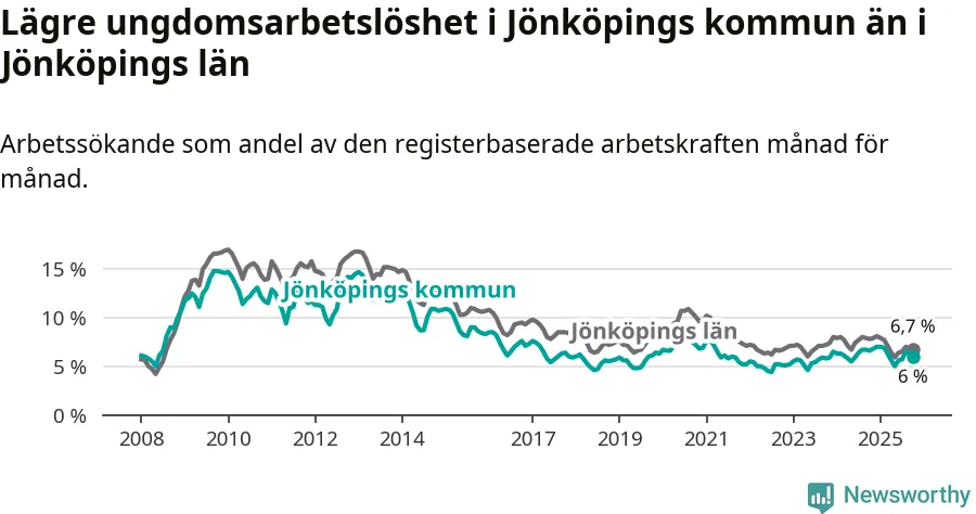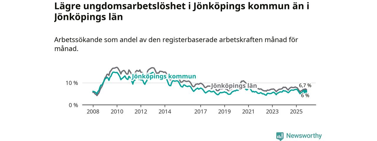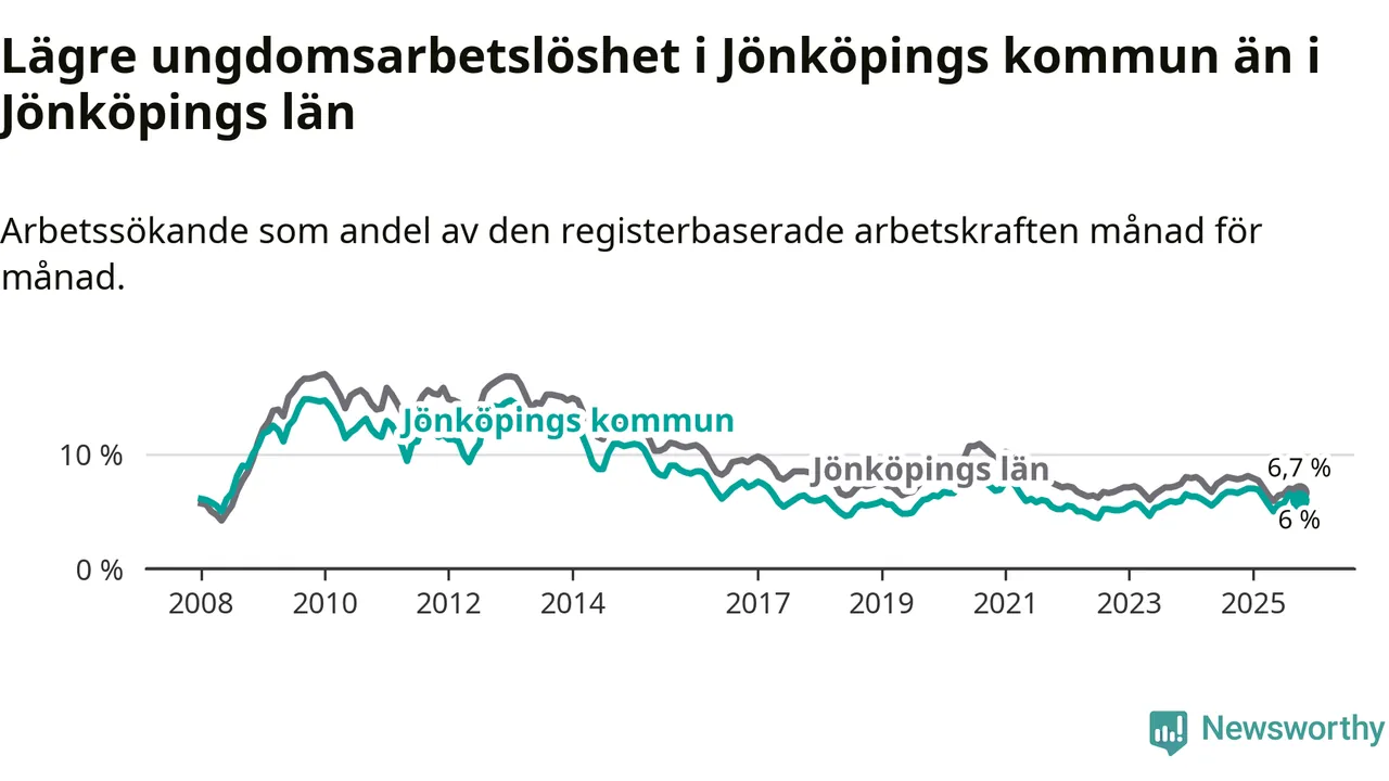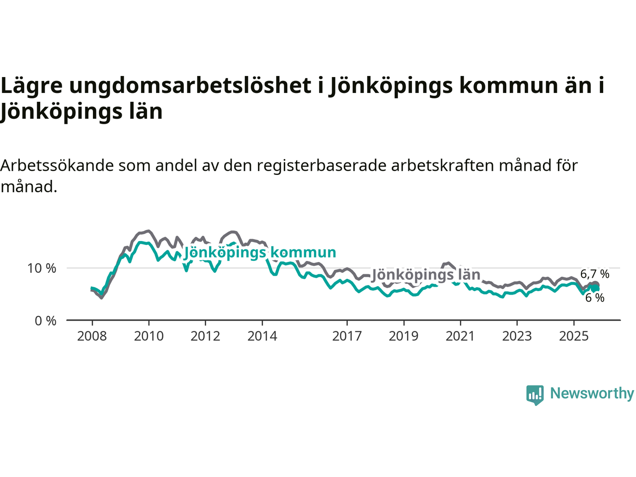 Medan Jönköping har ungefär samma total arbetslöshet som Jönköpings län, ligger ungdomsarbetslösheten 0,7 procentenheter lägre i Jönköping.