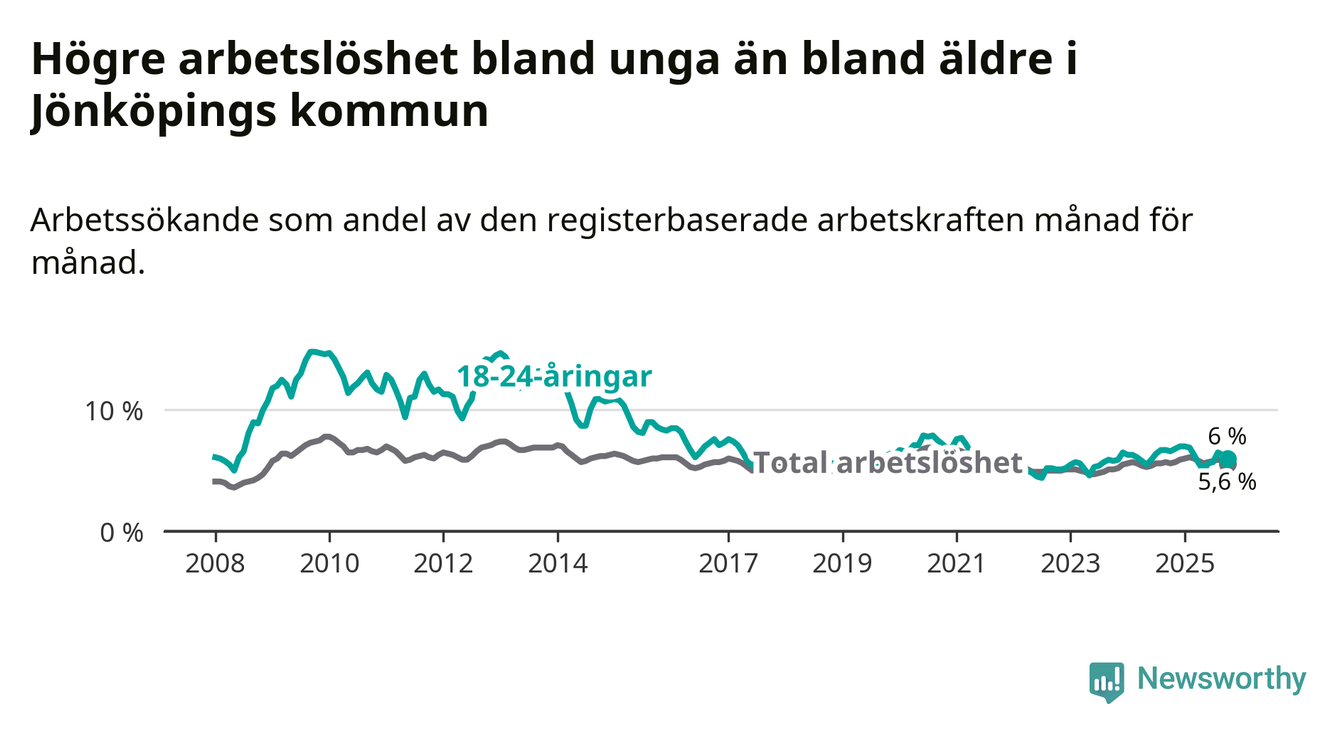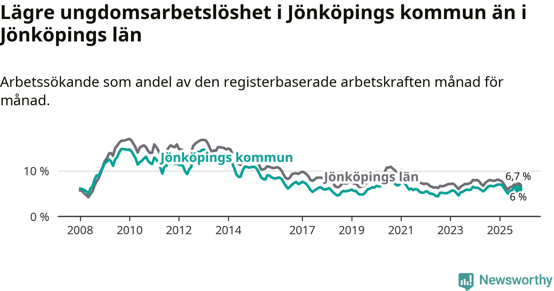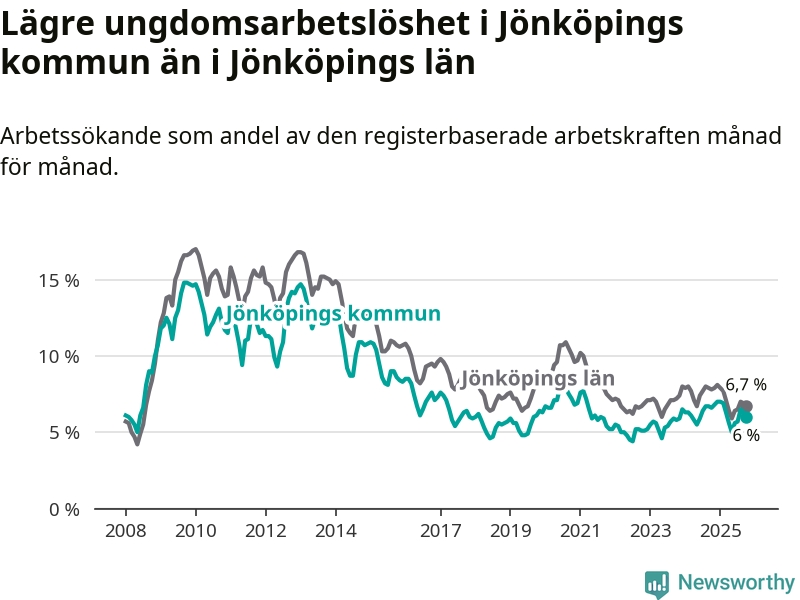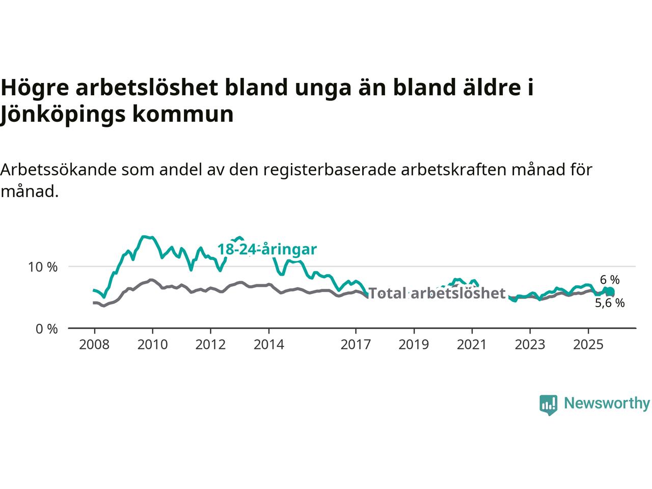 Medan Jönköping har ungefär samma total arbetslöshet som Jönköpings län, ligger ungdomsarbetslösheten 0,7 procentenheter lägre i Jönköping.