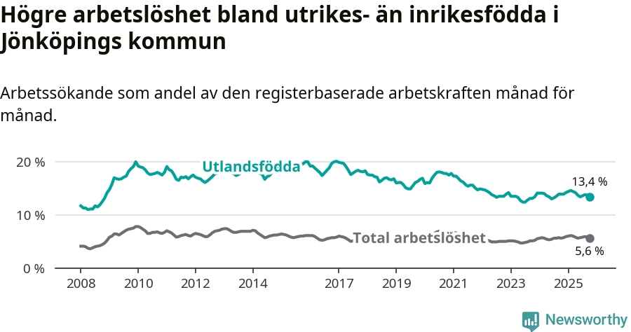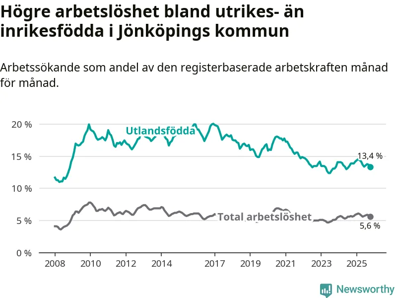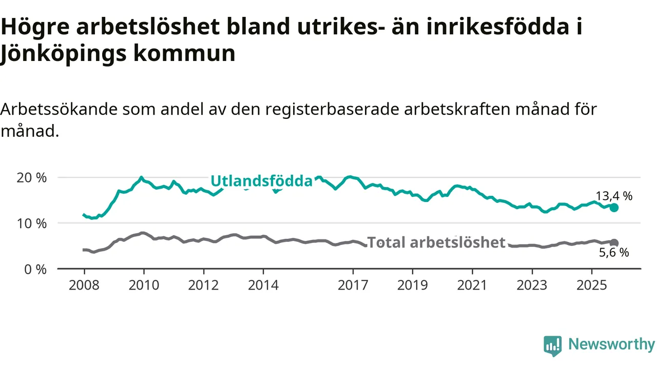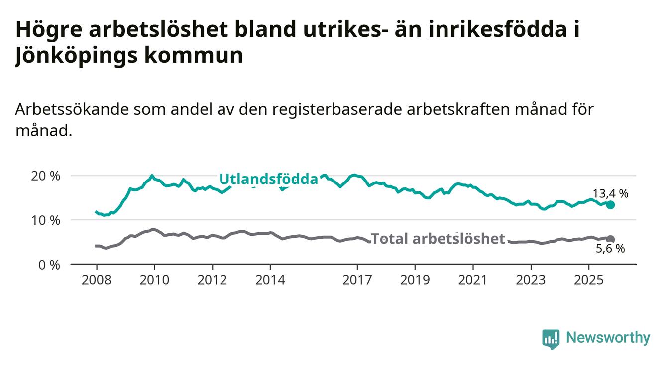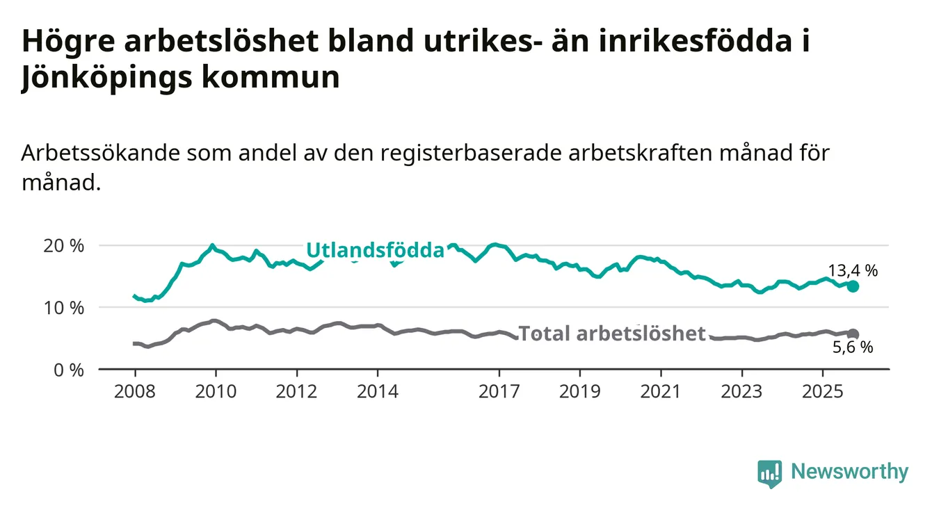 Arbetslösheten bland utlandsfödda var 13,4 procent i Jönköping under oktober månad, motsvarande 2 471 av 18 440 personer. Det är 0,5 procentenheter färre än vid samma tidpunkt i fjol (−41 om man räknar personer).