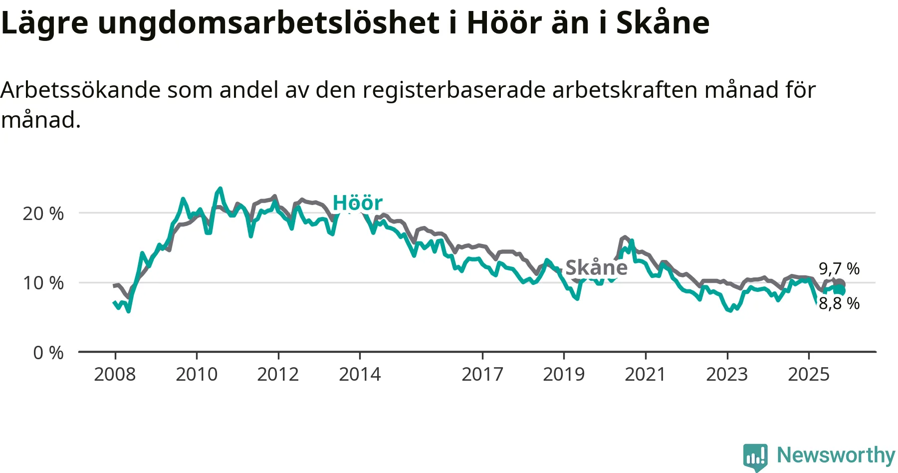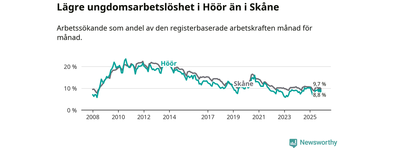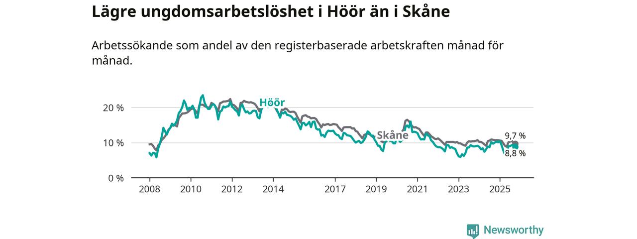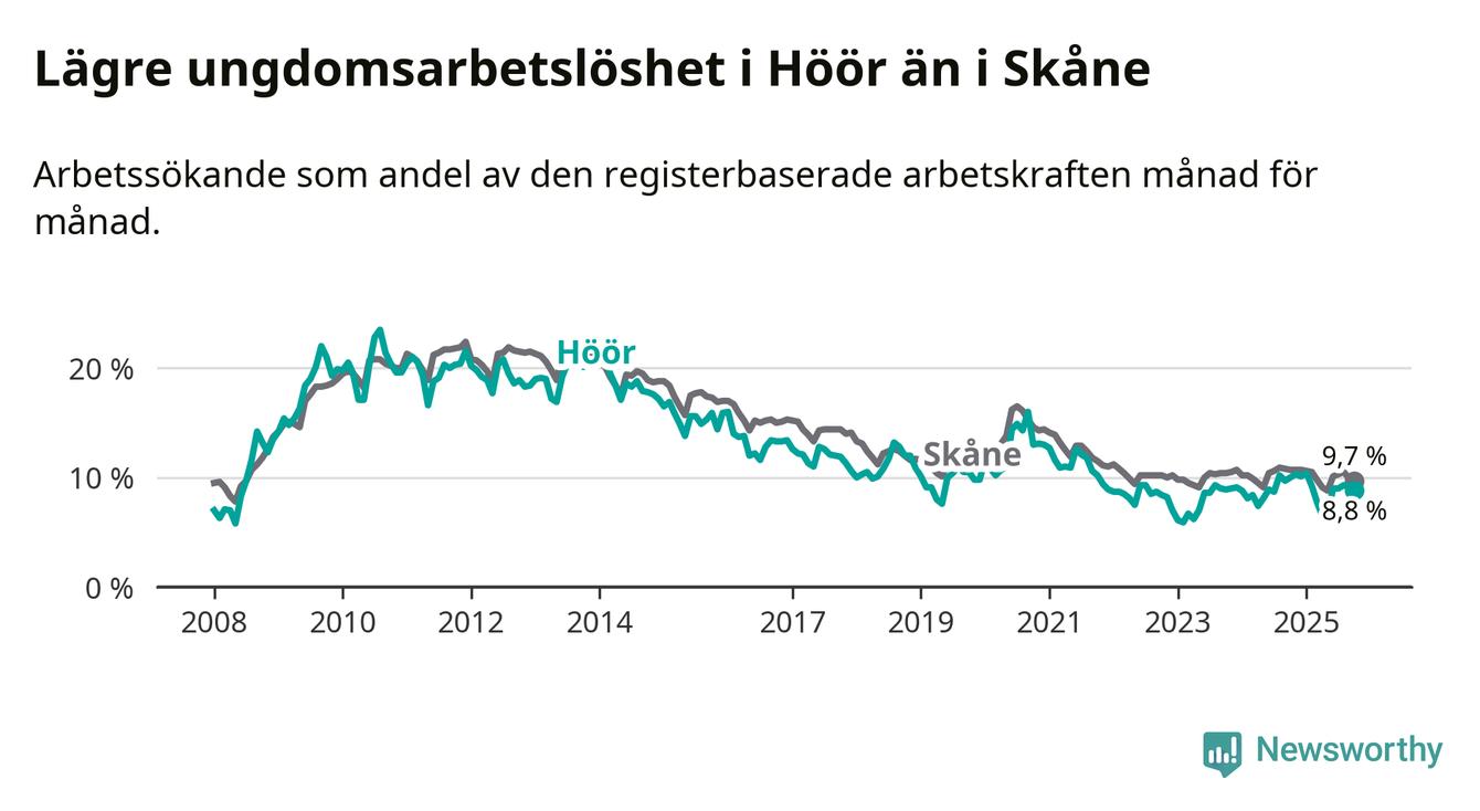 Precis som den totala arbetslösheten ligger ungdomsarbetslösheten i Höör lägre än i Skåne som helhet. Skillnaden mellan kommunen och länet är 0,9 procentenheter.