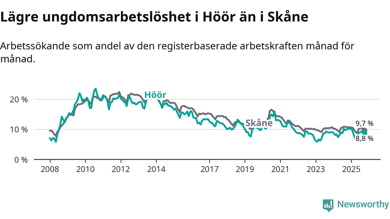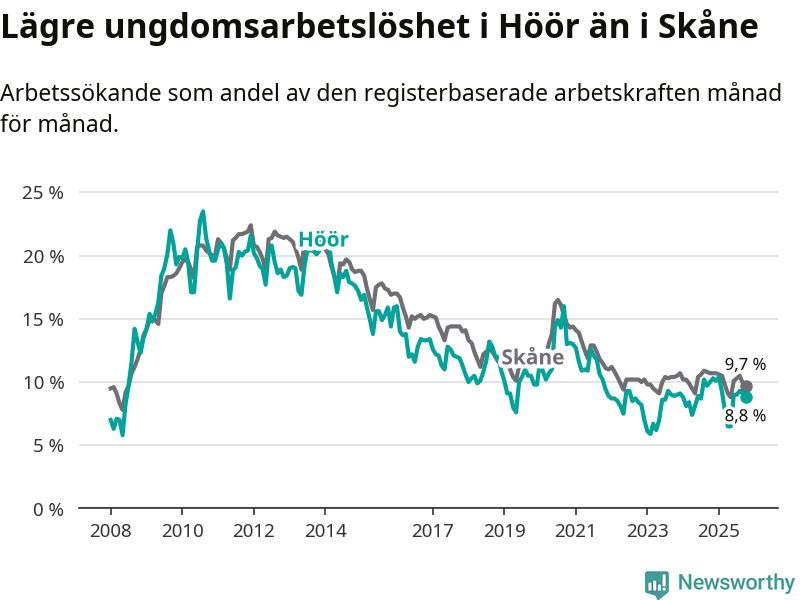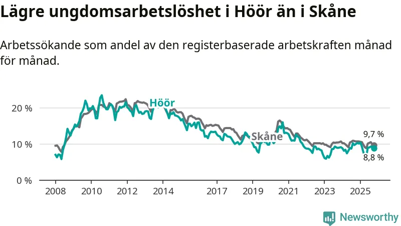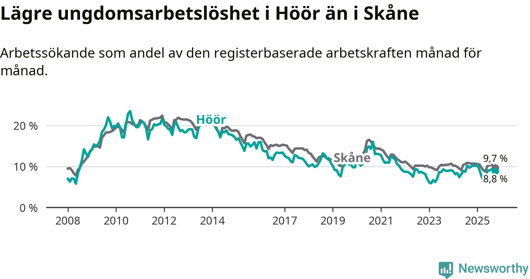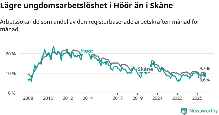 Precis som den totala arbetslösheten ligger ungdomsarbetslösheten i Höör lägre än i Skåne som helhet. Skillnaden mellan kommunen och länet är 0,9 procentenheter.