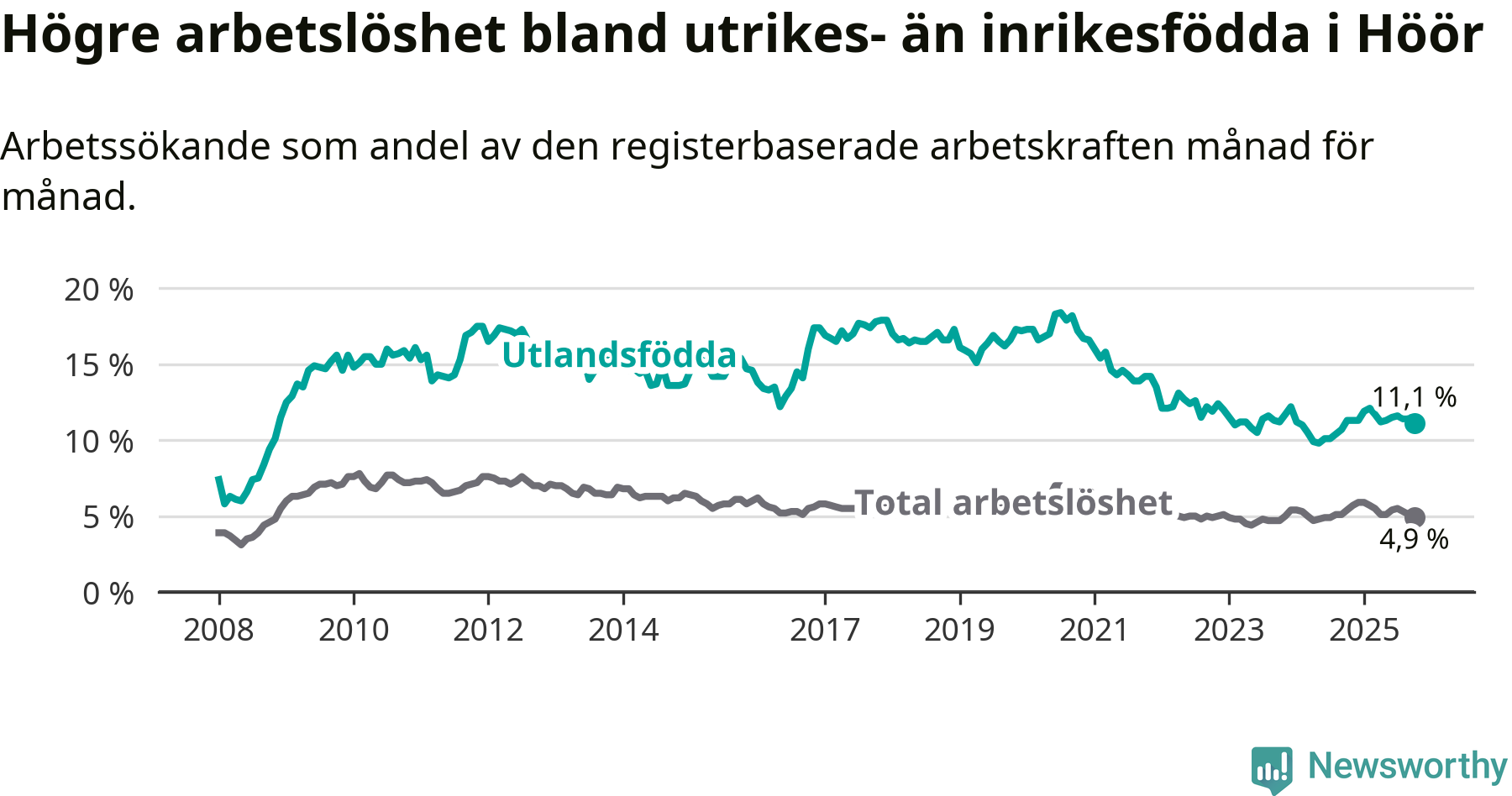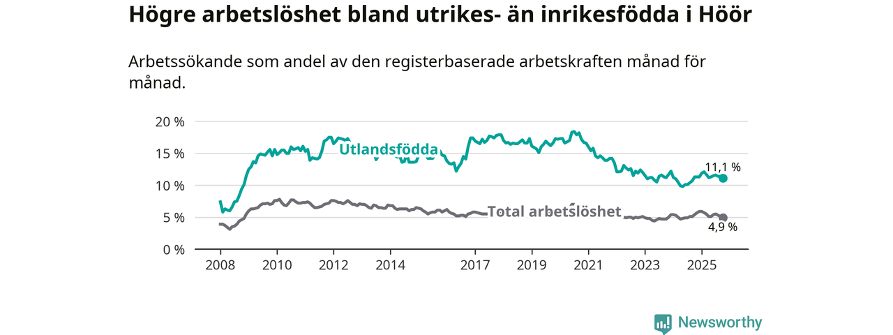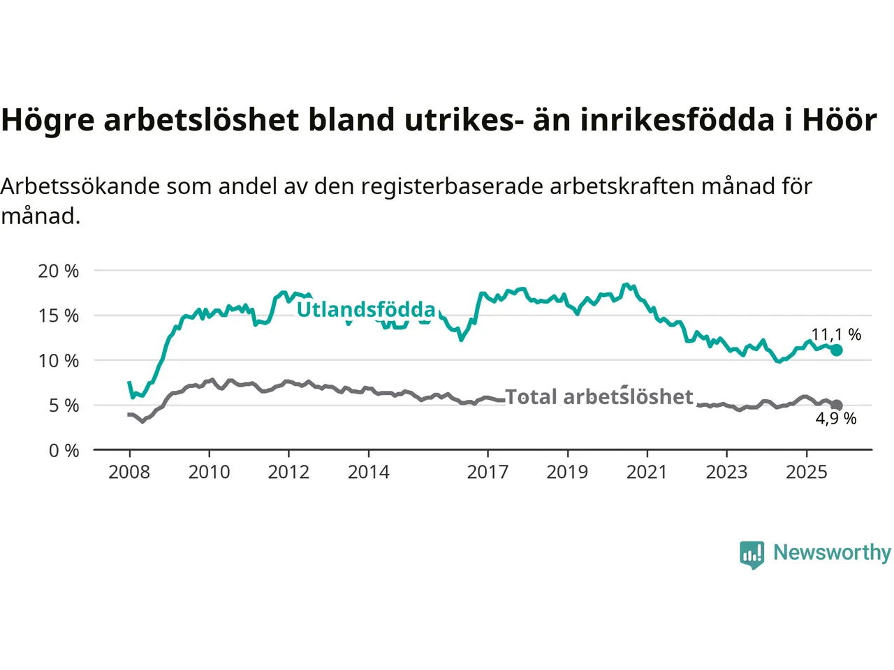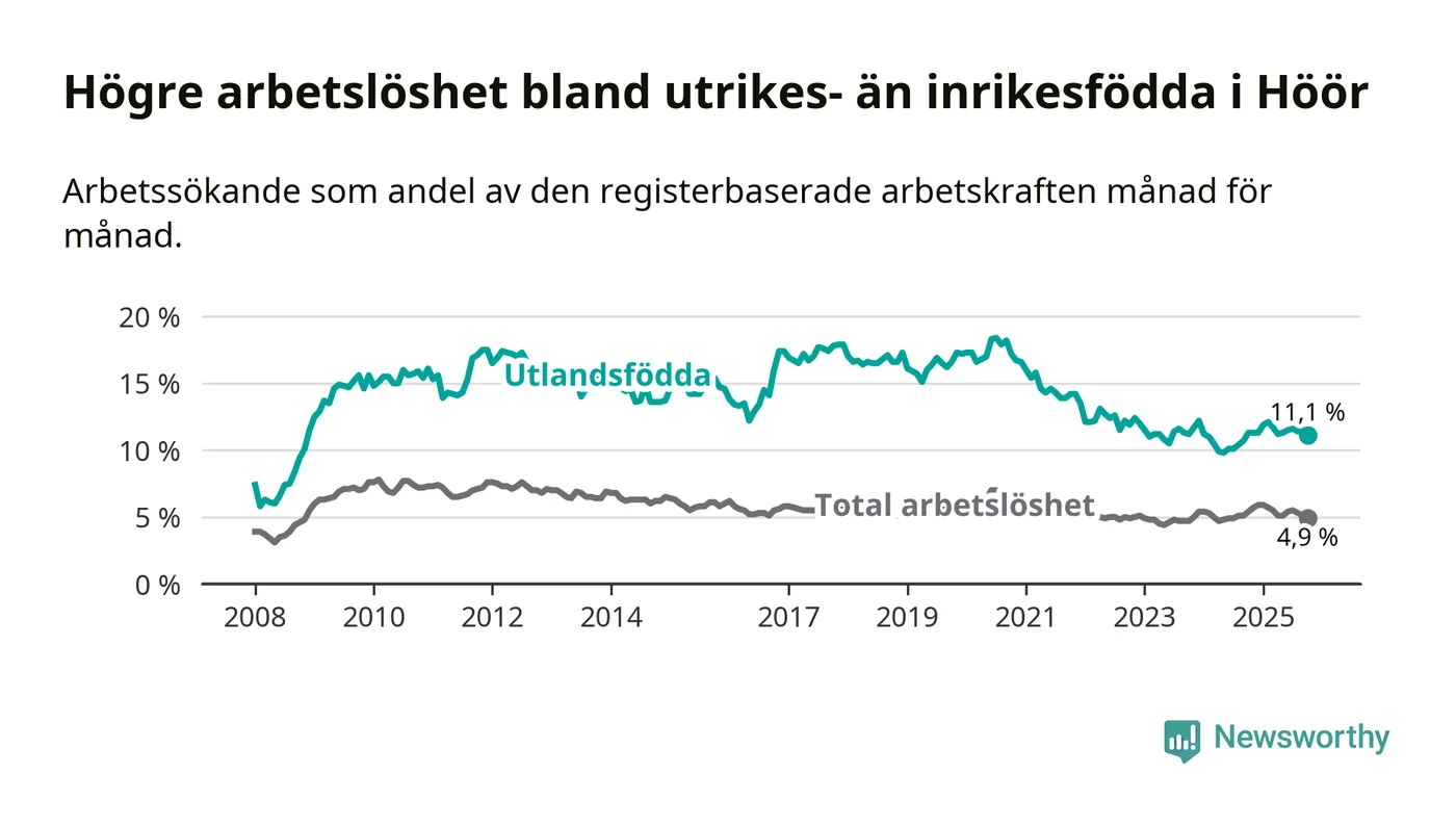 Sedan december 2024 har arbetslösheten bland utlandsfödda i Höörs kommun ökat, men i oktober vände utvecklingen då andelen arbetslösa sjönk jämfört med året innan.