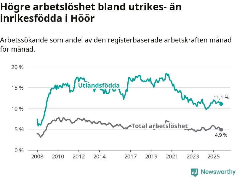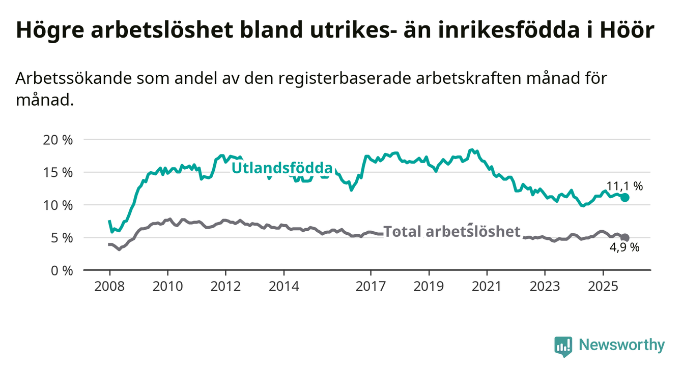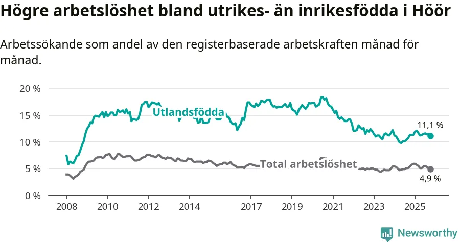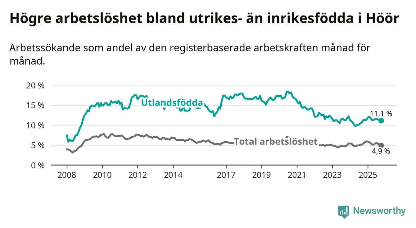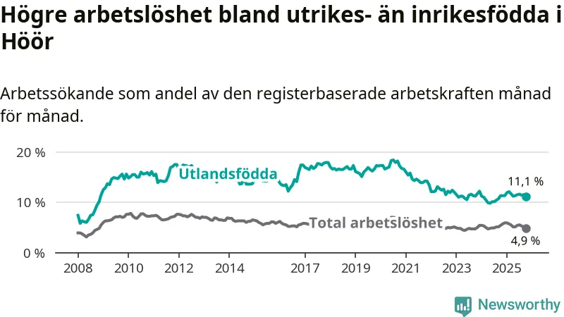 Sedan december 2024 har arbetslösheten bland utlandsfödda i Höörs kommun ökat, men i oktober vände utvecklingen då andelen arbetslösa sjönk jämfört med året innan.