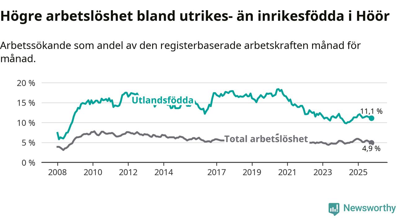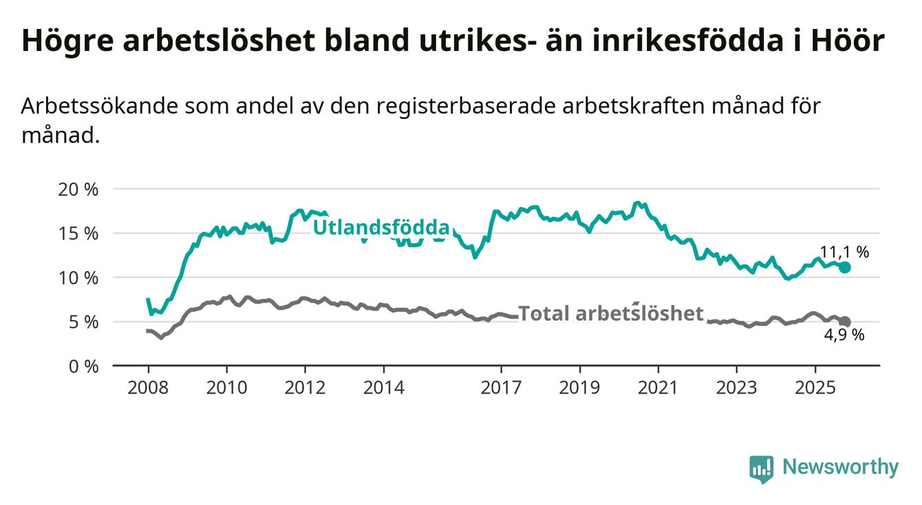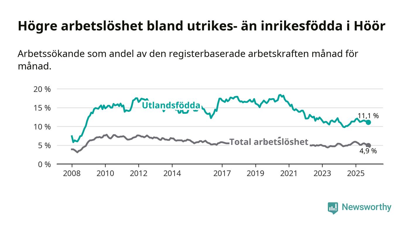 Arbetslösheten bland utlandsfödda var 11,1 procent i Höör under oktober månad, motsvarande 126 av 1 135 personer. Det är 0,2 procentenheter färre än vid samma tidpunkt i fjol (−2 om man räknar personer). Den senaste månadens nedgång innebär ett trendbrott. Under de nio föregående månaderna hade arbetslösheten bland utlandsfödda varit högre än motsvarande tidpunkt året innan.