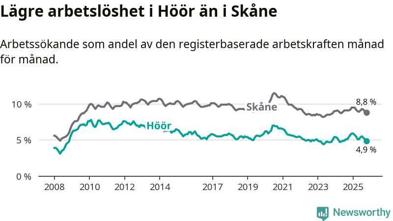 Under oktober månad rapporterade Höörs kommun en total arbetslöshet på 4,9 procent. Det är en minskning jämfört med samma tidpunkt i fjol (−0,5 procentenheter). Även i Skåne län sjunker arbetslösheten .