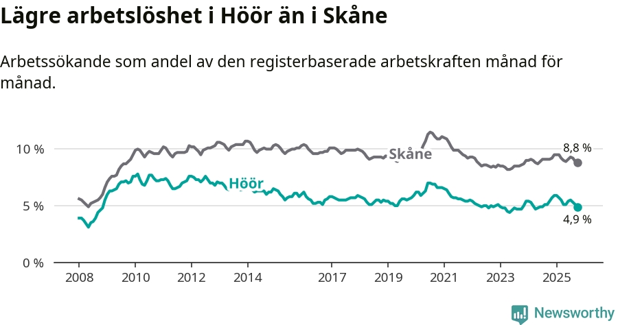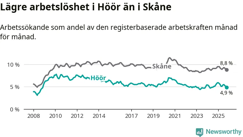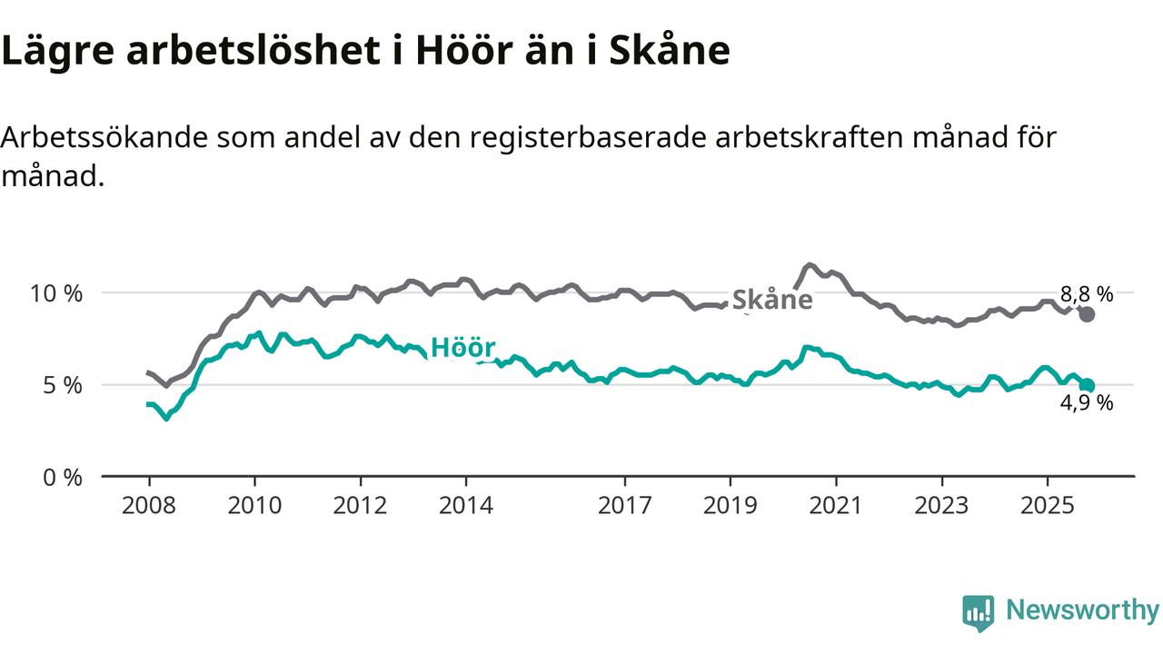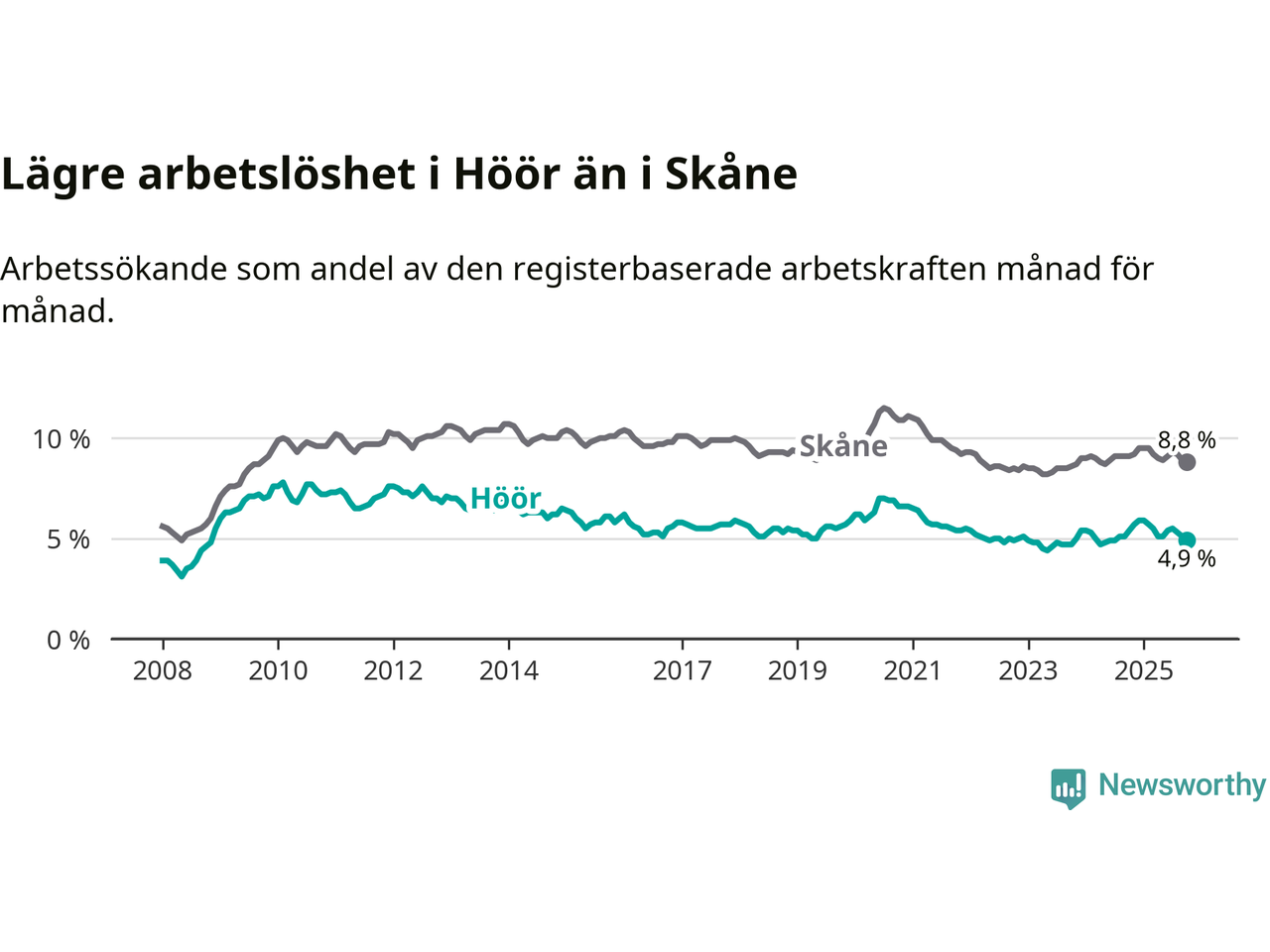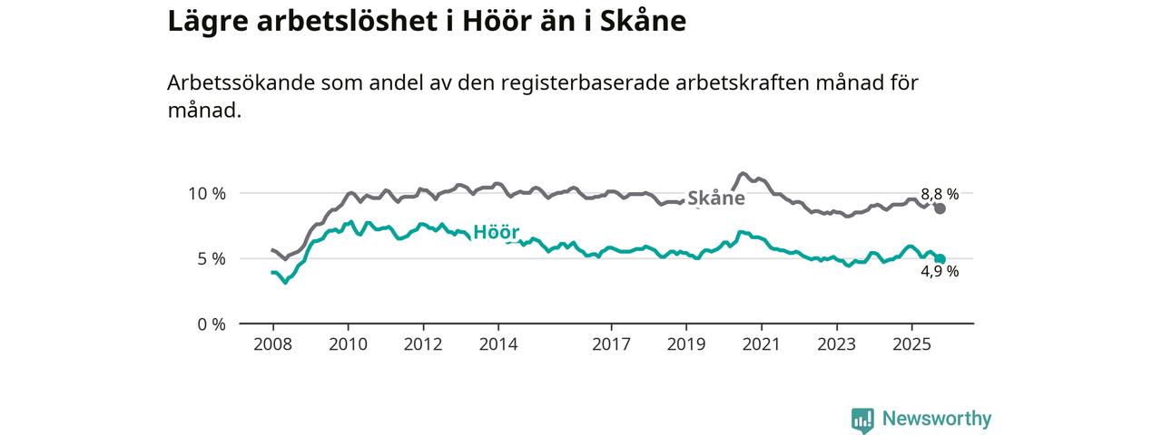 Höör hade redan tidigare lägre arbetslöshet än snittet i hela Skåne län och nu växer klyftan (4,9 procent i kommunen, jämfört med 8,8 procent i hela länet). Lomma har den lägsta arbetslösheten i länet (4,1 procent), medan Perstorp har den högsta (13,6 procent). För att Höör skulle komma ner i samma arbetslöshetsnivå som Lomma skulle 67 personer behöva sysselsättas.