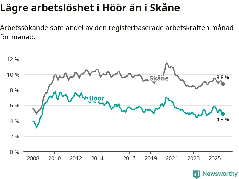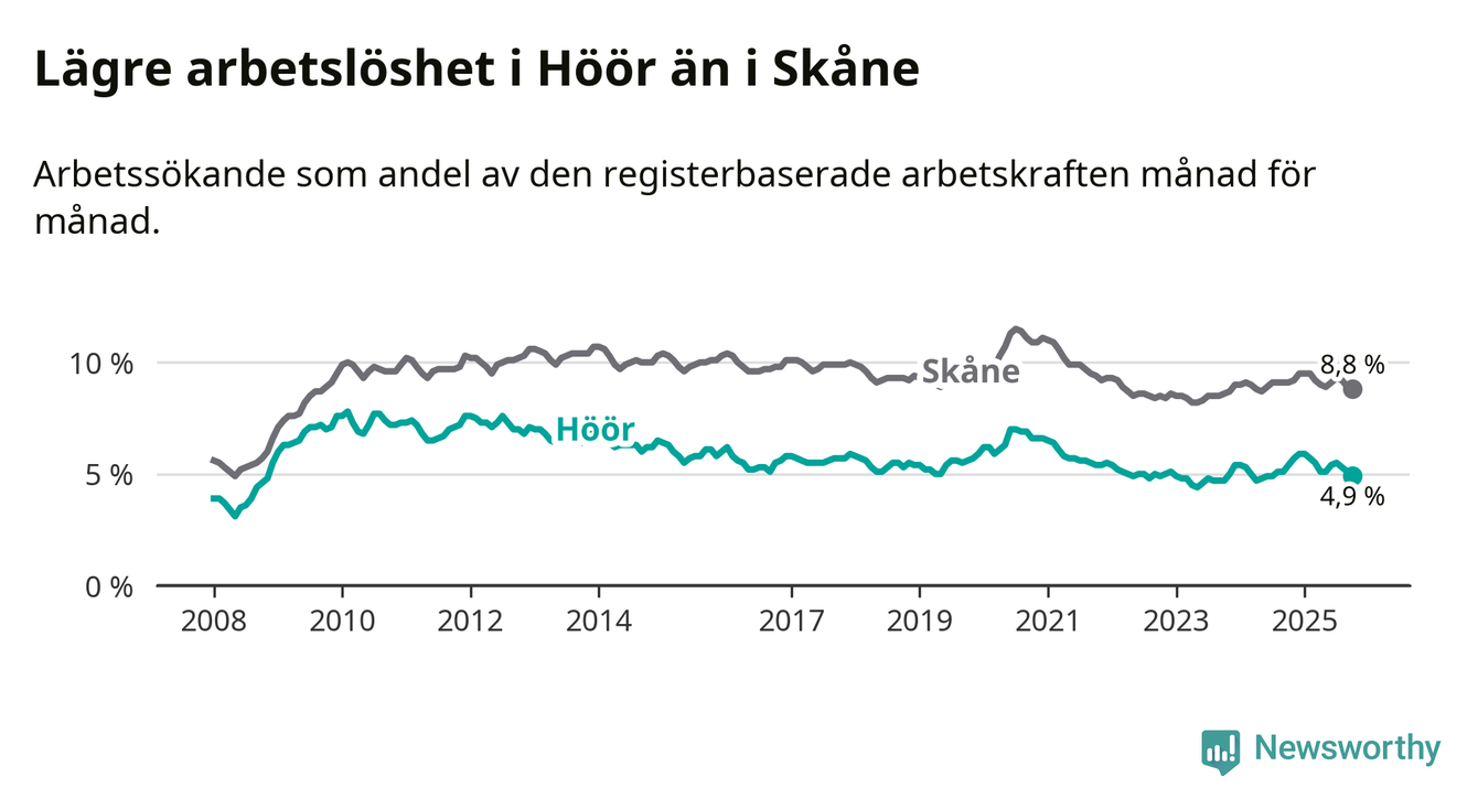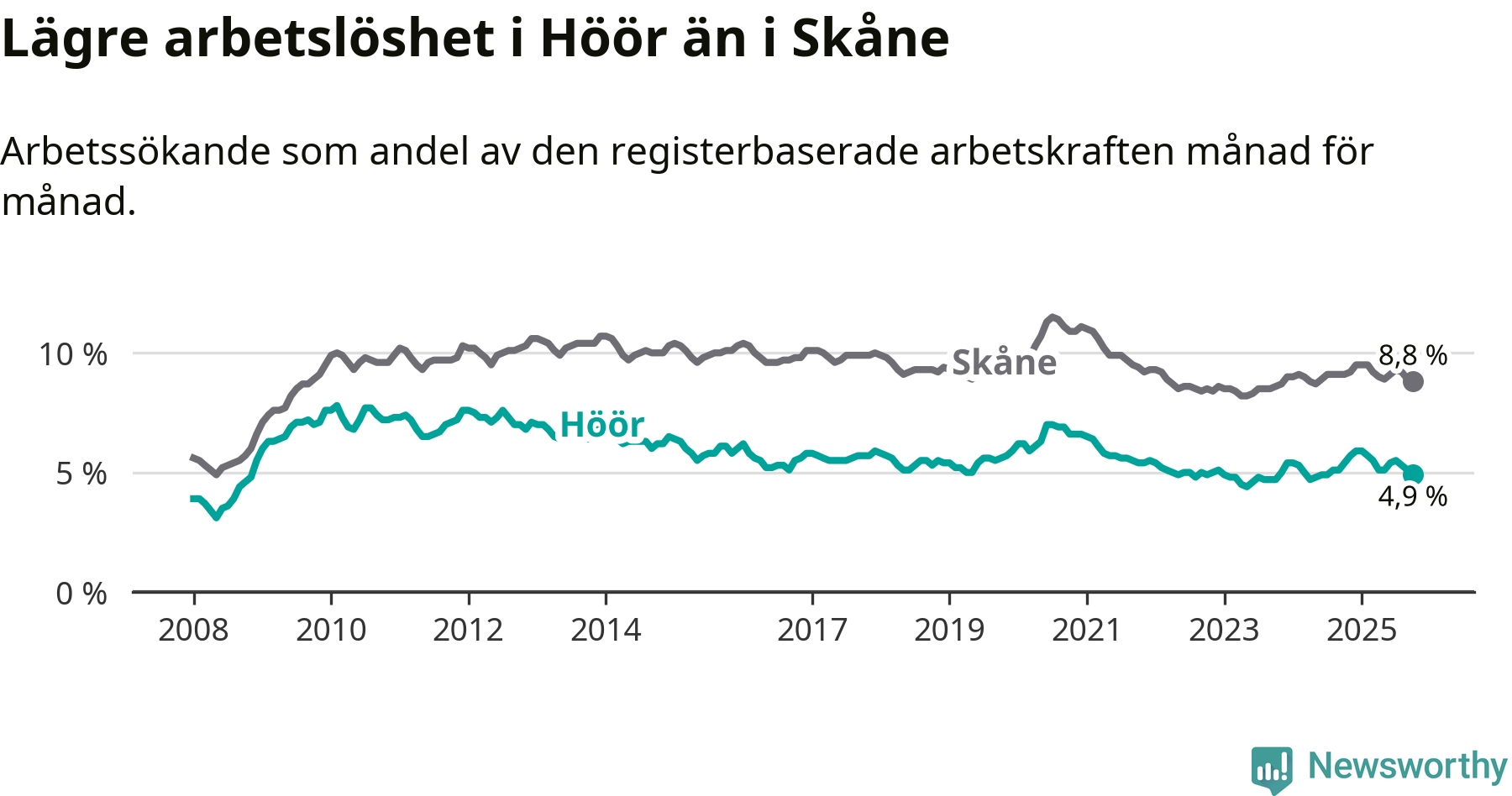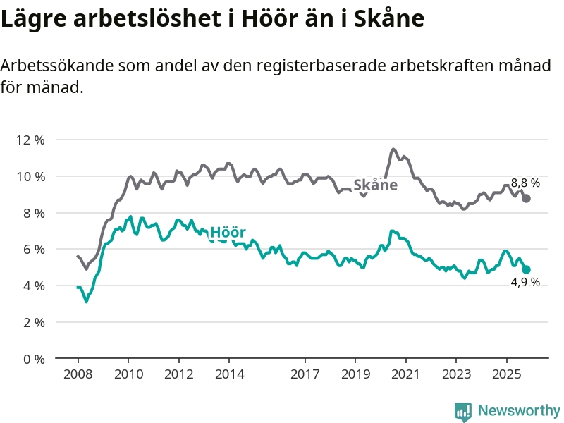 Höör hade redan tidigare lägre arbetslöshet än snittet i hela Skåne län och nu växer klyftan (4,9 procent i kommunen, jämfört med 8,8 procent i hela länet). Lomma har den lägsta arbetslösheten i länet (4,1 procent), medan Perstorp har den högsta (13,6 procent). För att Höör skulle komma ner i samma arbetslöshetsnivå som Lomma skulle 67 personer behöva sysselsättas.