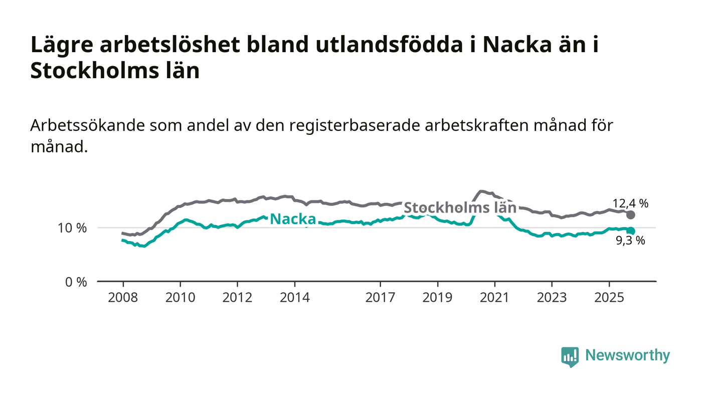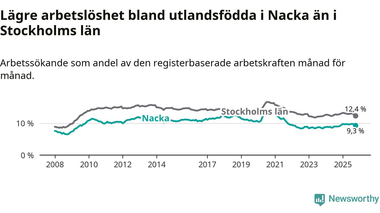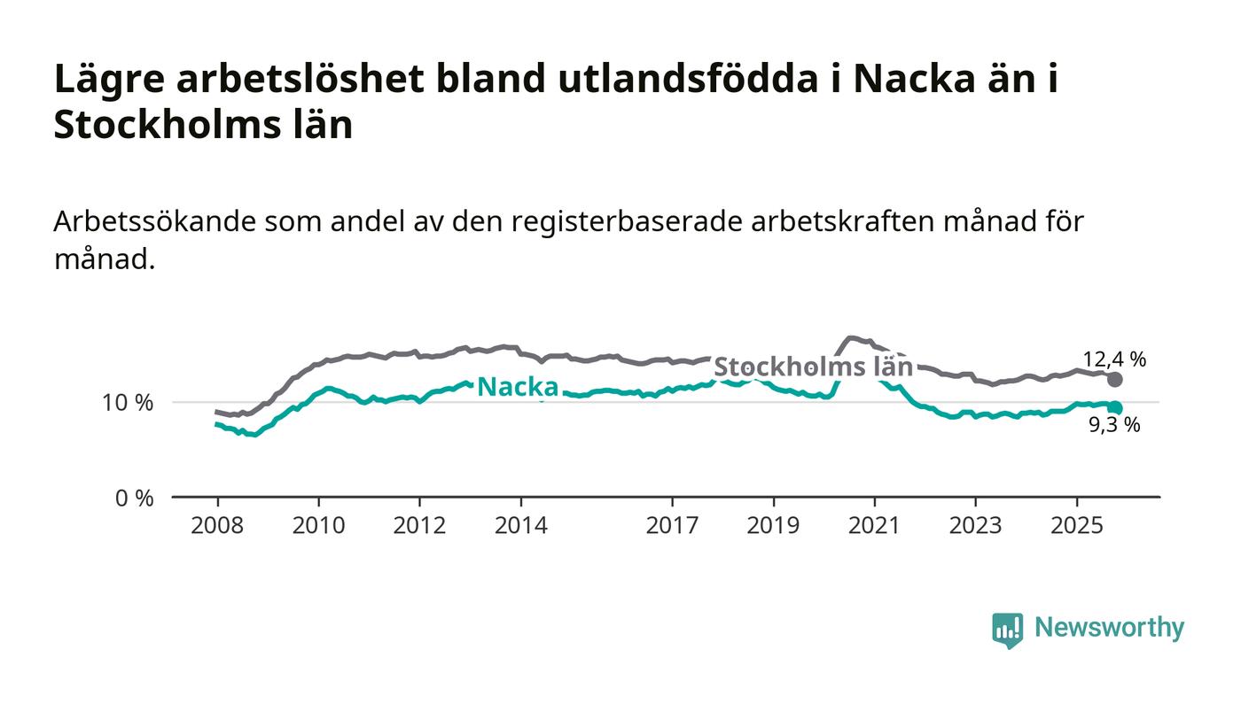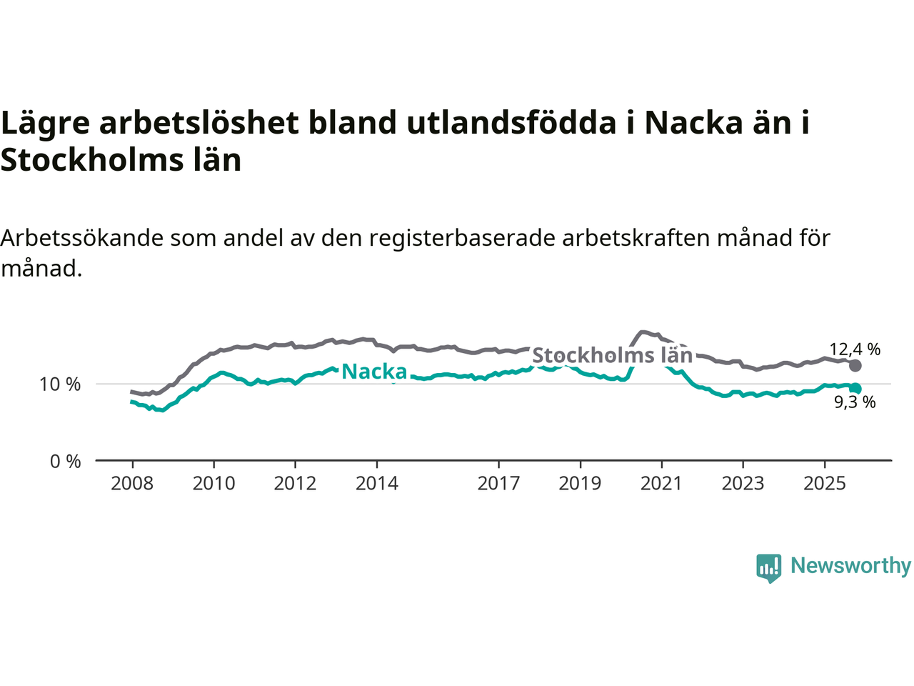 Medan arbetslösheten bland utlandsfödda alltså ökar i Nacka så minskar den i Stockholms län. Jämfört med oktober förra året har andelen arbetslösa utlandsfödda i länet minskat med 0,4 procentenheter (till 12,4 procent). Trots den senaste uppgången har Nacka med andra ord fortfarande lägre arbetslöshet bland utlandsfödda än Stockholms län.