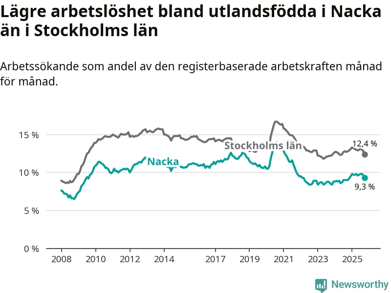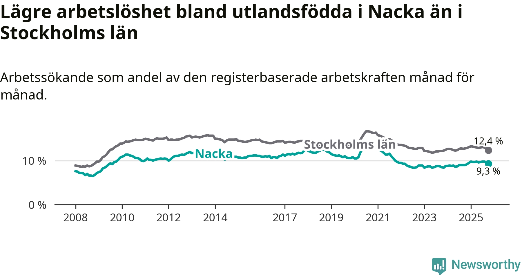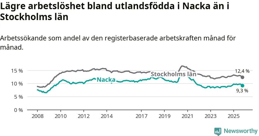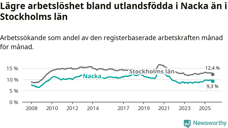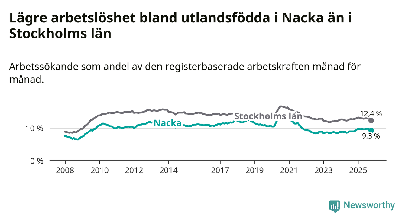 Medan arbetslösheten bland utlandsfödda alltså ökar i Nacka så minskar den i Stockholms län. Jämfört med oktober förra året har andelen arbetslösa utlandsfödda i länet minskat med 0,4 procentenheter (till 12,4 procent). Trots den senaste uppgången har Nacka med andra ord fortfarande lägre arbetslöshet bland utlandsfödda än Stockholms län.