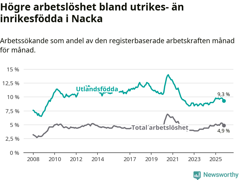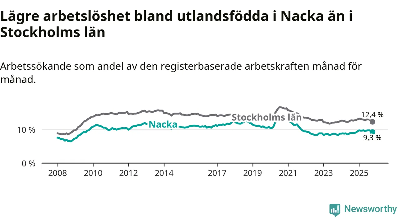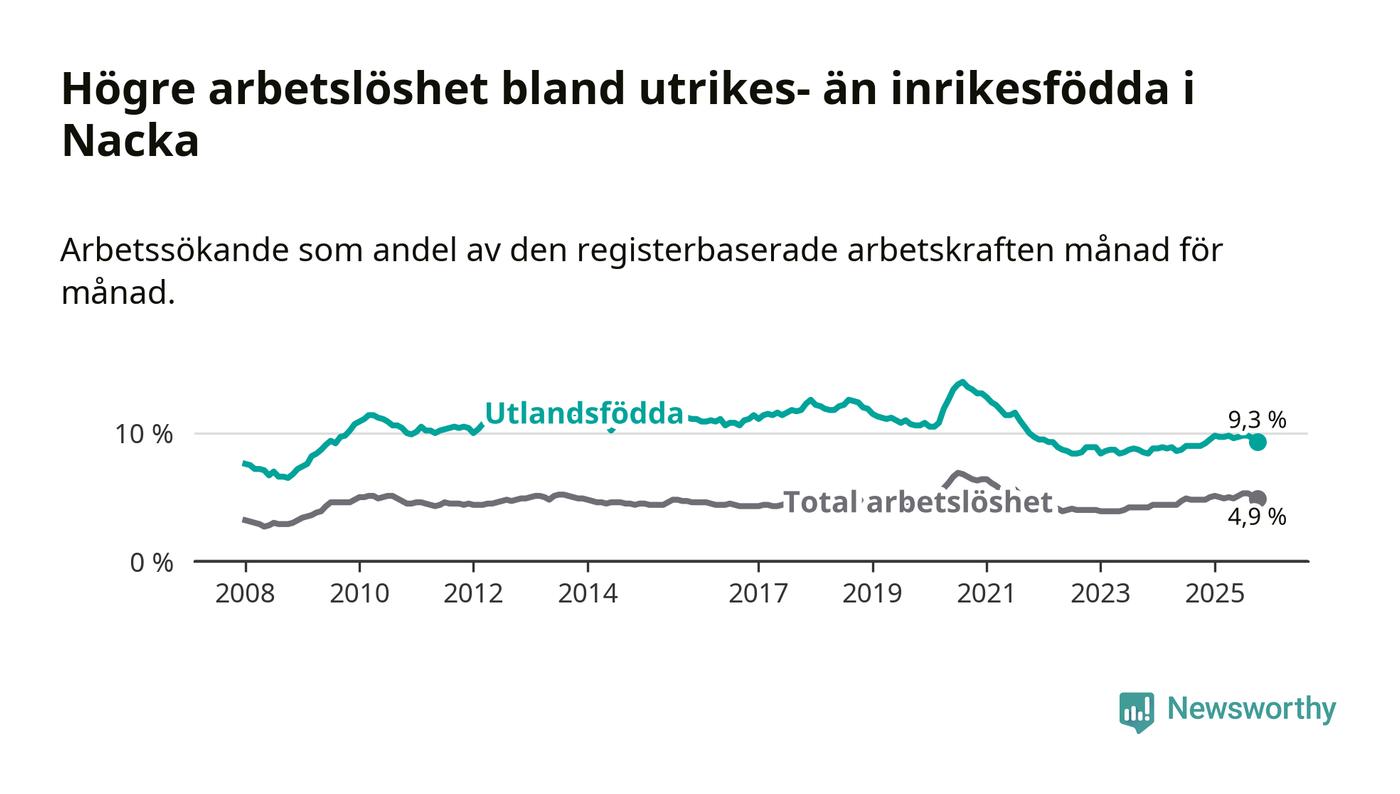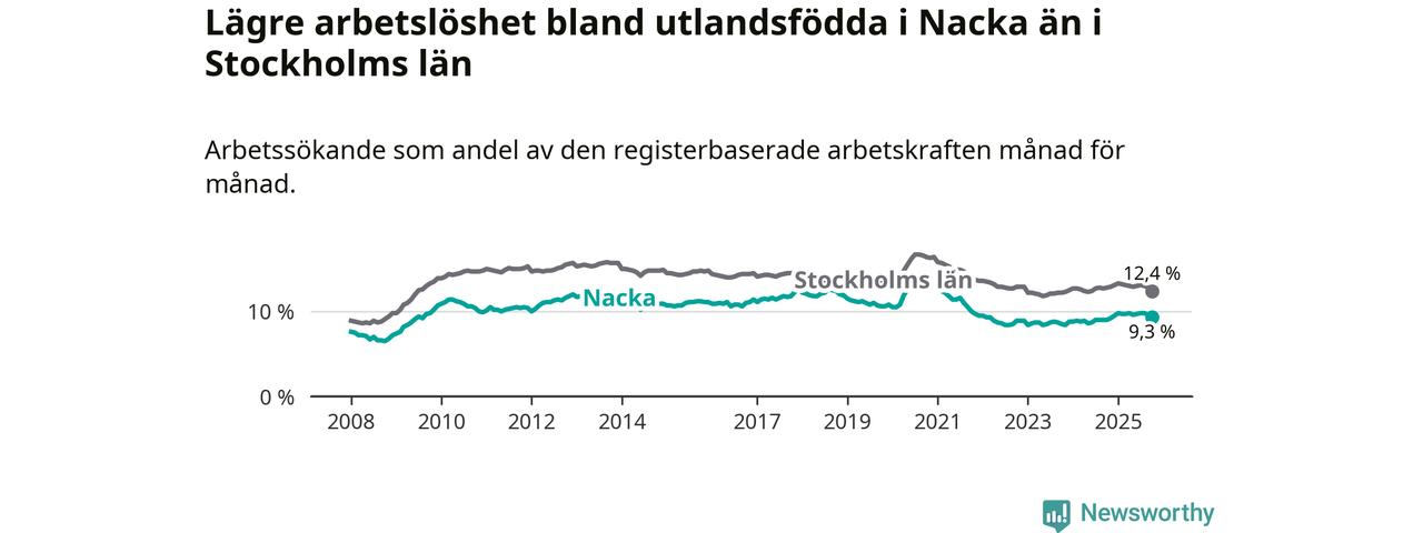 Graf: Arbetslöshet bland utrikesfödda i Nacka kommun och Stockholms län