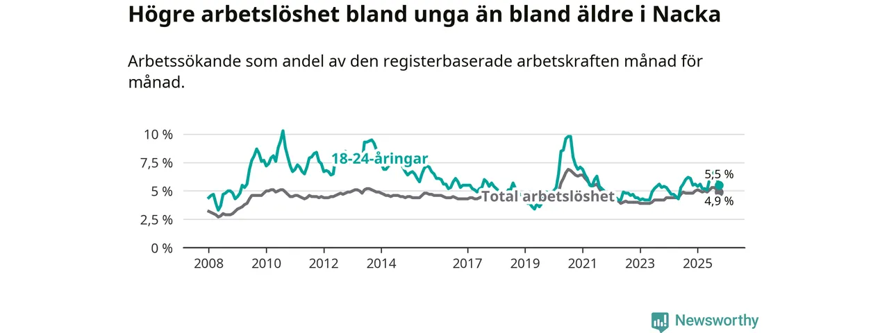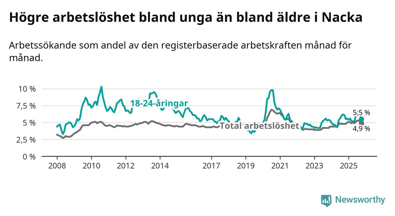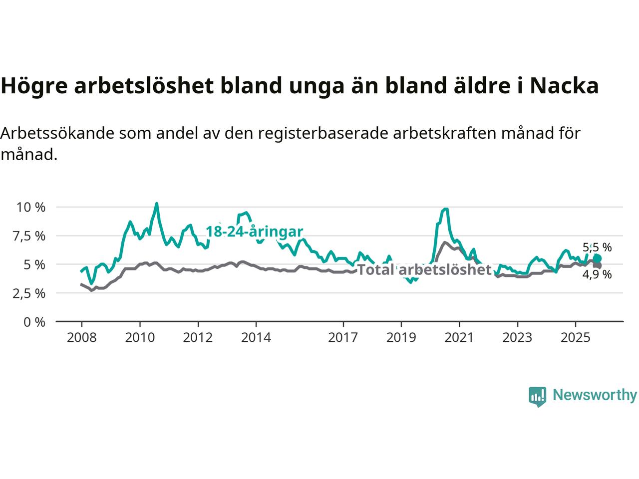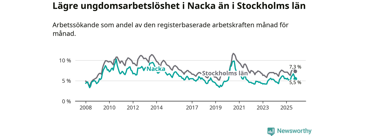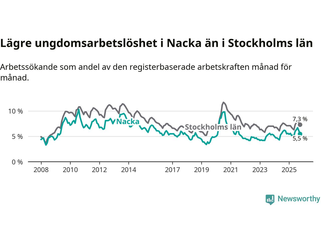 Graf: Arbetslöshet bland unga i Nacka kommun och Stockholms län