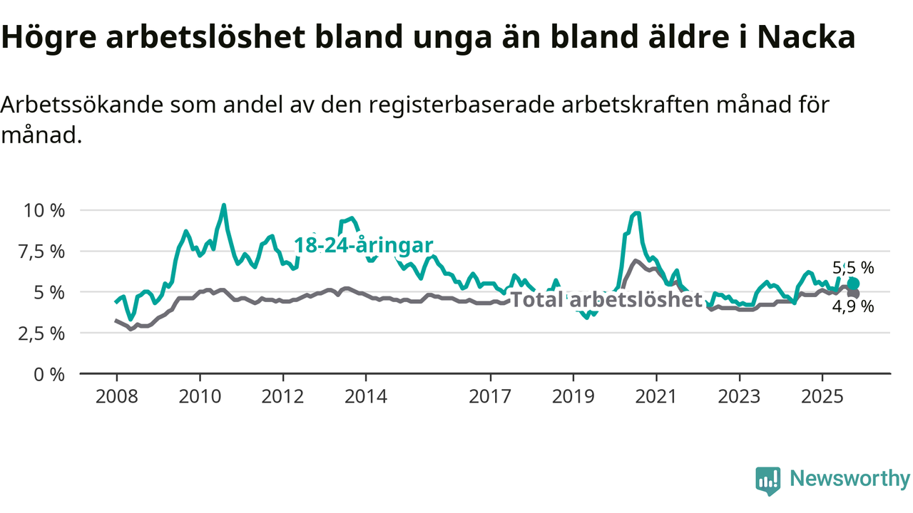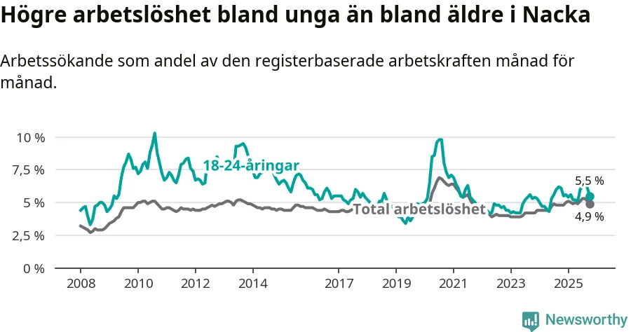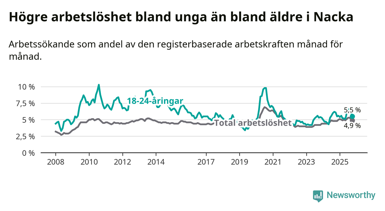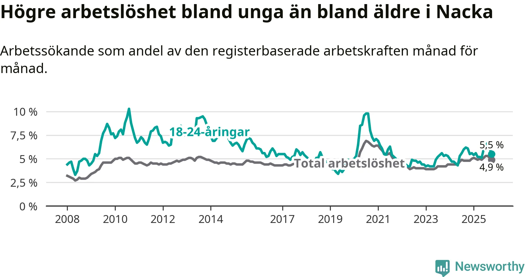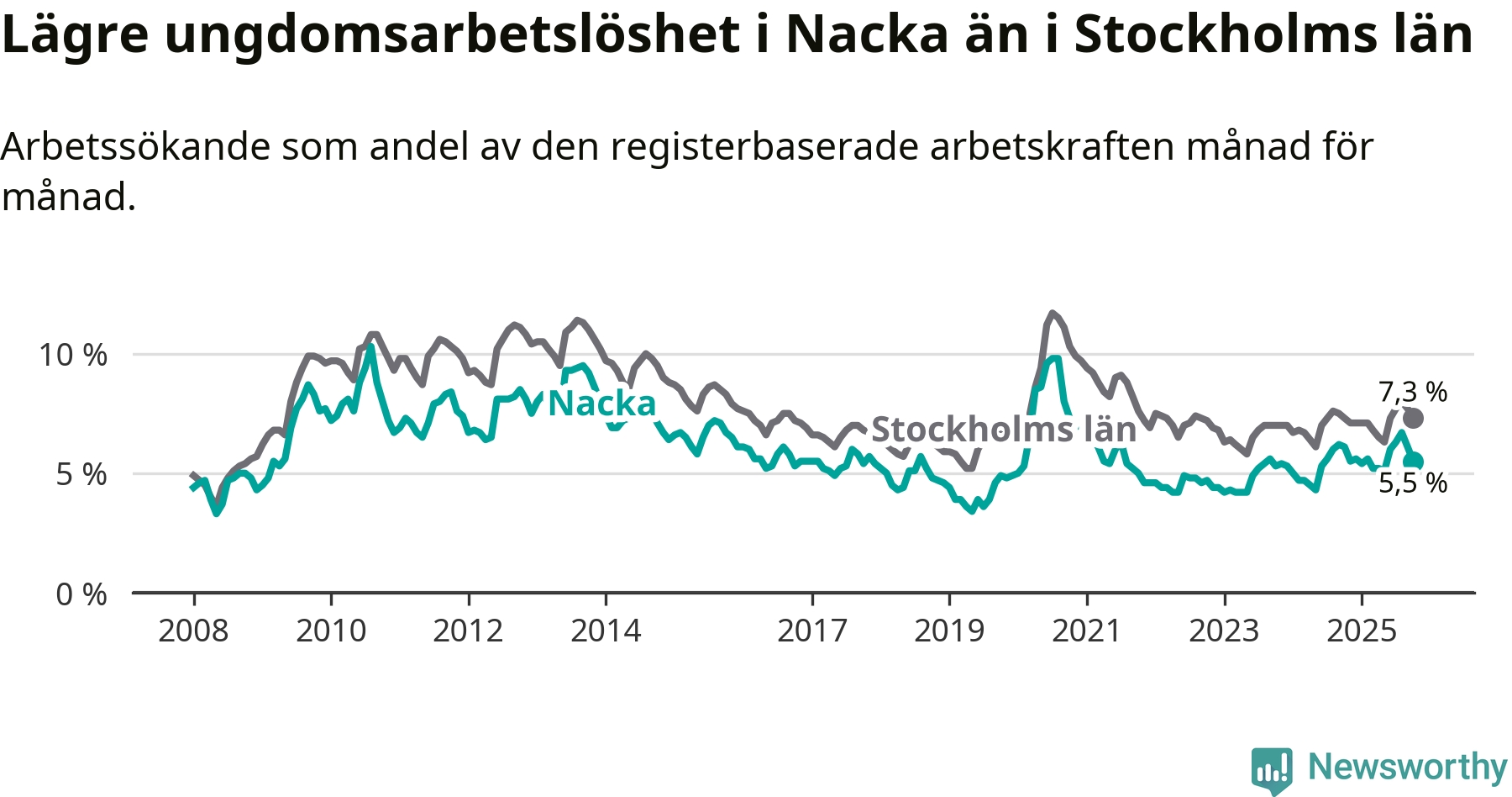 Graf: Arbetslöshet bland unga i Nacka kommun och Stockholms län