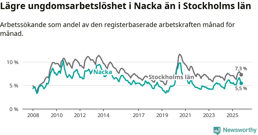 Precis som den totala arbetslösheten ligger ungdomsarbetslösheten i Nacka lägre än i Stockholms län som helhet. Skillnaden mellan kommunen och länet är 1,8 procentenheter.