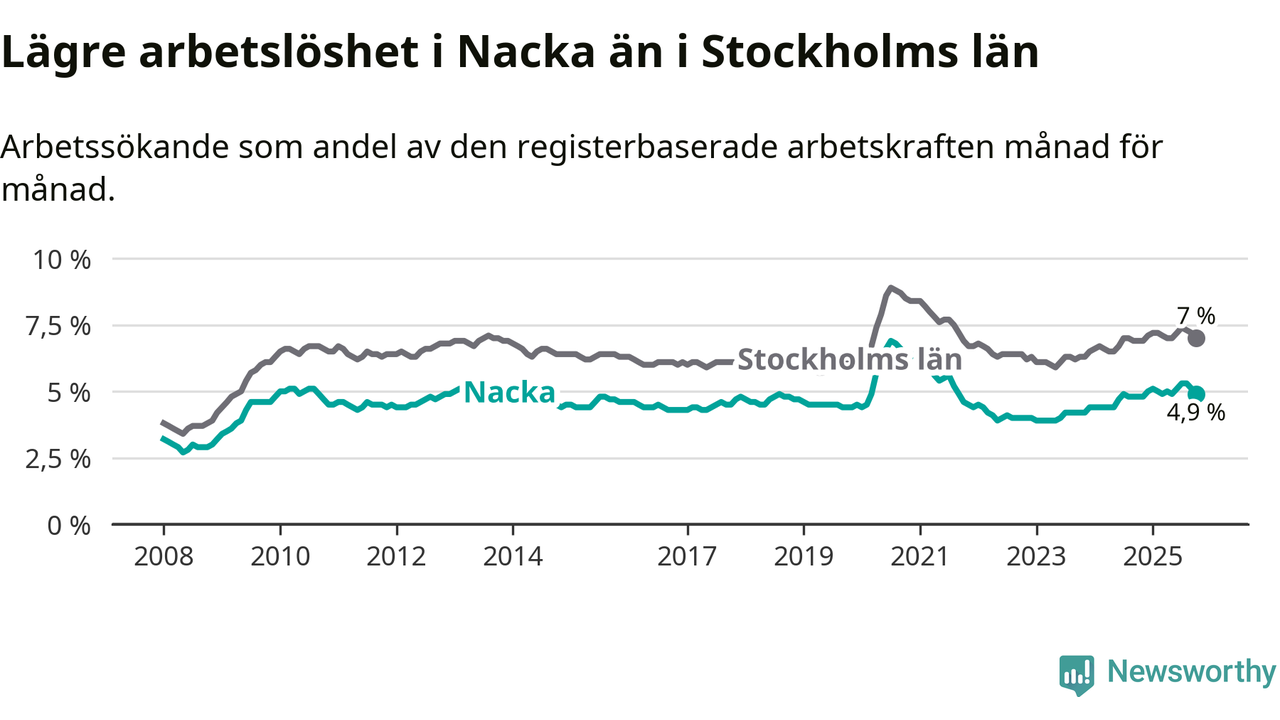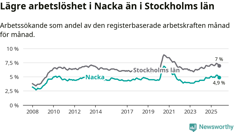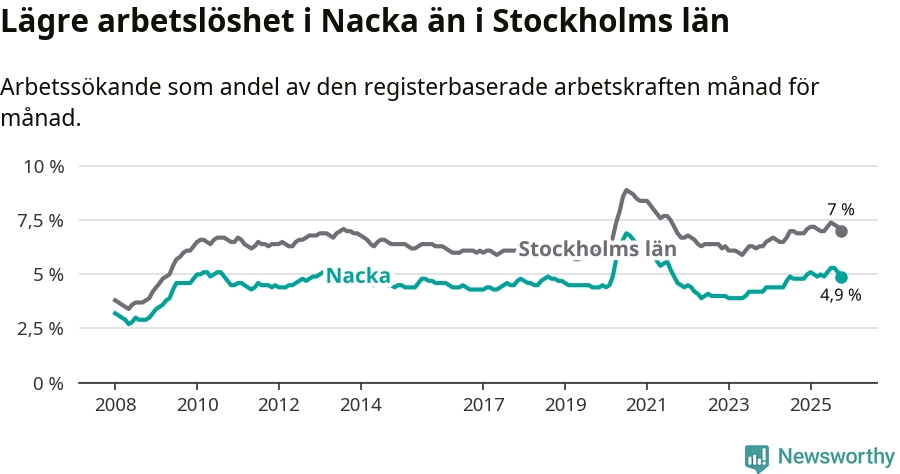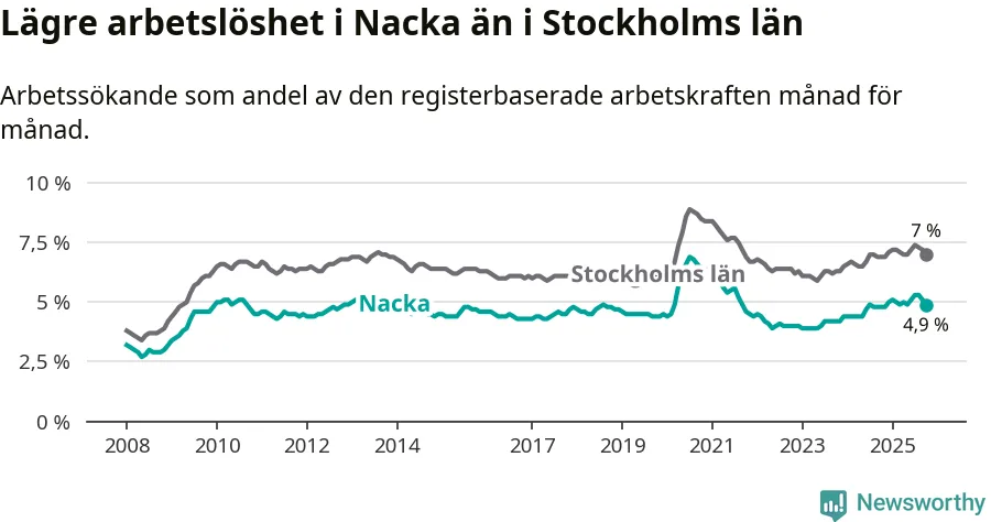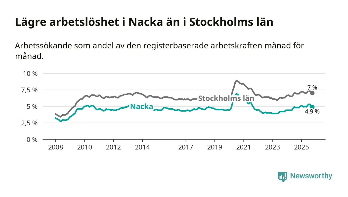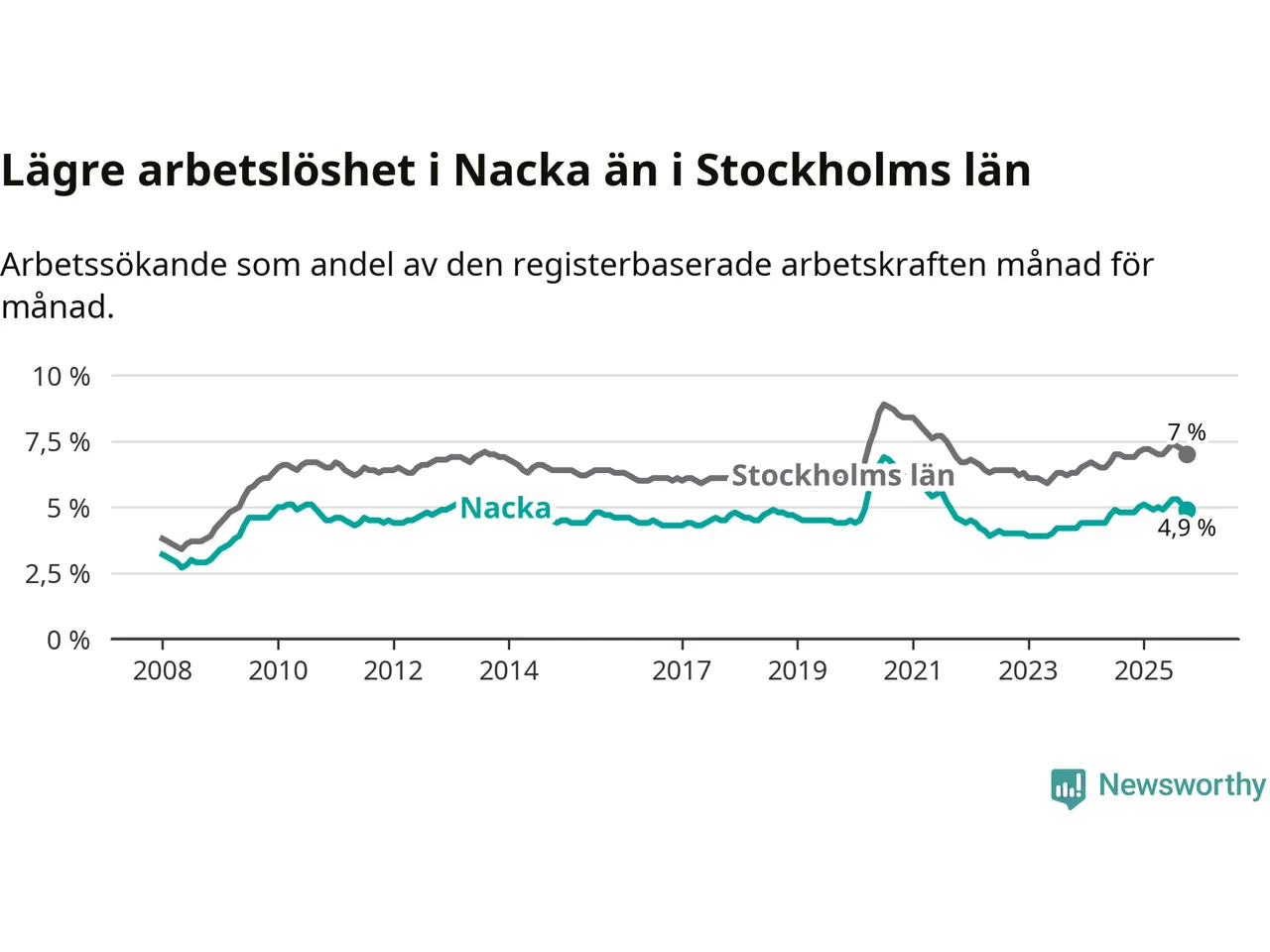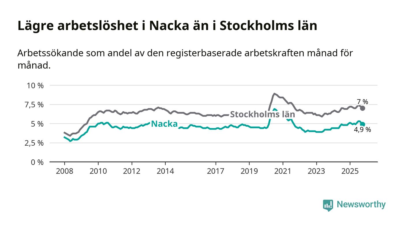 Även om arbetslösheten i Nacka alltså ökar, så ligger den fortfarande under snittet i hela Stockholms län (4,9 procent i kommunen, jämfört med 7,0 procent i hela länet). Vaxholm och Värmdö har den lägsta arbetslösheten i länet (3,9 procent), medan Södertälje har den högsta (10,9 procent). För att Nacka skulle komma ner i samma arbetslöshetsnivå som Vaxholm och Värmdö skulle 574 personer behöva sysselsättas.