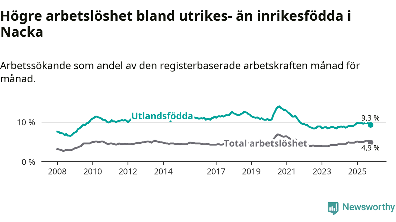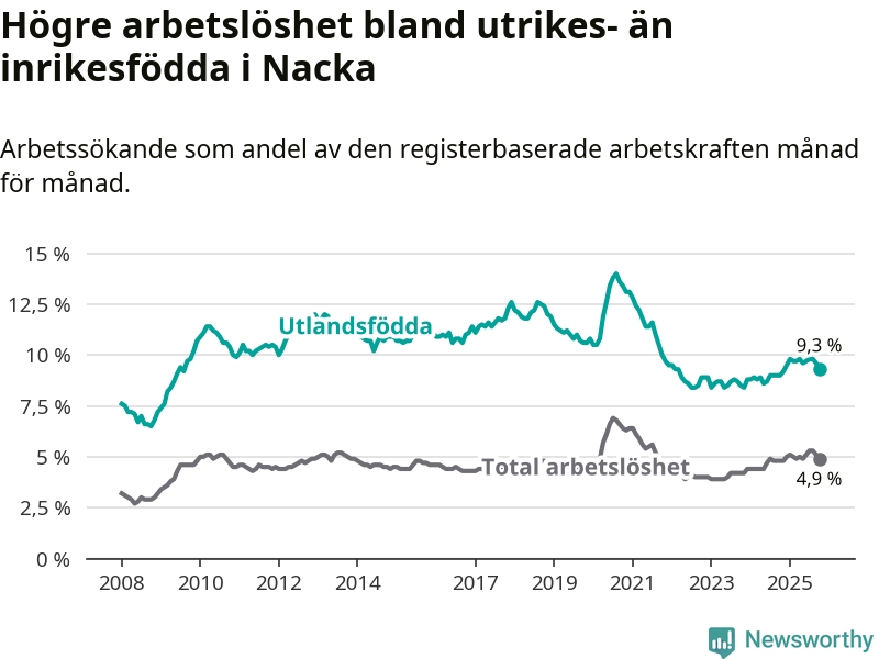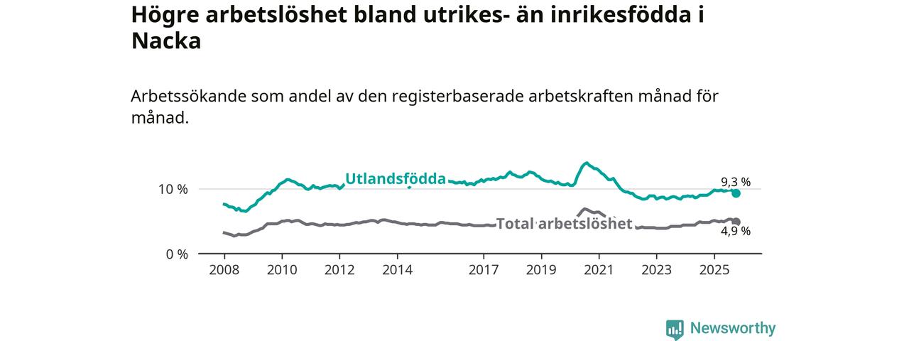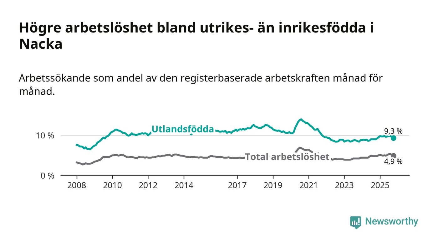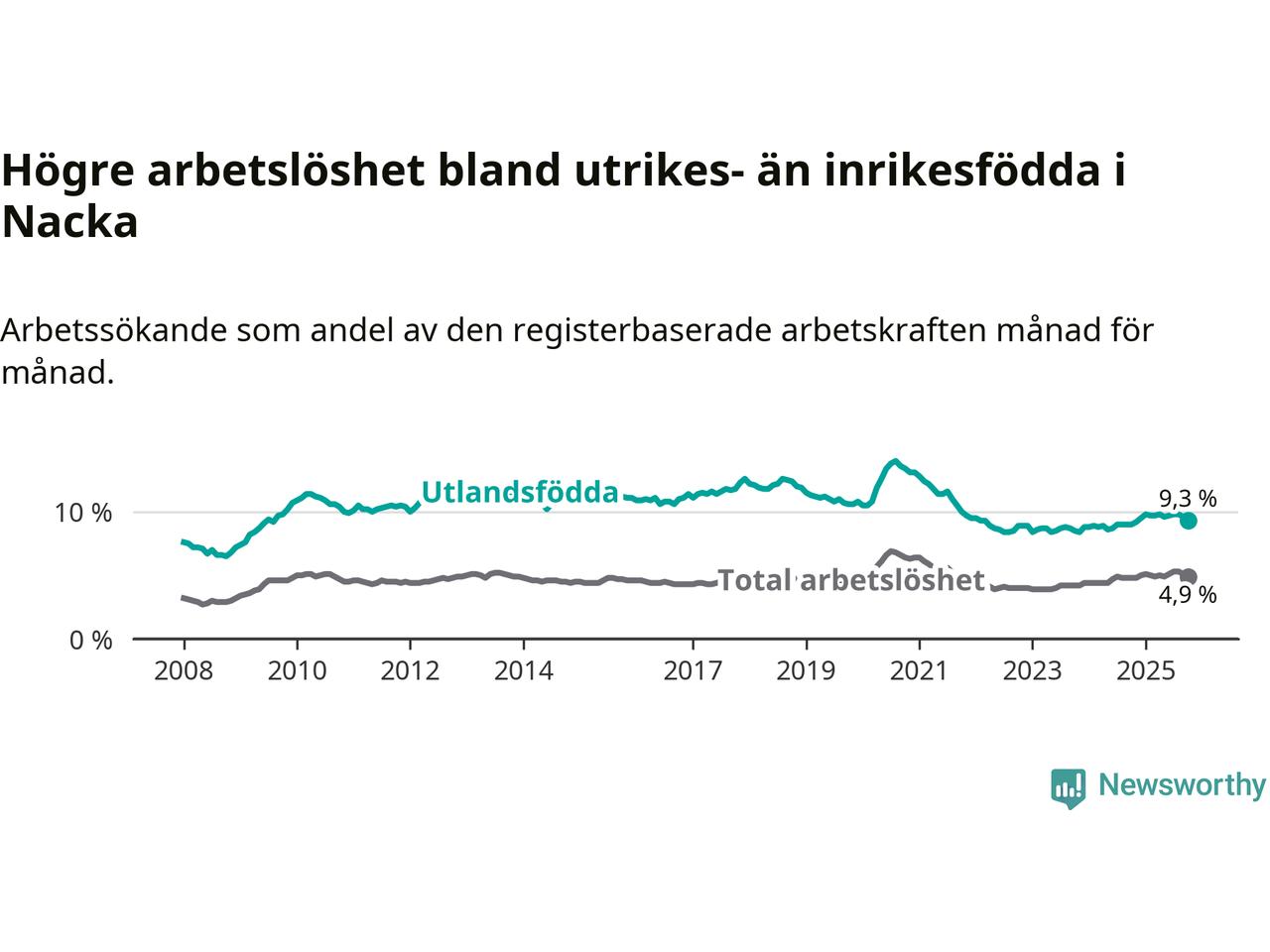 Arbetslösheten bland utlandsfödda var 9,3 procent i Nacka under oktober månad, motsvarande 1 256 av 13 505 personer. Det är 0,3 procentenheter fler än vid samma tidpunkt i fjol (+57 om man räknar personer). Därmed är de utlandsföddas arbetslöshet högre än vid samma tidpunkt i fjol för 22:a månaden i följd.