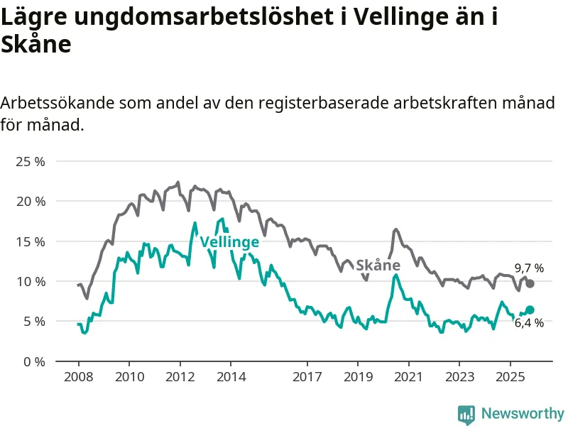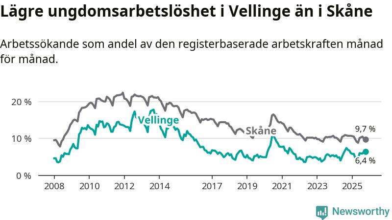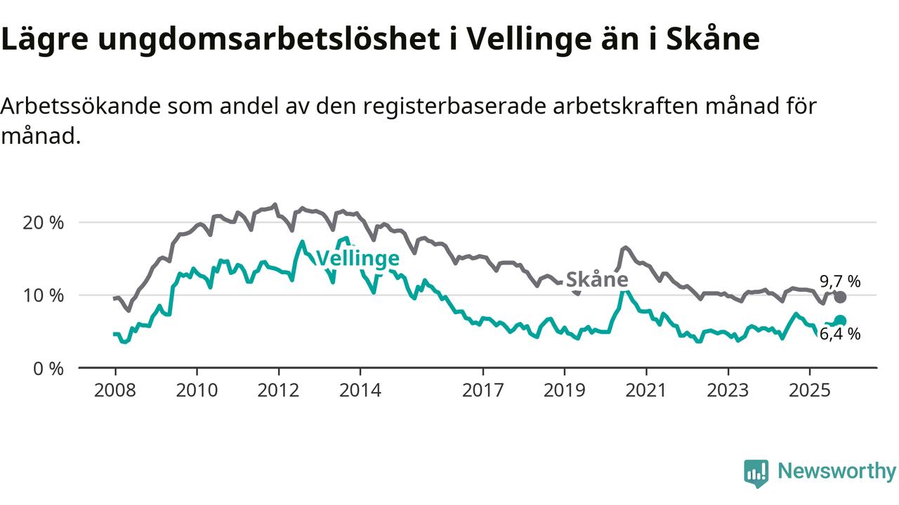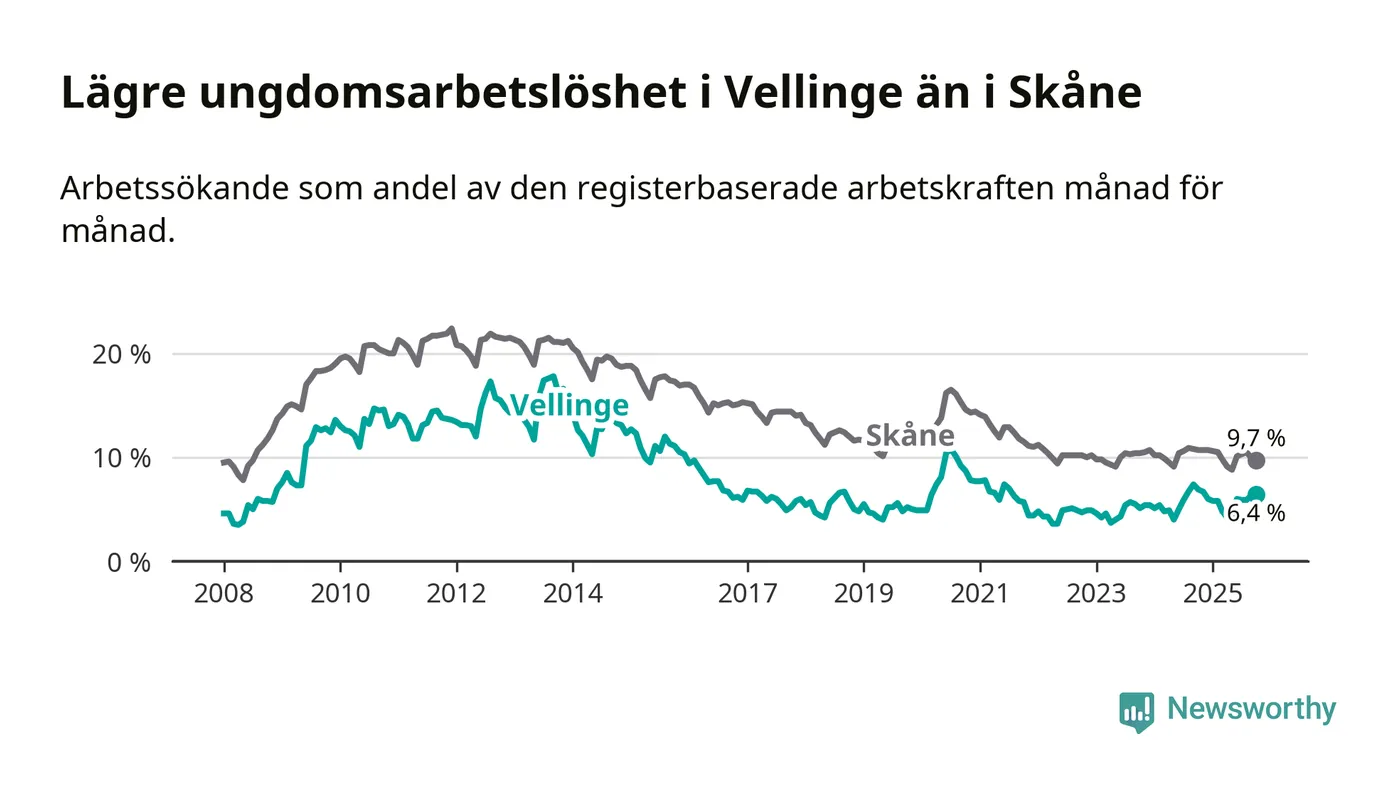 Precis som den totala arbetslösheten ligger ungdomsarbetslösheten i Vellinge lägre än i Skåne som helhet. Skillnaden mellan kommunen och länet är 3,3 procentenheter.