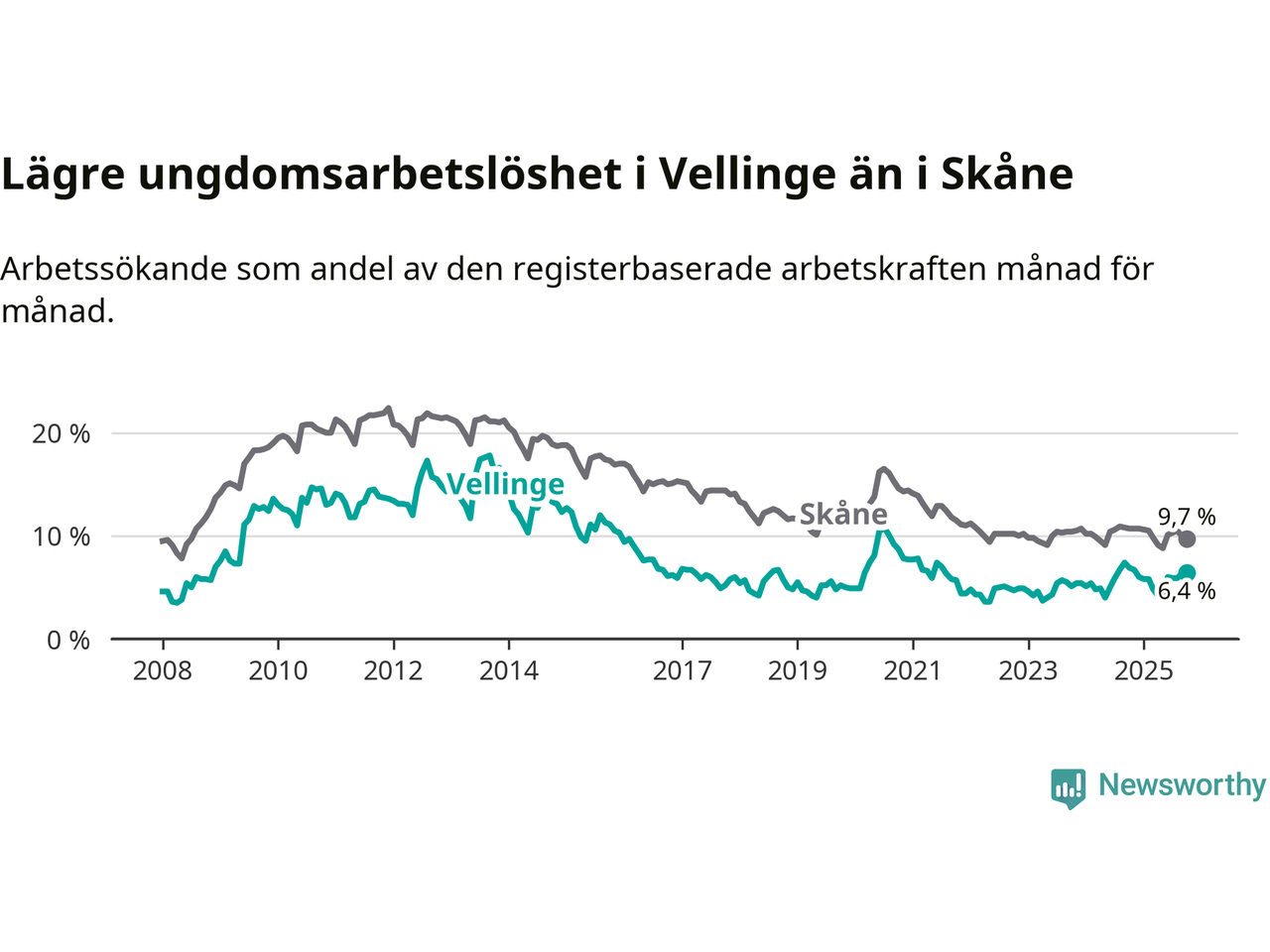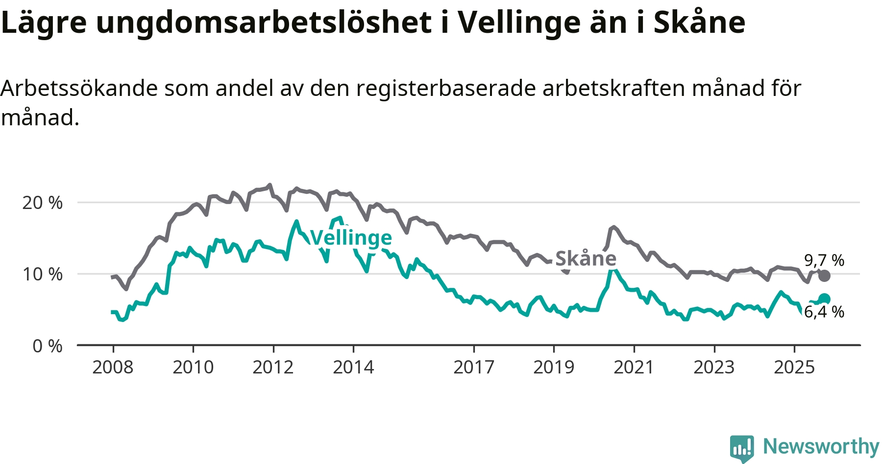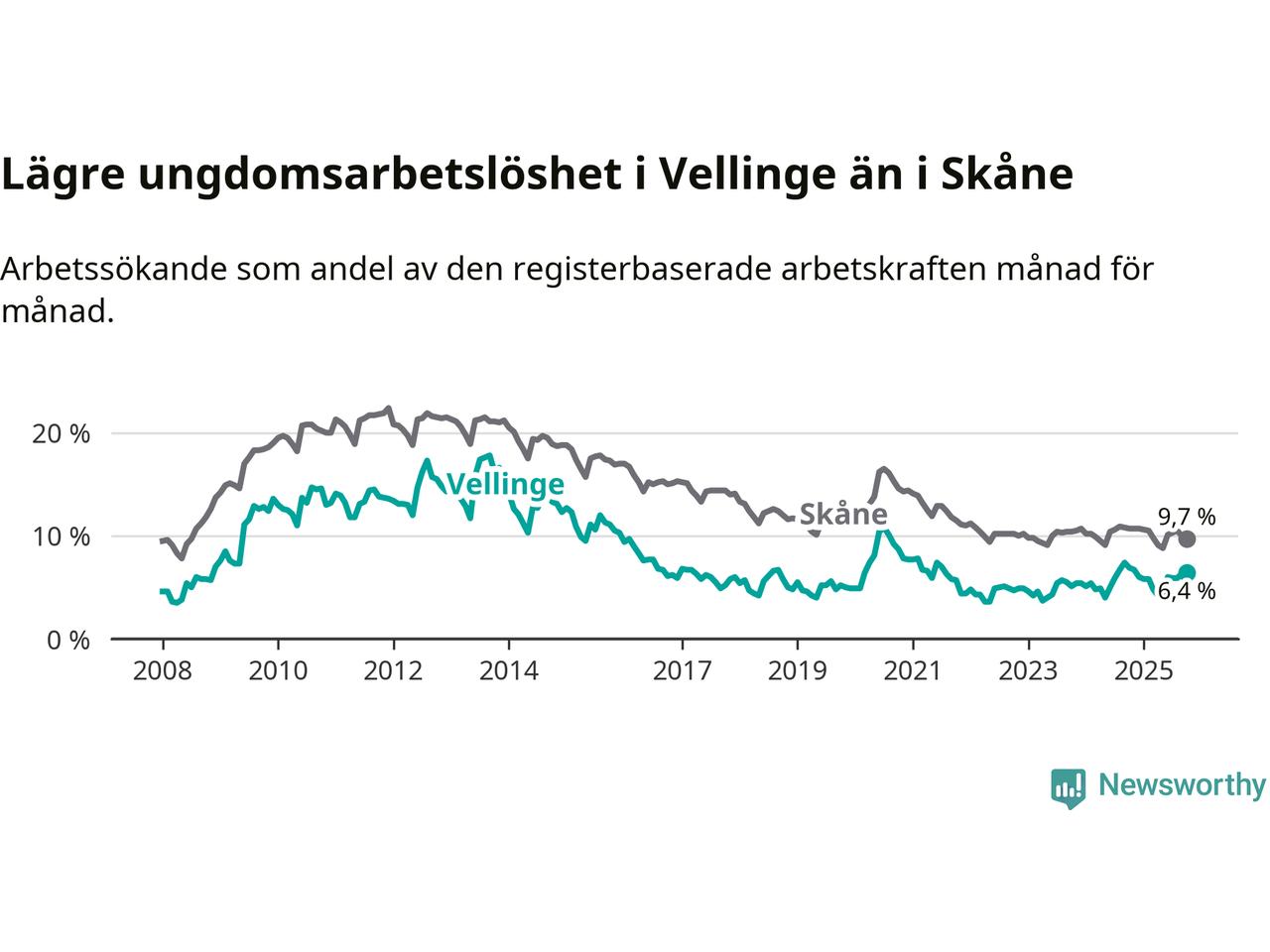 Precis som den totala arbetslösheten ligger ungdomsarbetslösheten i Vellinge lägre än i Skåne som helhet. Skillnaden mellan kommunen och länet är 3,3 procentenheter.