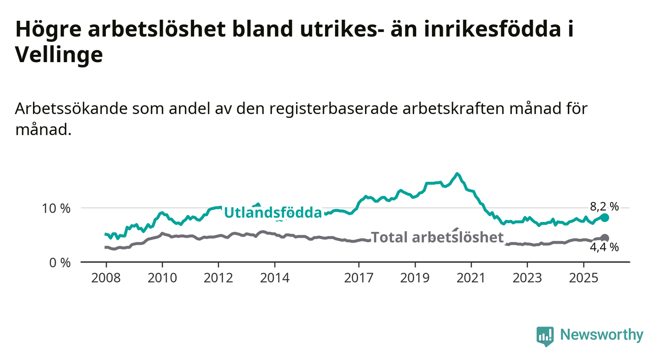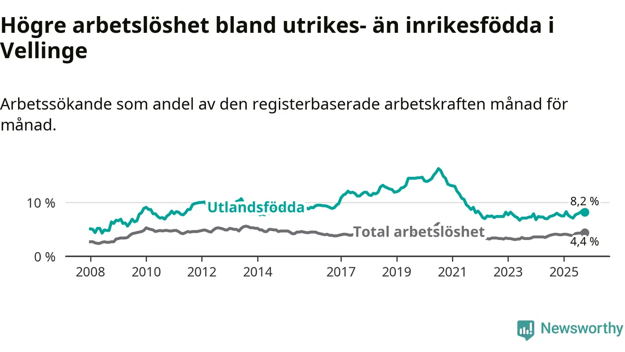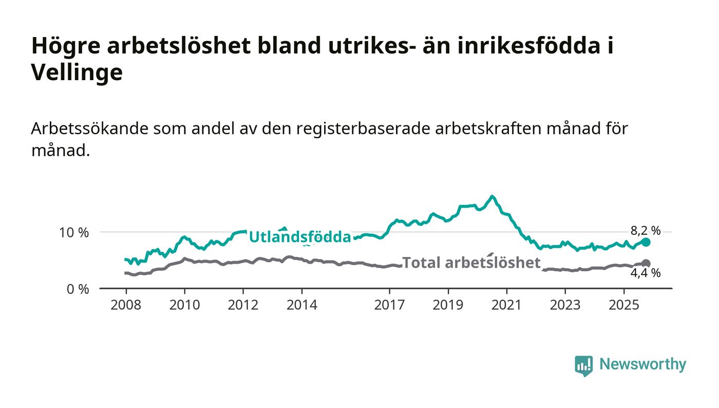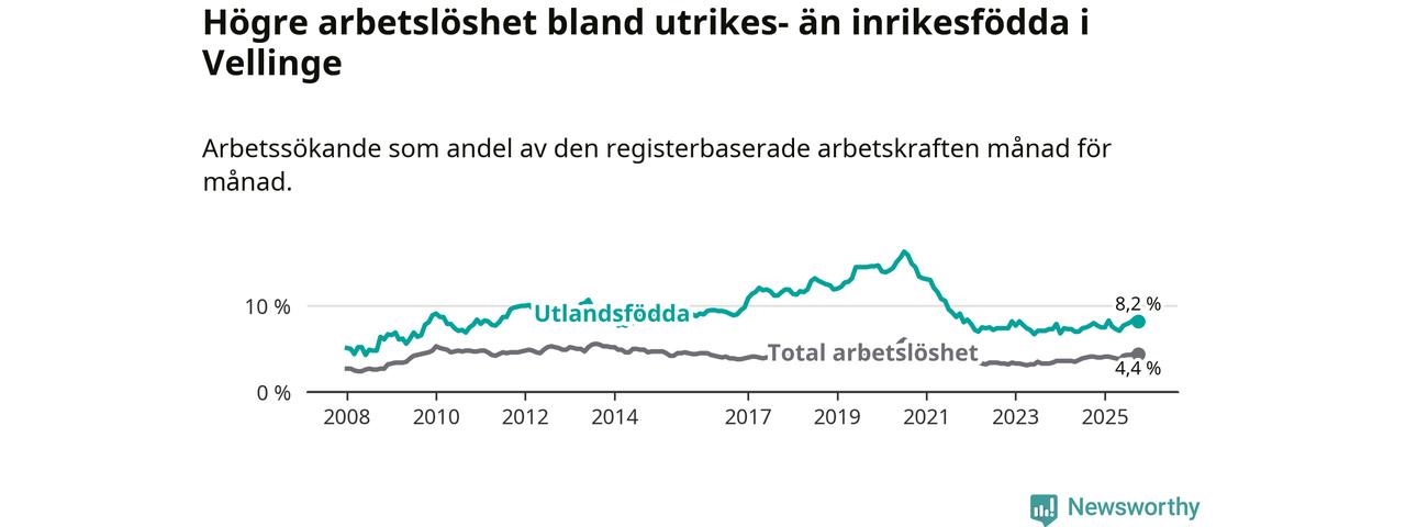 Arbetslösheten bland utlandsfödda var 8,2 procent i Vellinge under oktober månad, motsvarande 162 av 1 976 personer. Det är 0,2 procentenheter fler än vid samma tidpunkt i fjol (+5 om man räknar personer). Därmed är de utlandsföddas arbetslöshet högre än vid samma tidpunkt i fjol för sjätte månaden i följd.