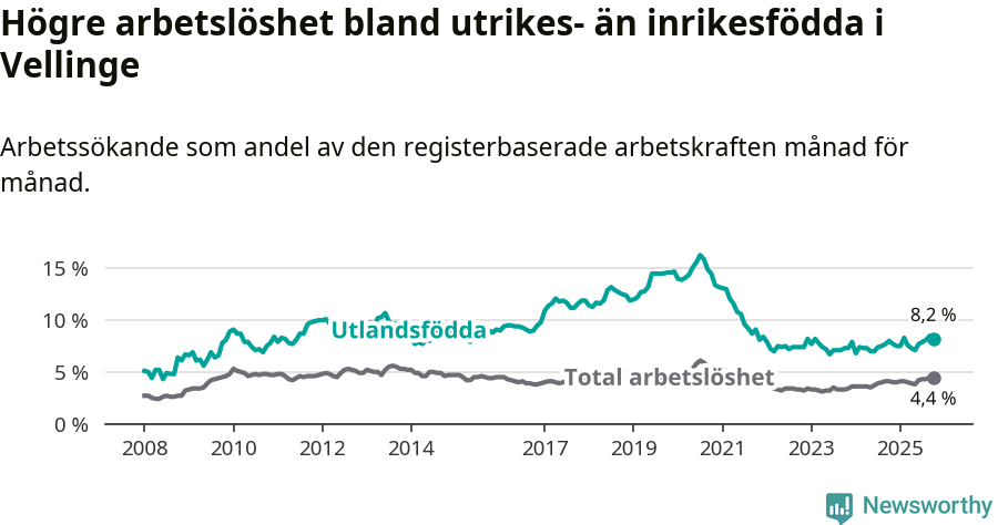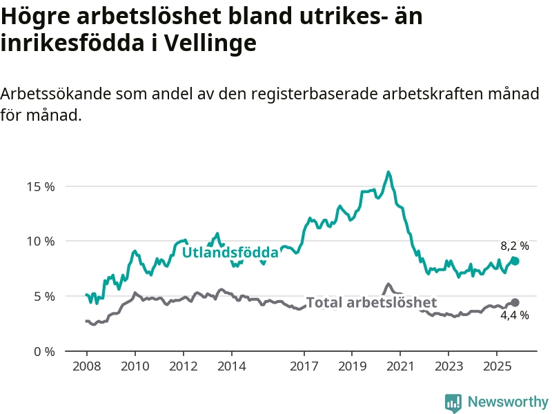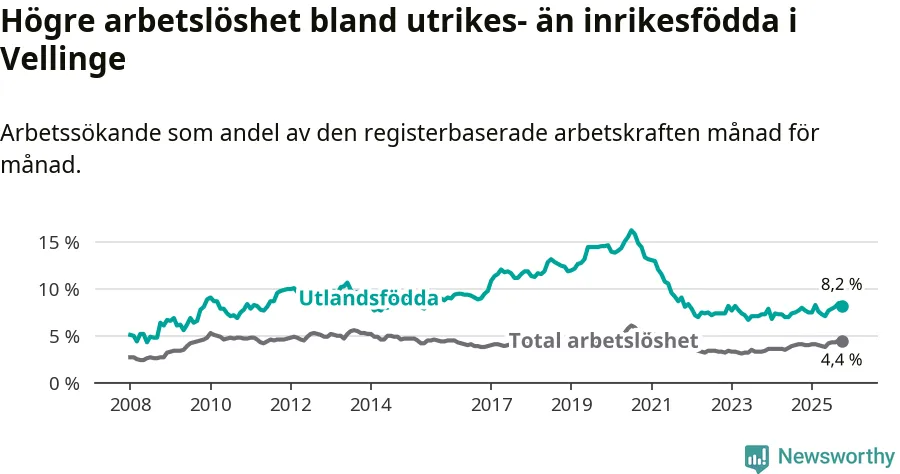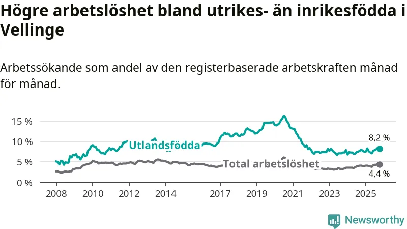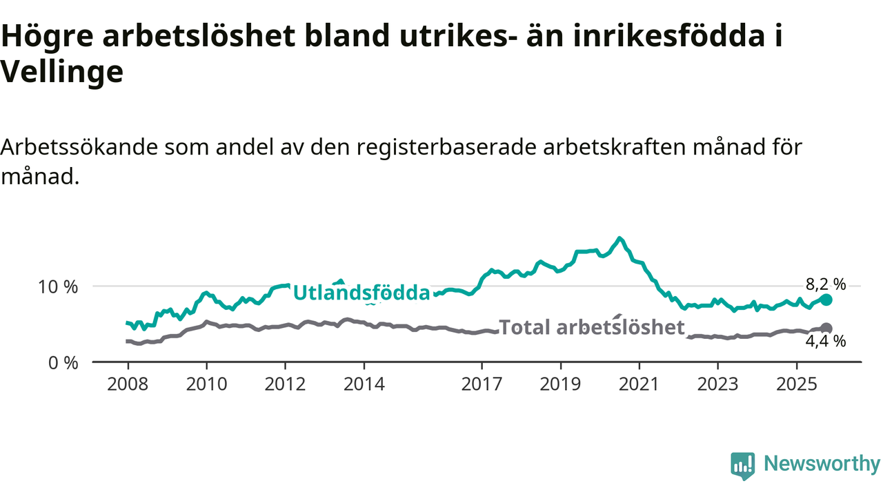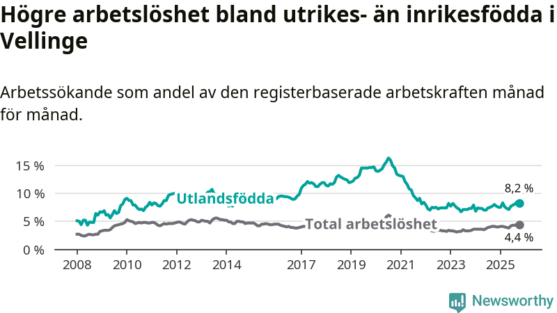 Arbetslösheten bland utlandsfödda var 8,2 procent i Vellinge under oktober månad, motsvarande 162 av 1 976 personer. Det är 0,2 procentenheter fler än vid samma tidpunkt i fjol (+5 om man räknar personer). Därmed är de utlandsföddas arbetslöshet högre än vid samma tidpunkt i fjol för sjätte månaden i följd.