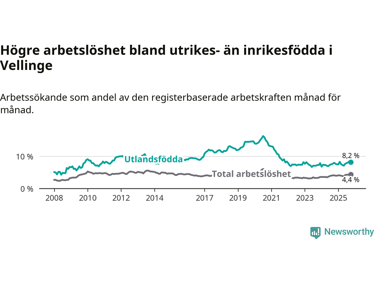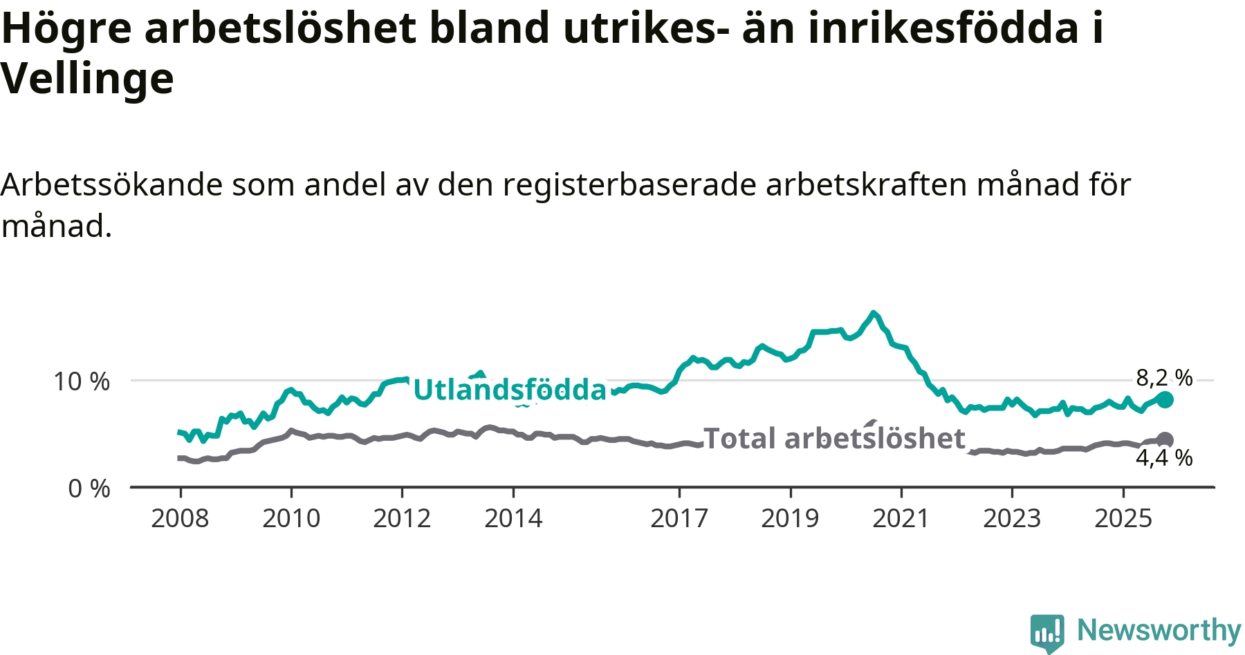 Graf: Skillnad i arbetslöshet mellan utrikesfödda och hela befolkningen i Vellinge kommun