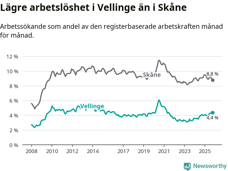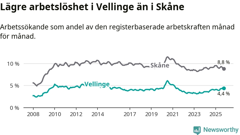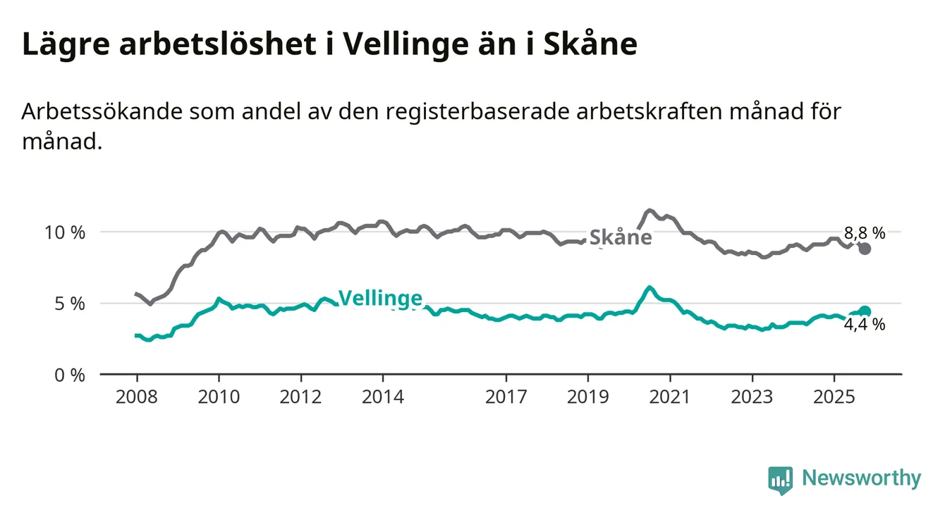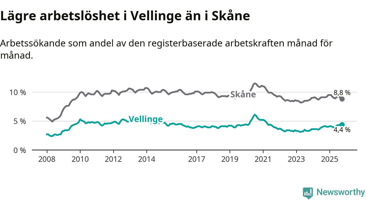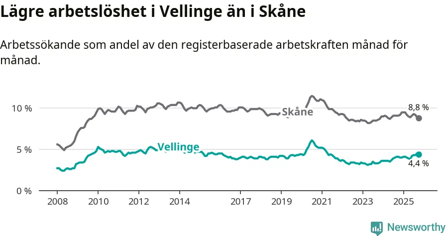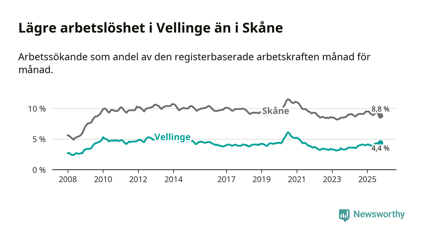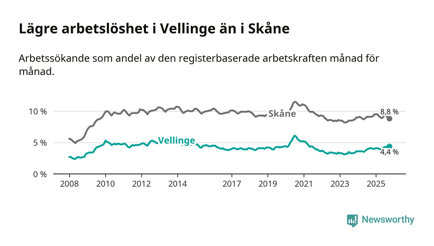 Det är 24:e månaden i följd som arbetslösheten i Vellinge är högre än den var under samma tidpunkt året innan. Sedan oktober 2023 har arbetslösheten gått upp från 3,3 till 4,4 procent.