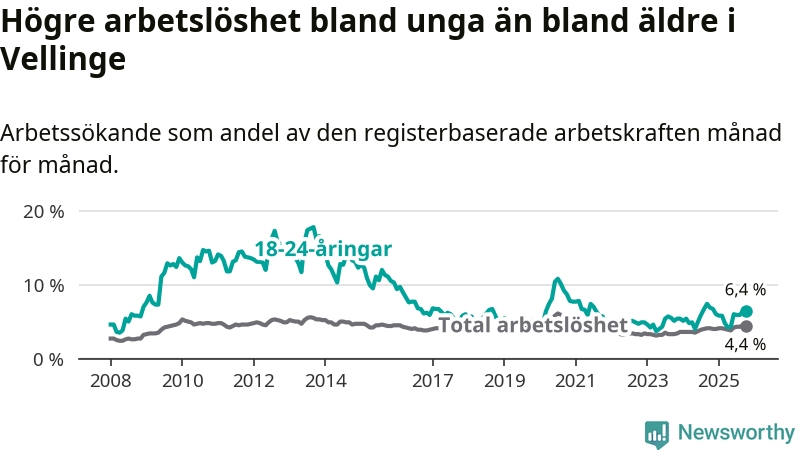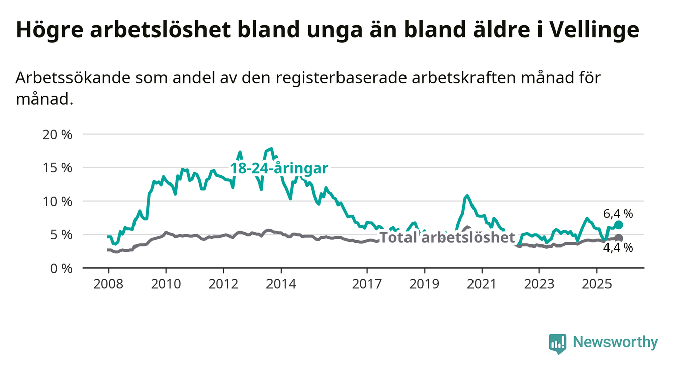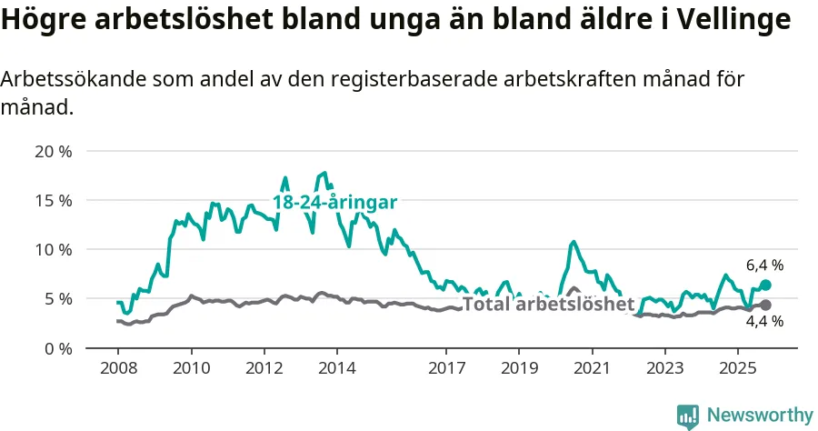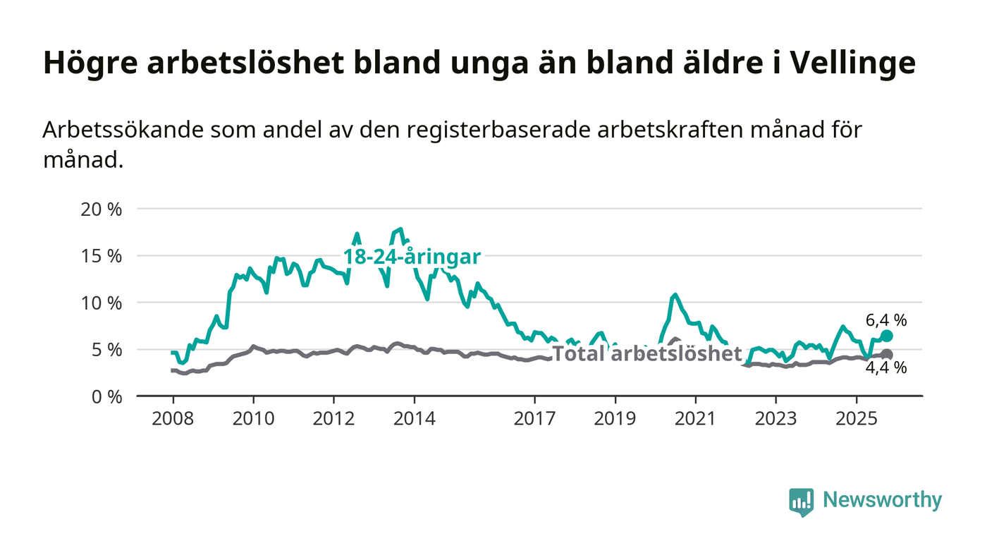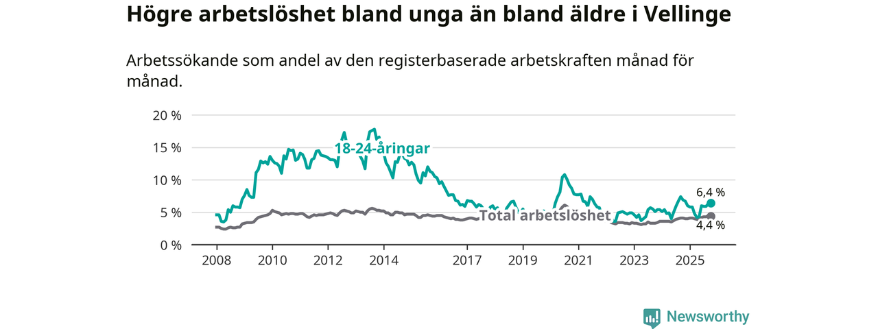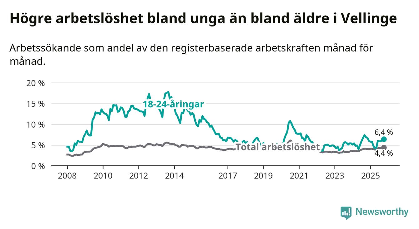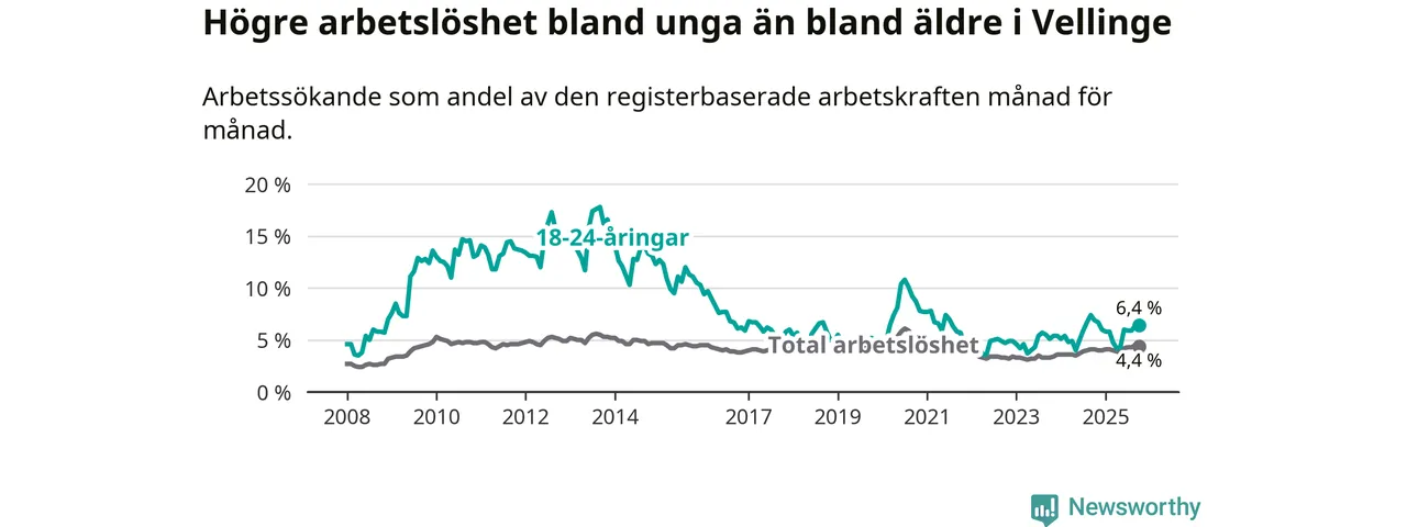 Det är 24:e månaden i följd som arbetslösheten i Vellinge är högre än den var under samma tidpunkt året innan. Sedan oktober 2023 har arbetslösheten gått upp från 3,3 till 4,4 procent.