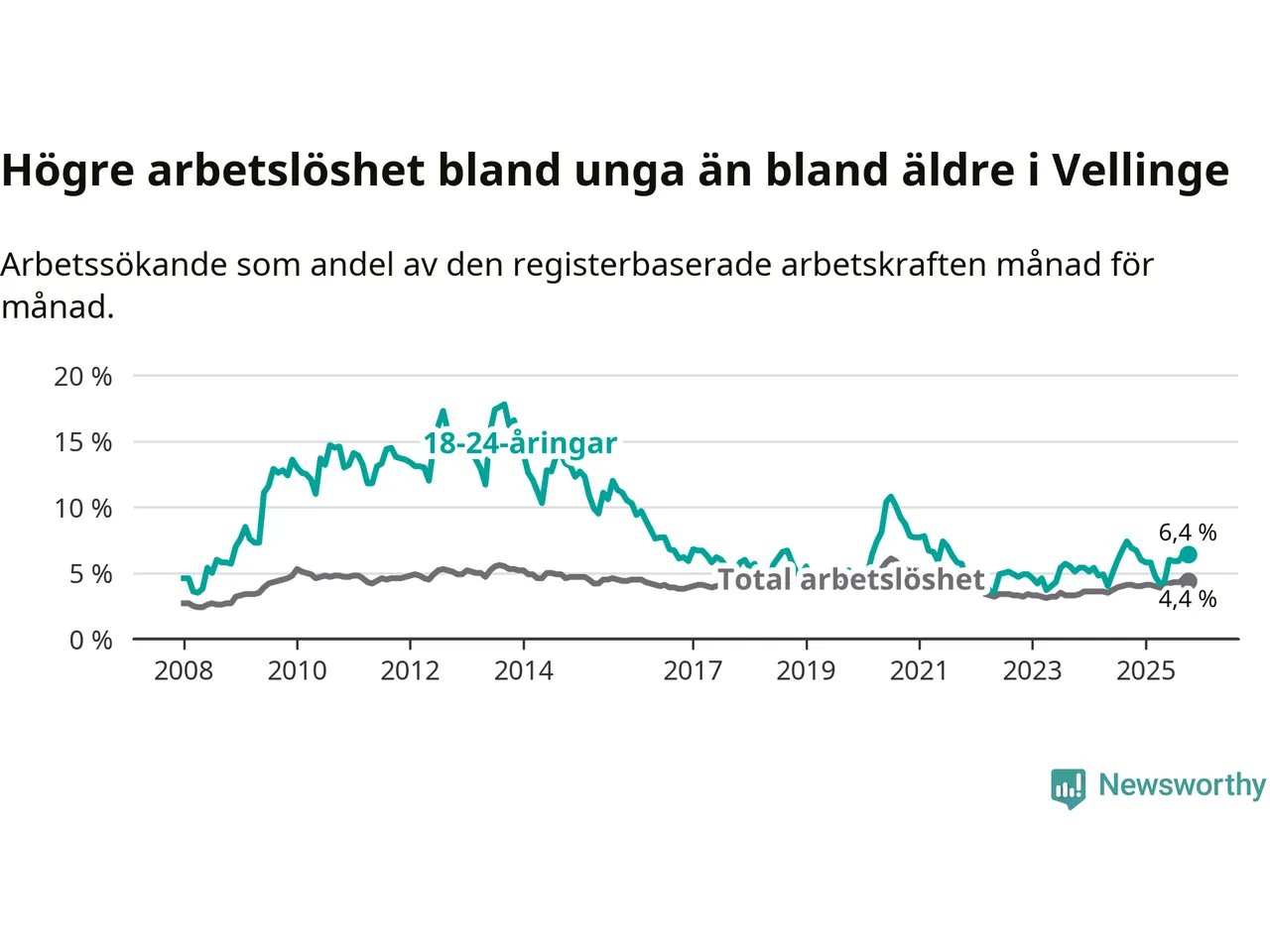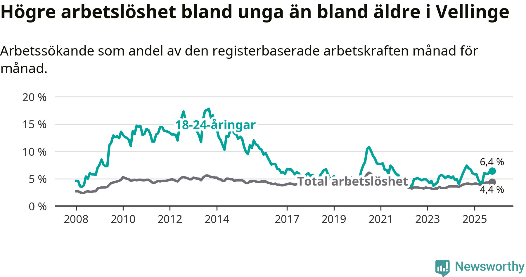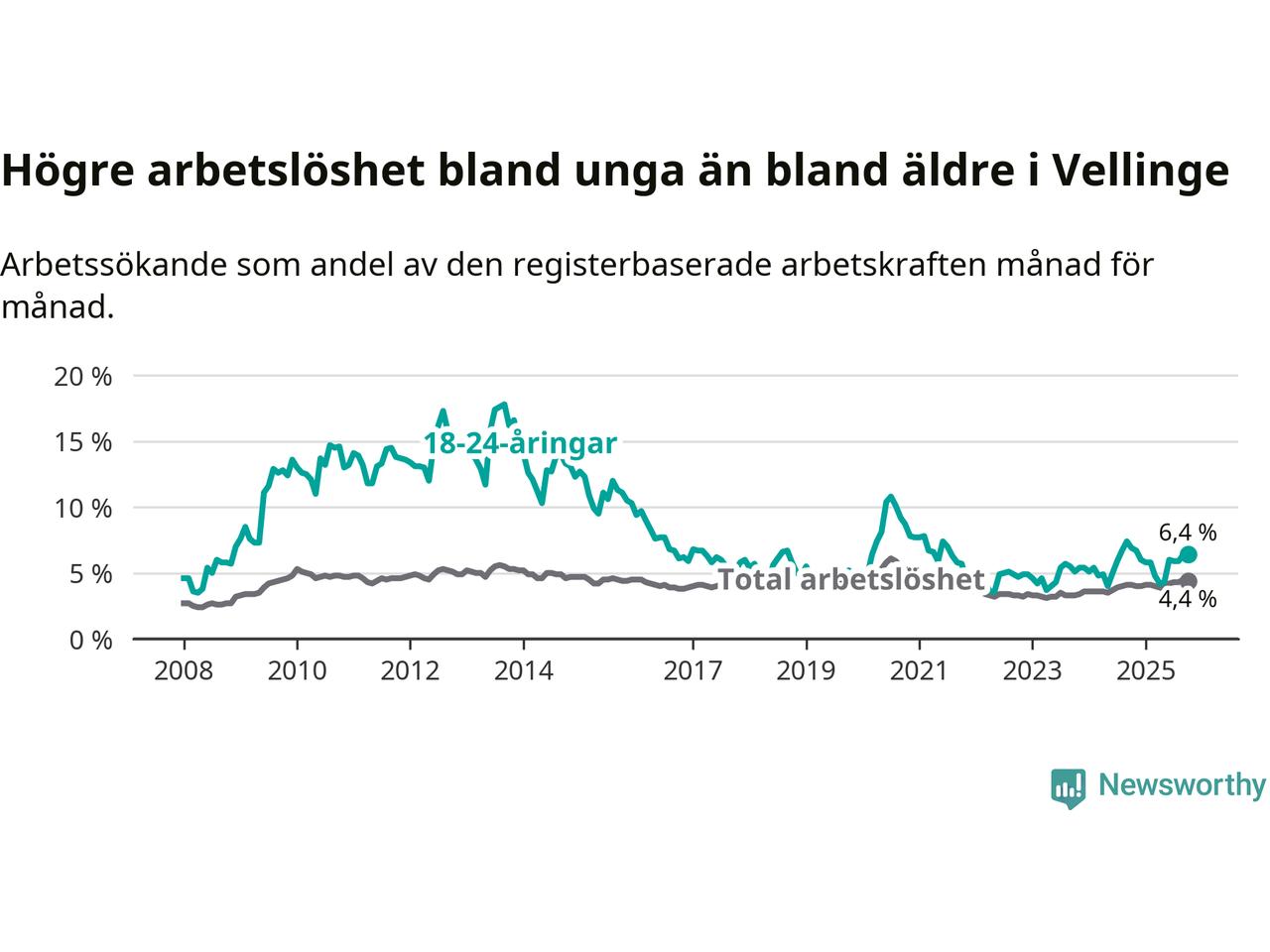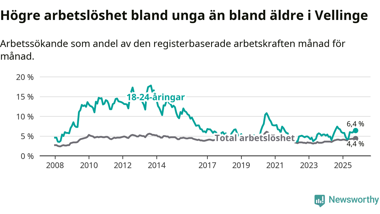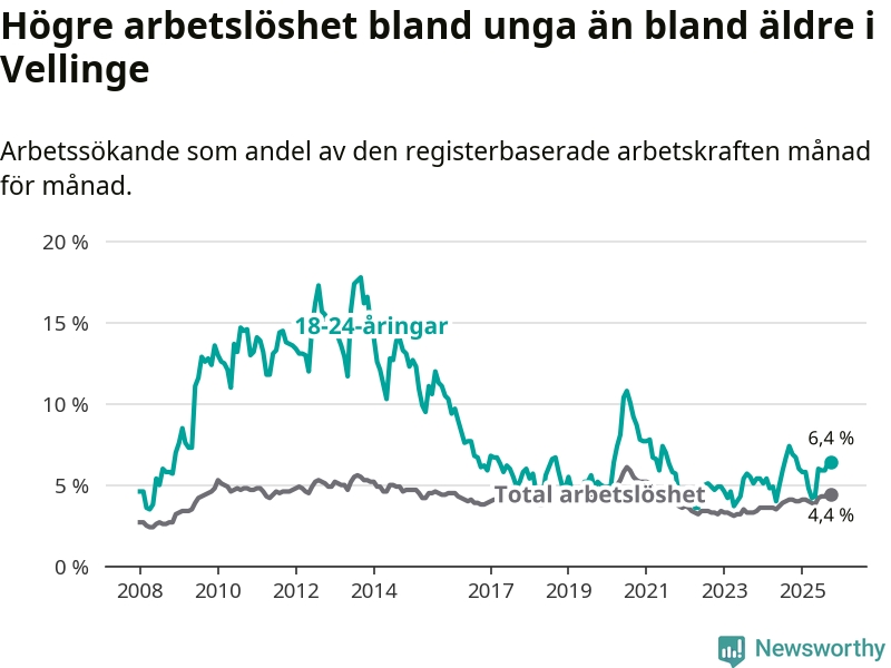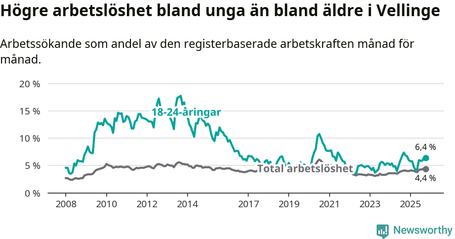 Det är 24:e månaden i följd som arbetslösheten i Vellinge är högre än den var under samma tidpunkt året innan. Sedan oktober 2023 har arbetslösheten gått upp från 3,3 till 4,4 procent.