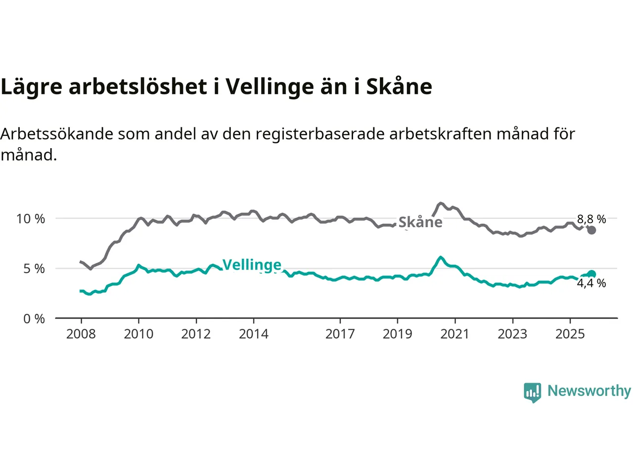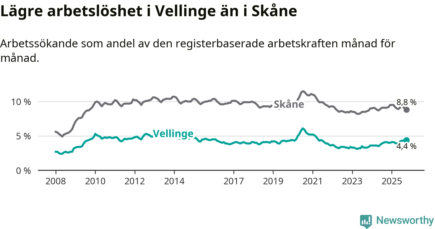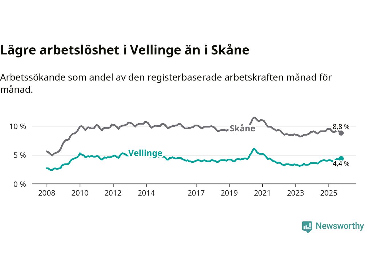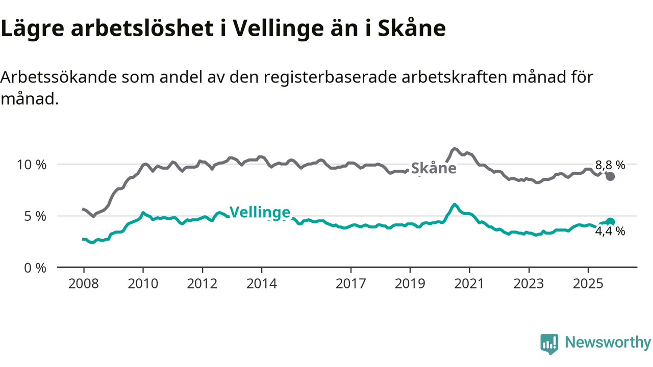 Graf: Arbetslöshet i Vellinge kommun och Skåne län