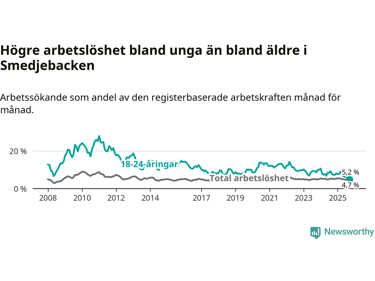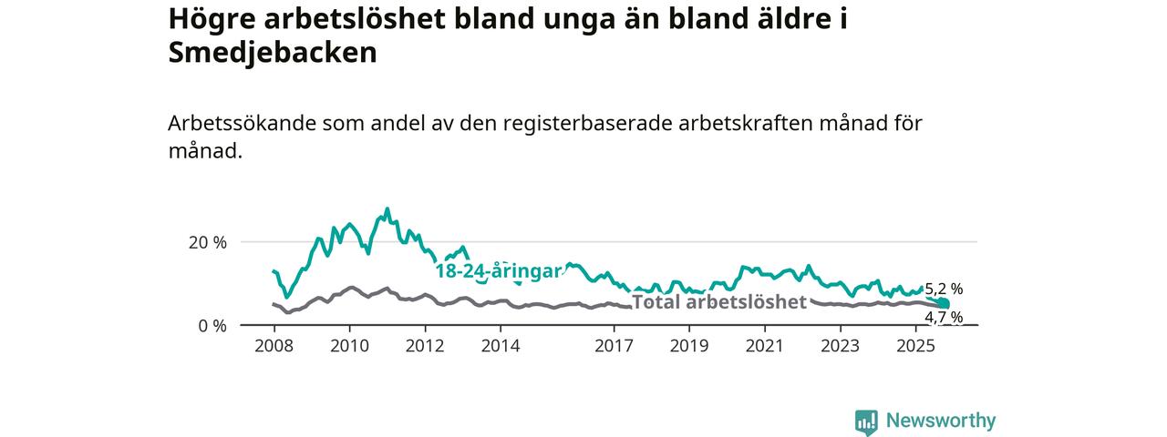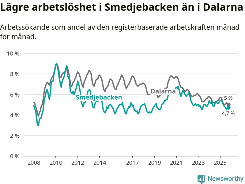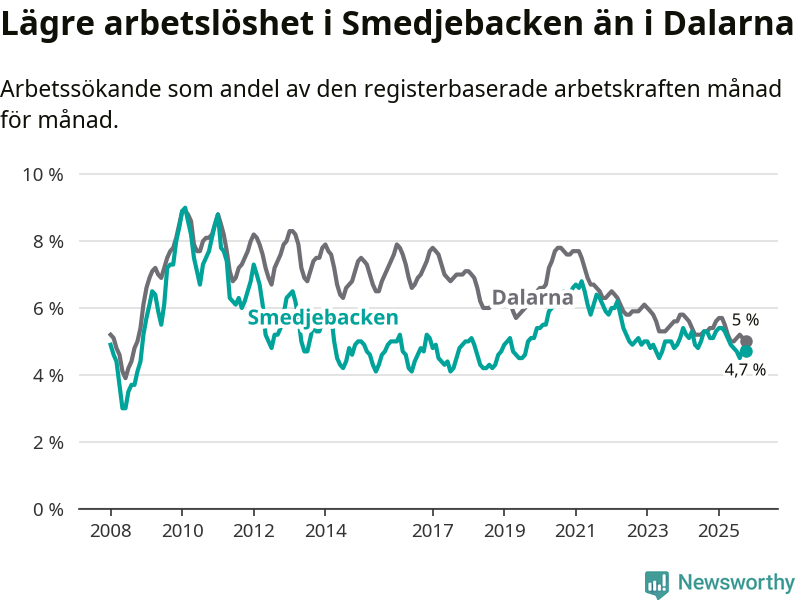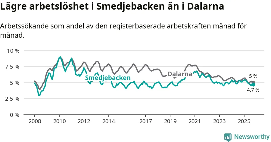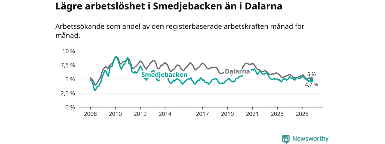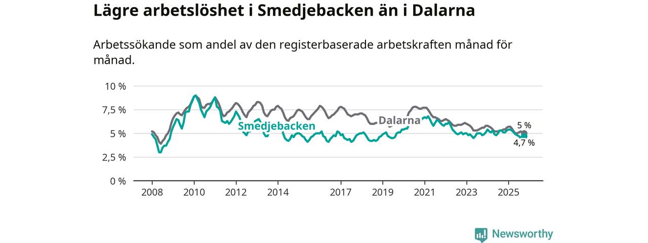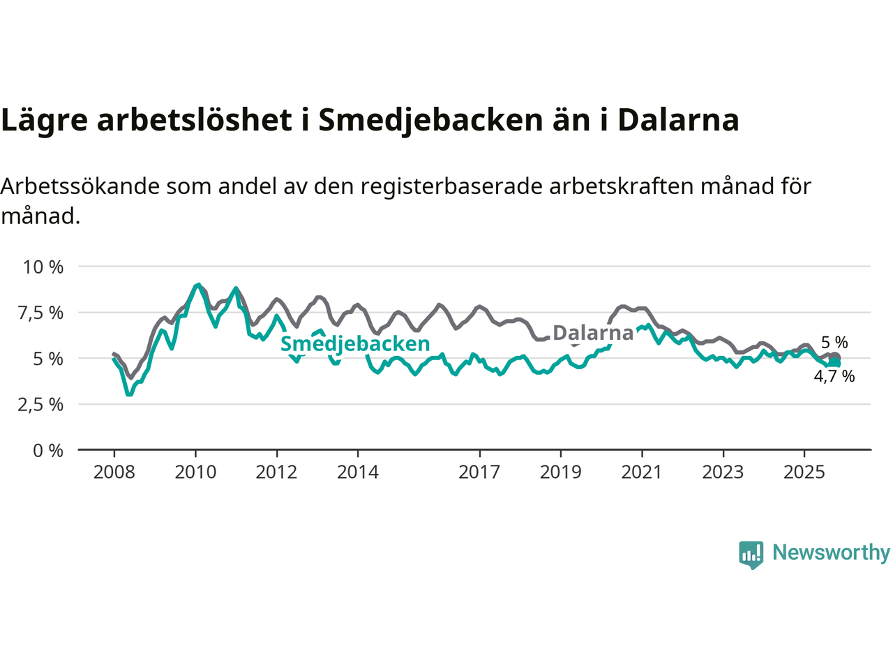 Under oktober månad rapporterade Smedjebackens kommun en total arbetslöshet på 4,7 procent. Det är en minskning jämfört med samma tidpunkt i fjol (−0,4 procentenheter). Även i Dalarnas län sjunker arbetslösheten .