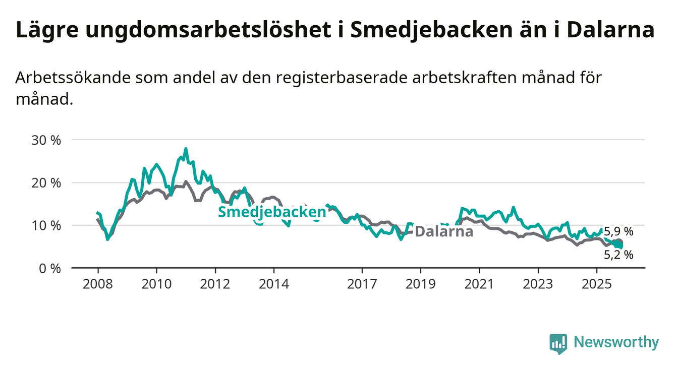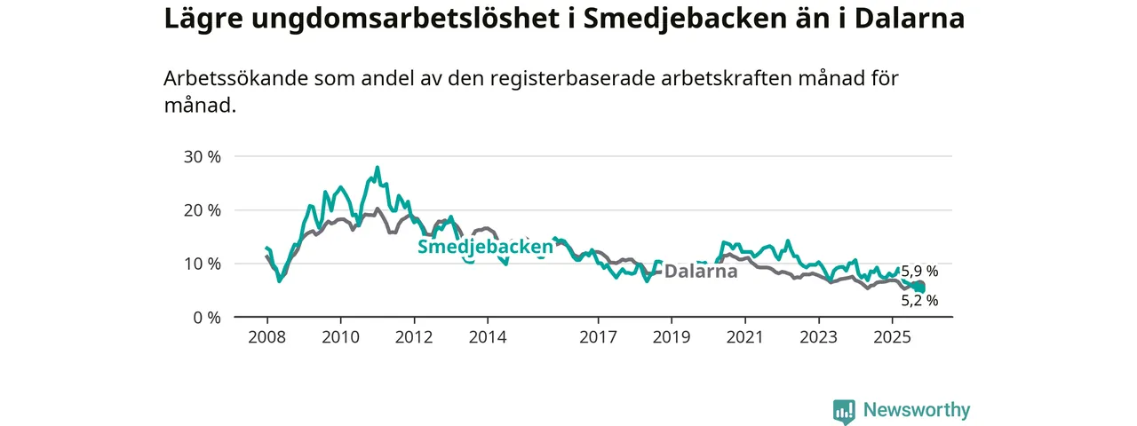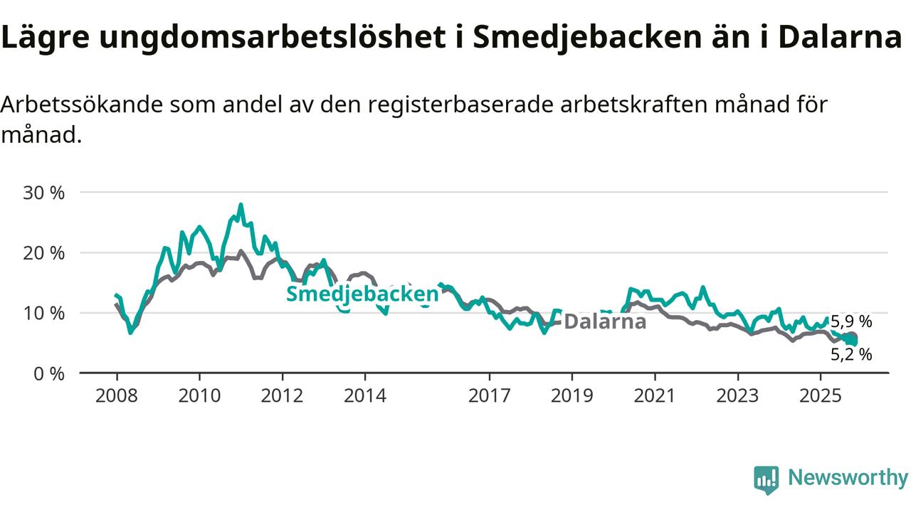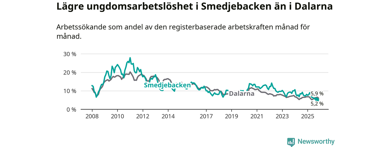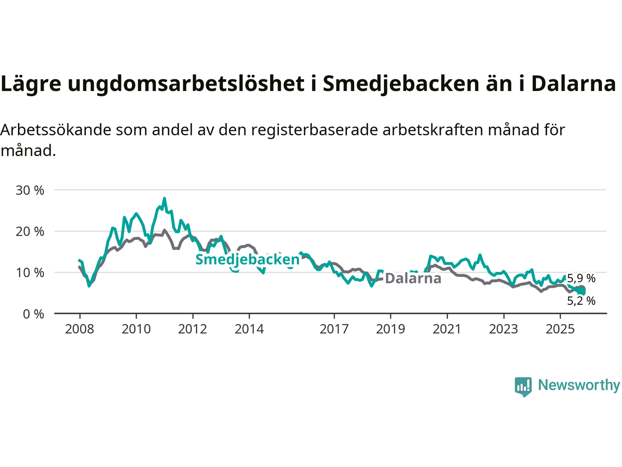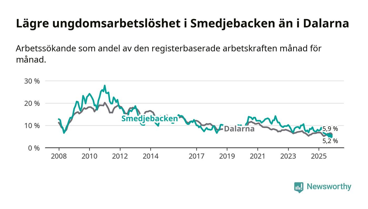 Precis som den totala arbetslösheten ligger ungdomsarbetslösheten i Smedjebacken lägre än i Dalarna som helhet. Skillnaden mellan kommunen och länet är 0,7 procentenheter.