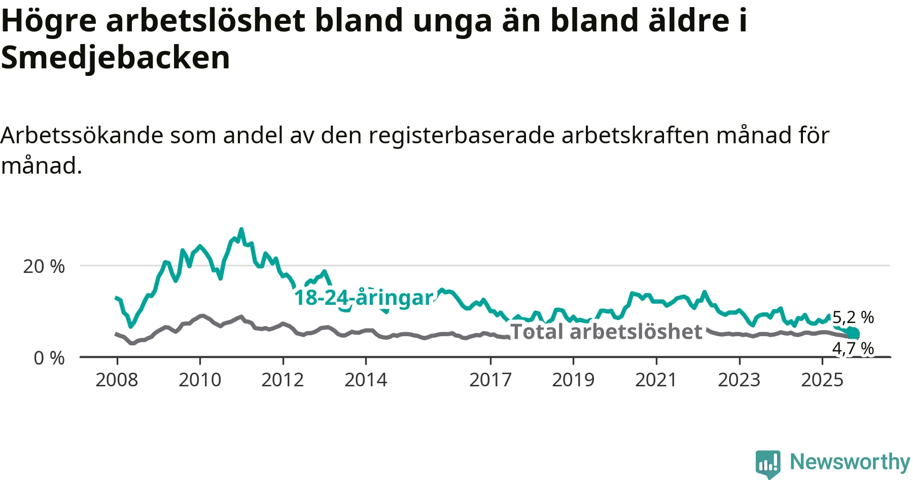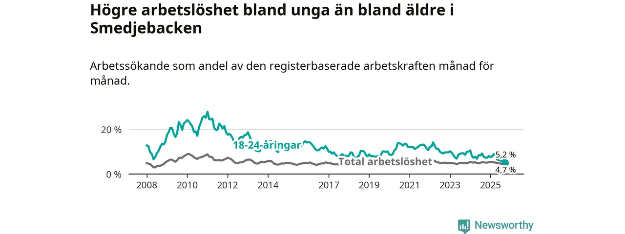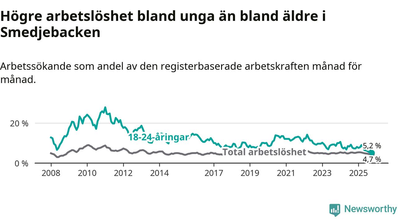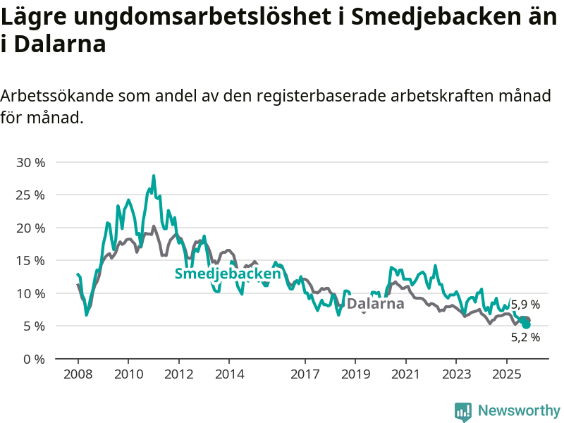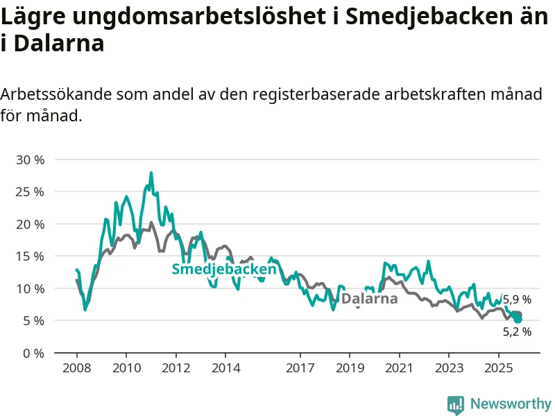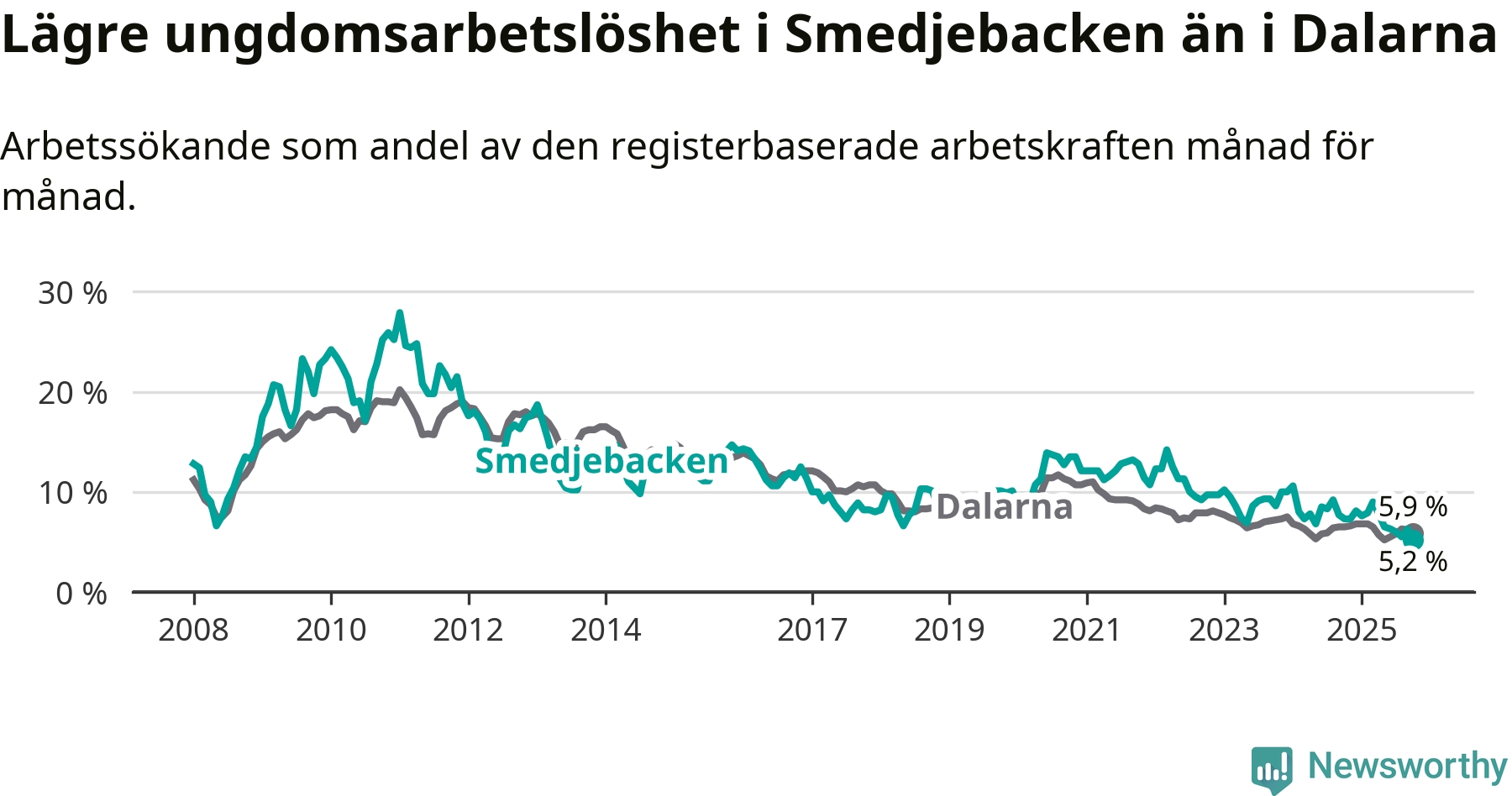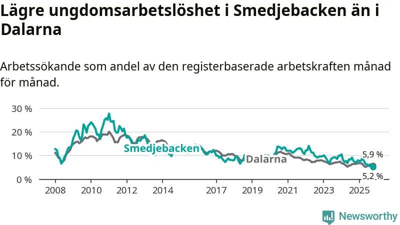 Precis som den totala arbetslösheten ligger ungdomsarbetslösheten i Smedjebacken lägre än i Dalarna som helhet. Skillnaden mellan kommunen och länet är 0,7 procentenheter.