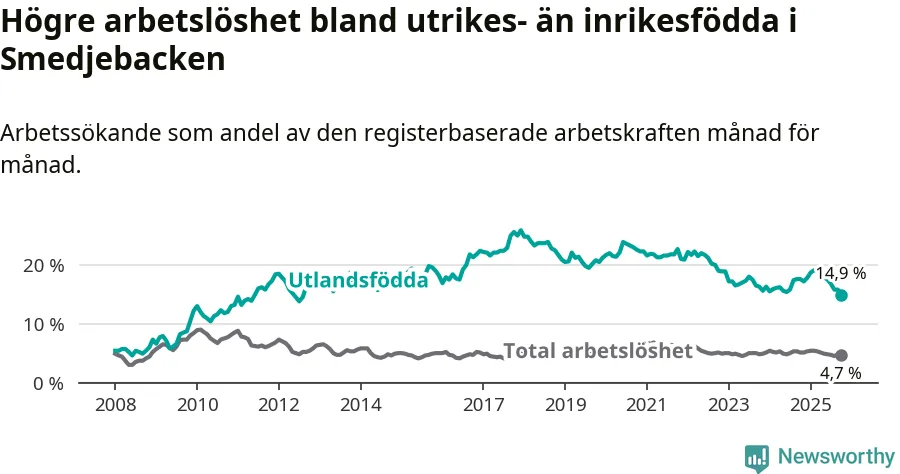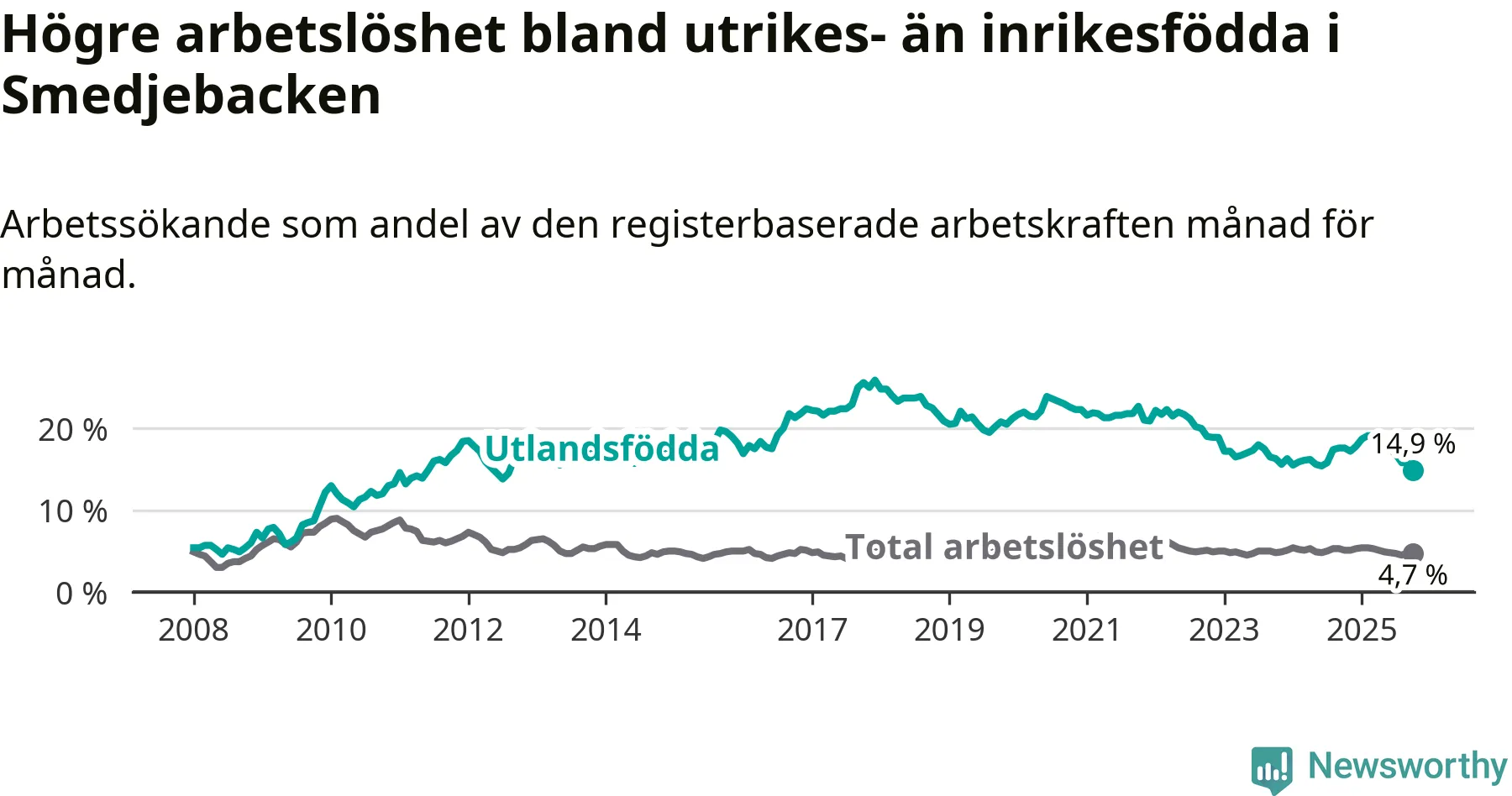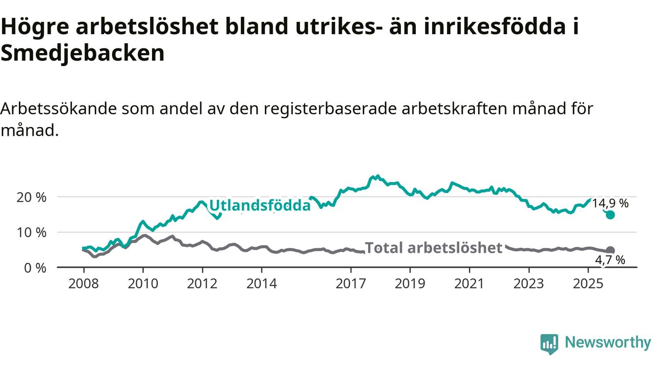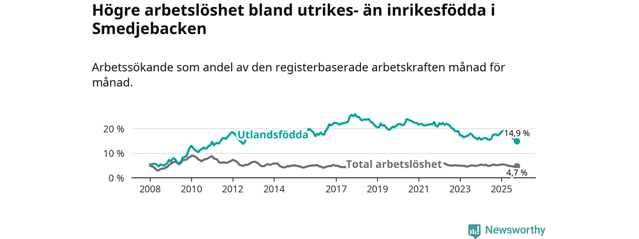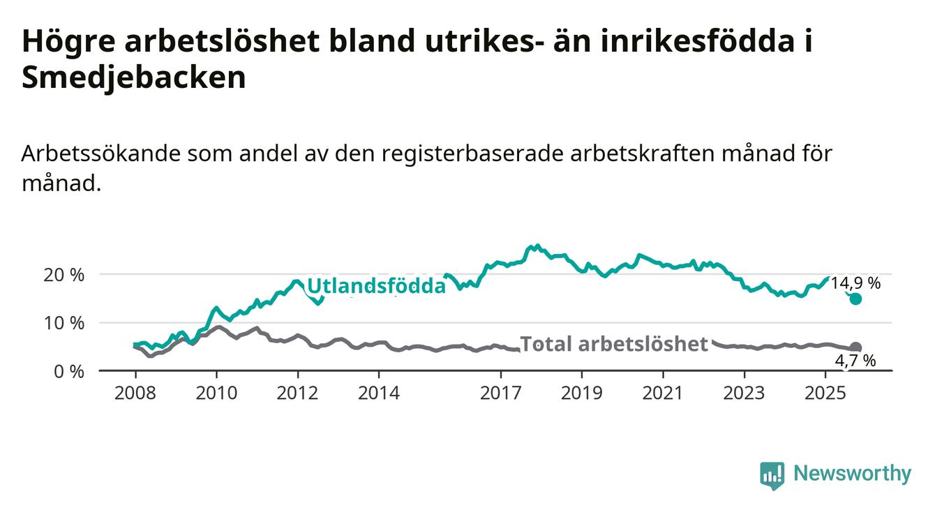 Skillnaden i arbetslöshet mellan utrikesfödda och hela befolkningen är 10,2 procentenheter i Smedjebacken. Det är en betydligt mindre skillnad än för ett år sedan (−2,3 procentenheter).