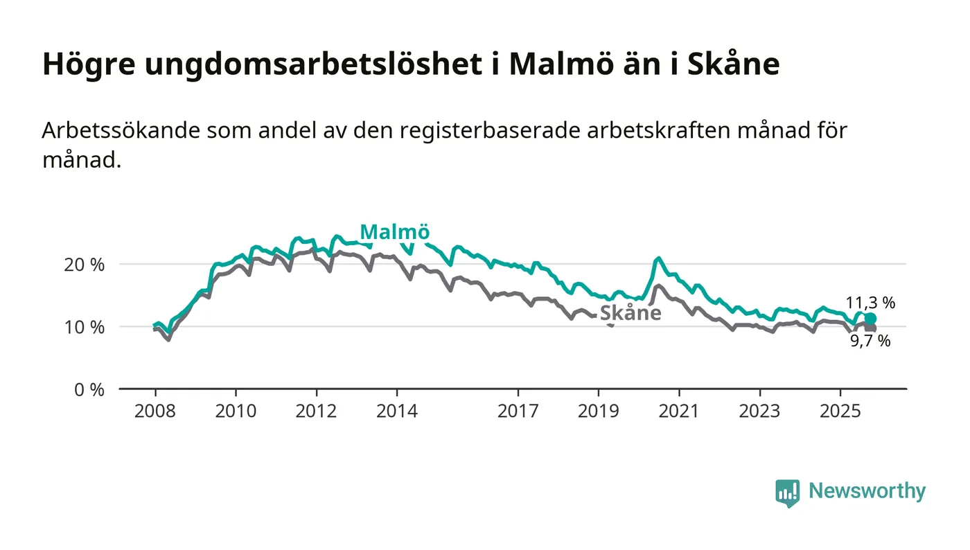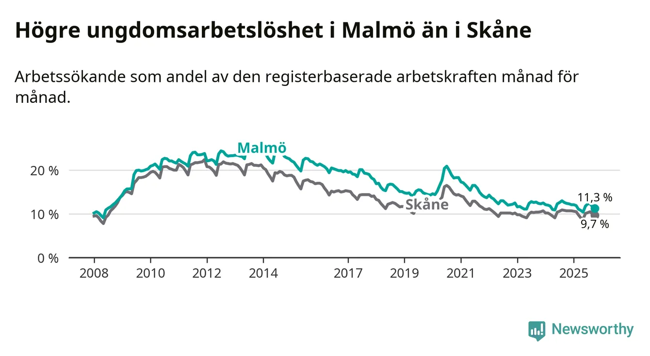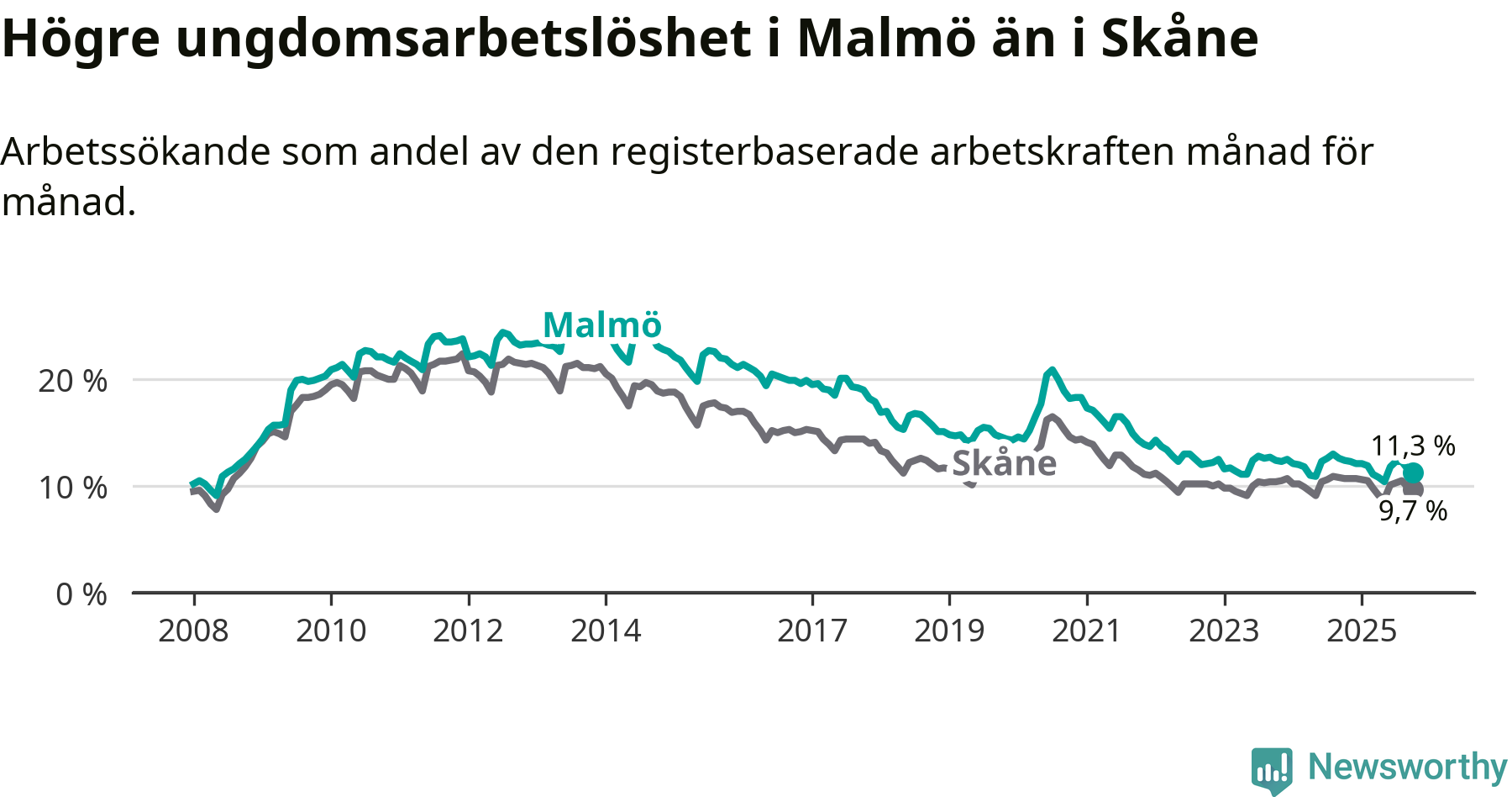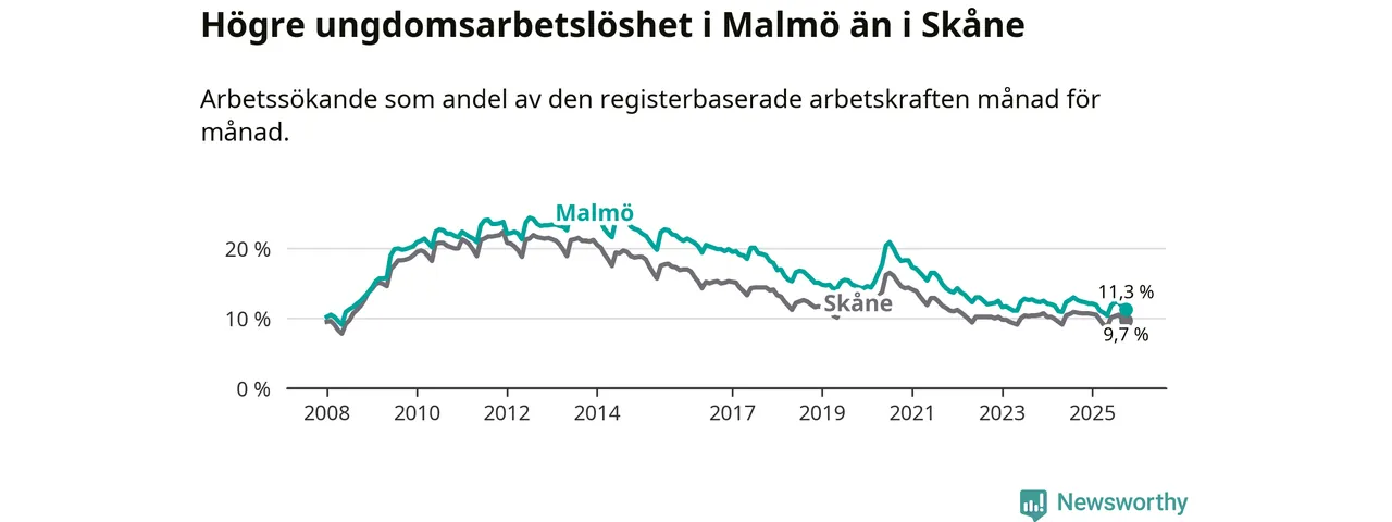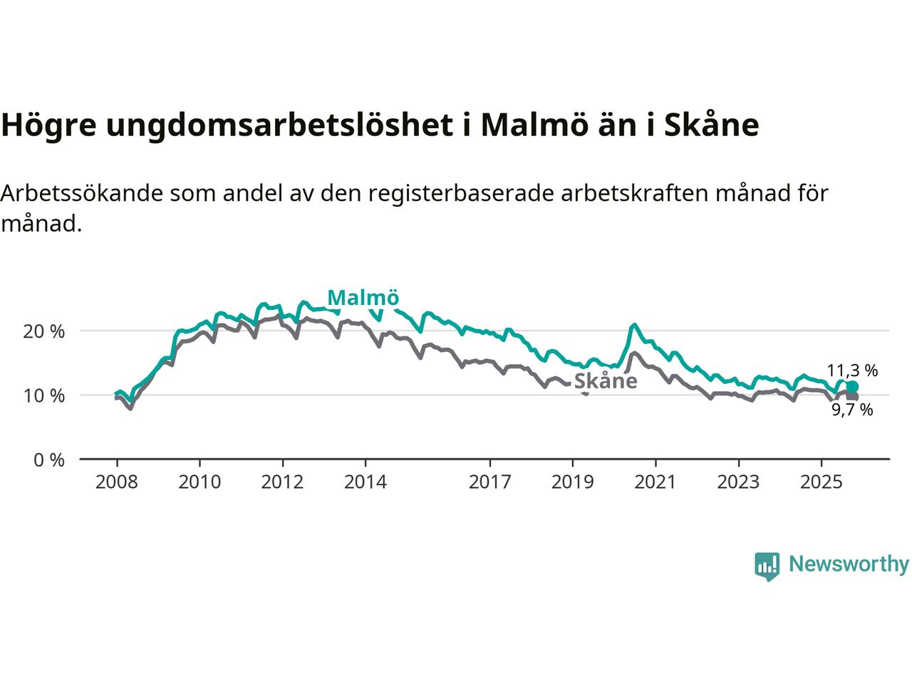 Precis som den totala arbetslösheten ligger ungdomsarbetslösheten i Malmö högre än i Skåne som helhet. Skillnaden mellan kommunen och länet är 1,6 procentenheter.