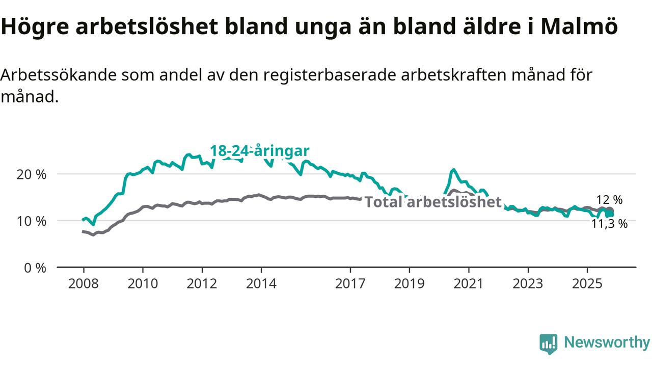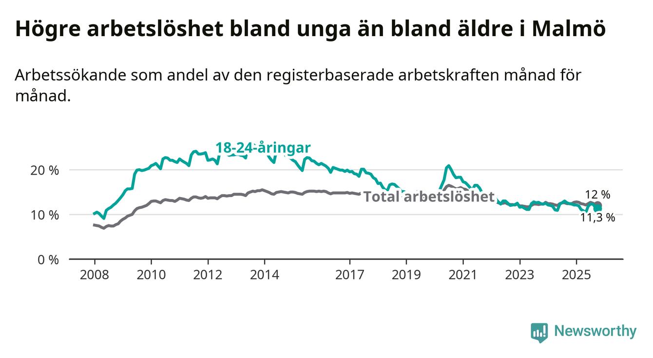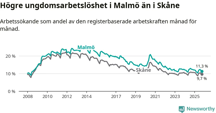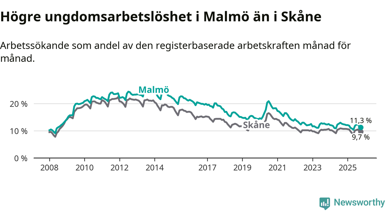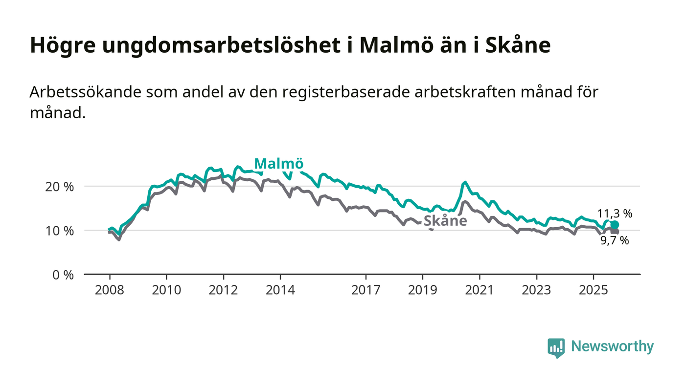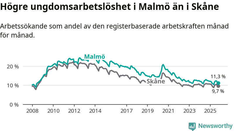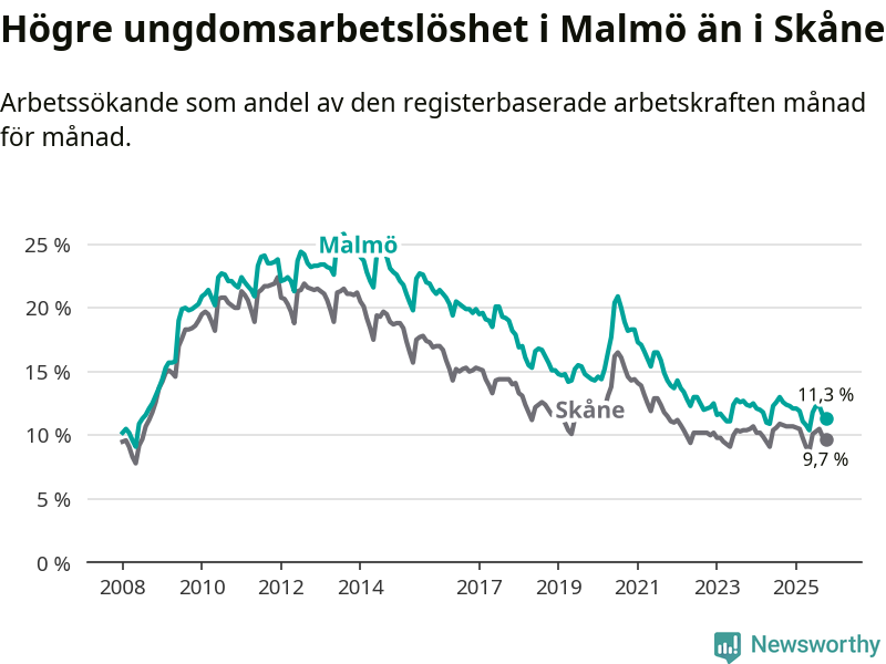 Precis som den totala arbetslösheten ligger ungdomsarbetslösheten i Malmö högre än i Skåne som helhet. Skillnaden mellan kommunen och länet är 1,6 procentenheter.