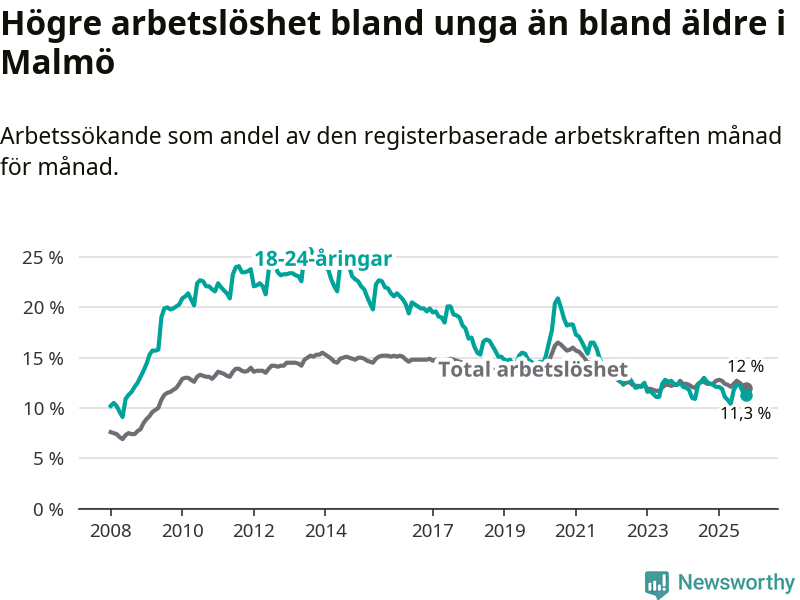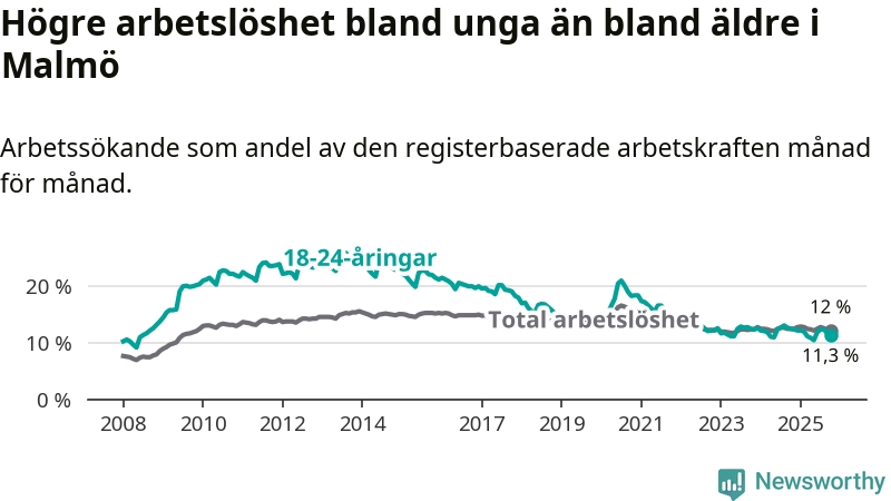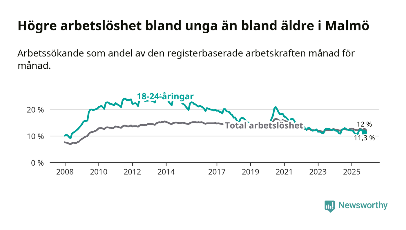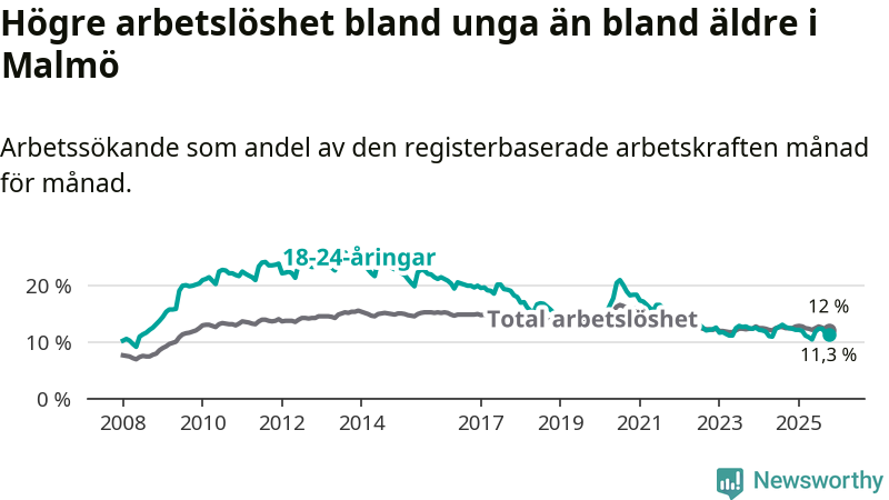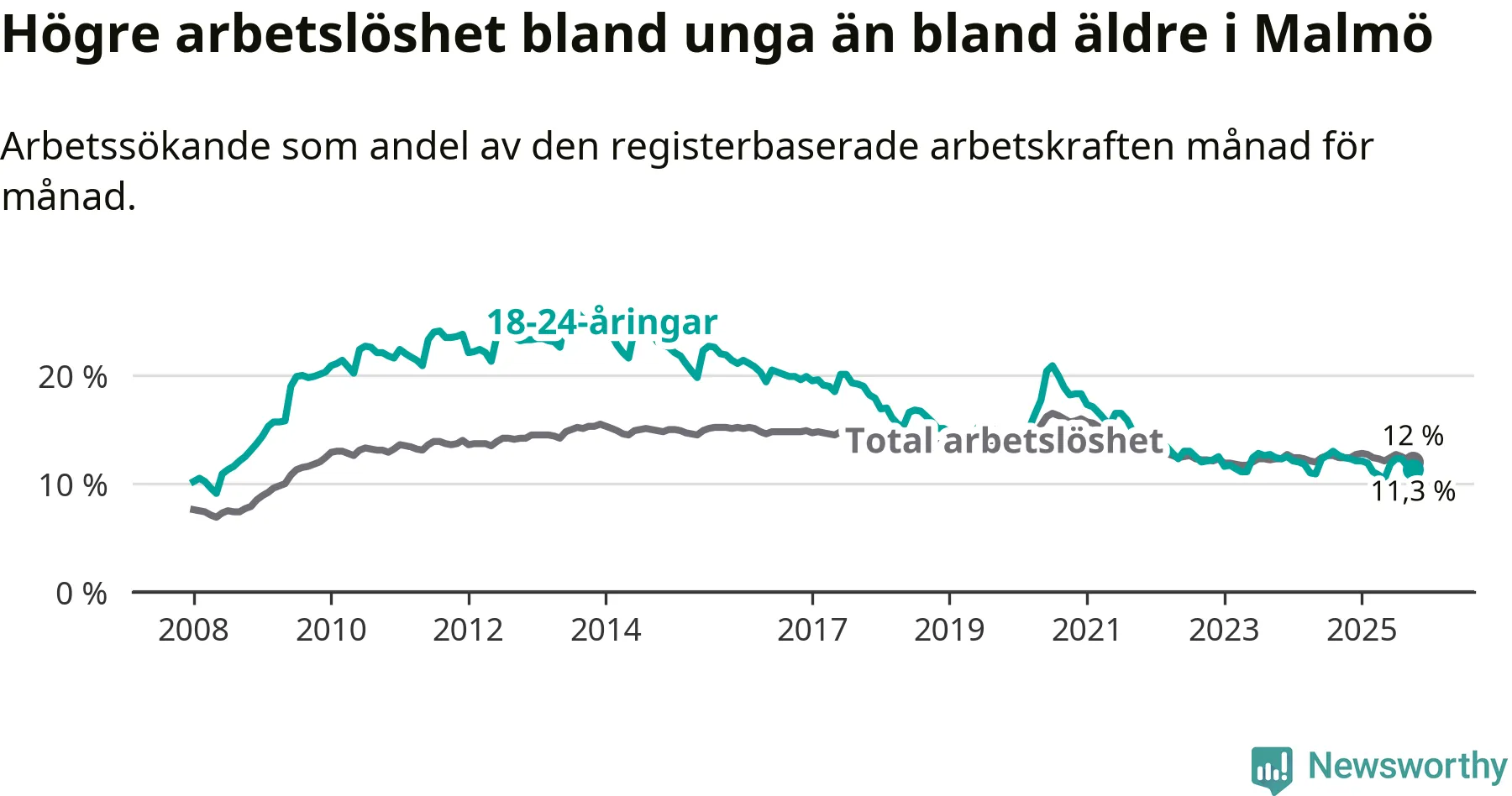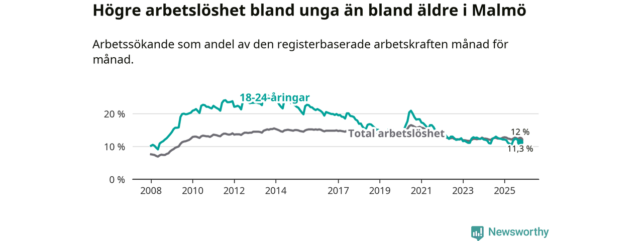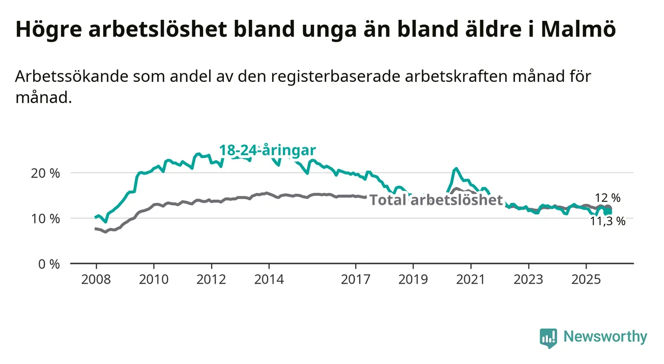 Precis som den totala arbetslösheten ligger ungdomsarbetslösheten i Malmö högre än i Skåne som helhet. Skillnaden mellan kommunen och länet är 1,6 procentenheter.