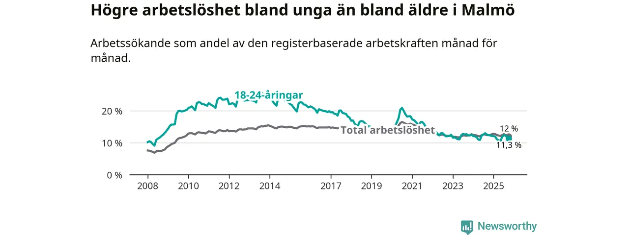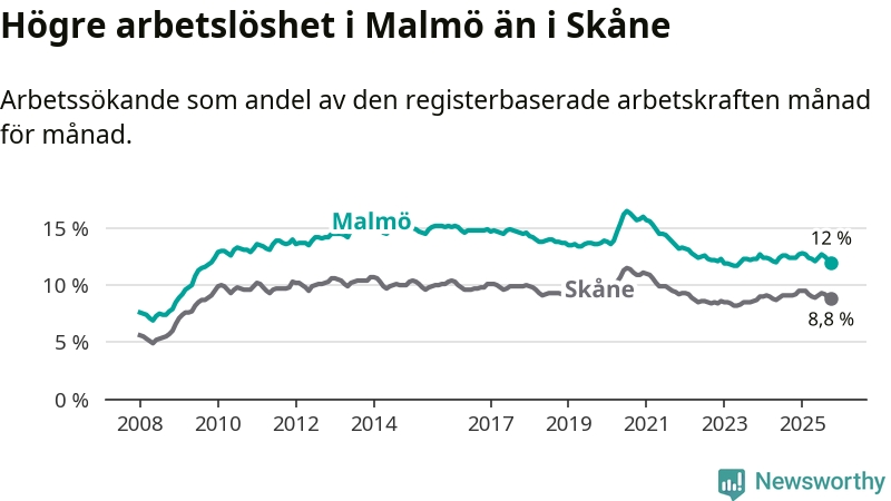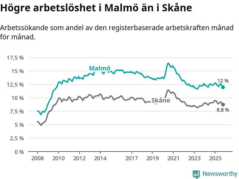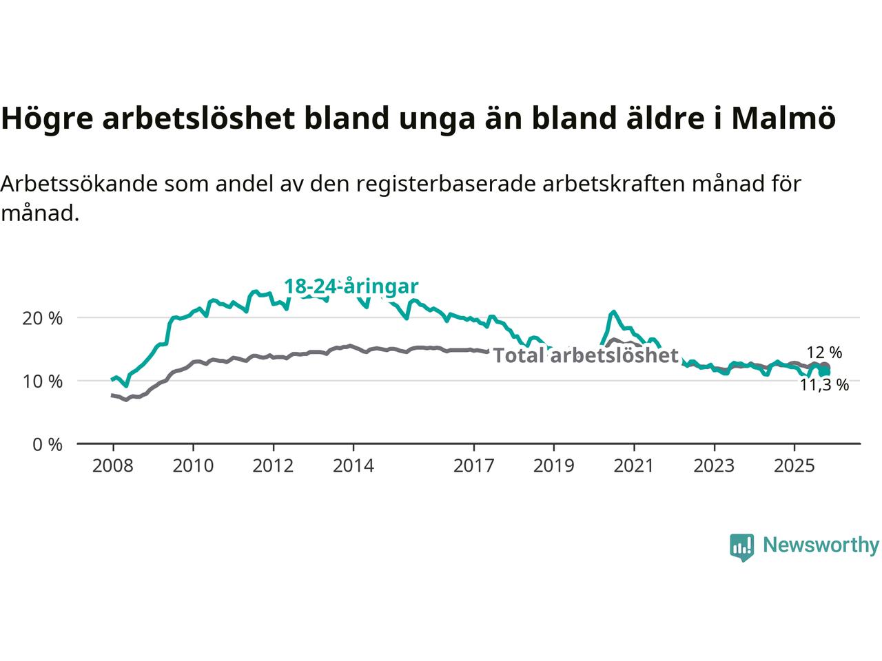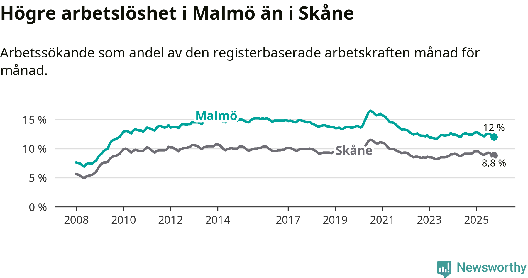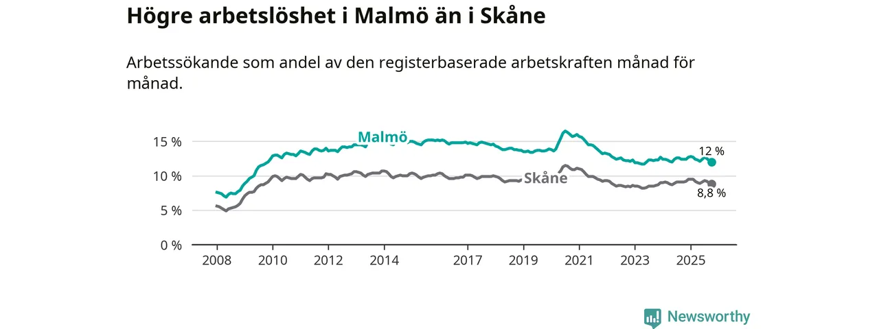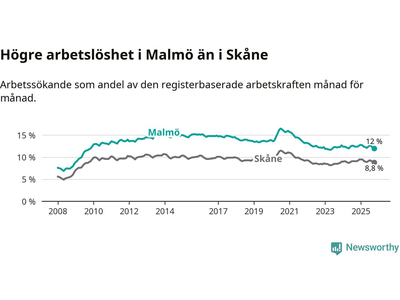 Under oktober månad rapporterade Malmö kommun en total arbetslöshet på 12,0 procent. Det är en minskning jämfört med samma tidpunkt i fjol (−0,4 procentenheter). Även i Skåne län sjunker arbetslösheten .