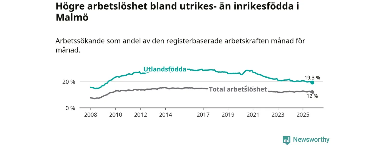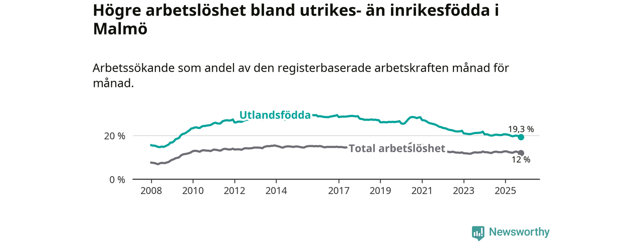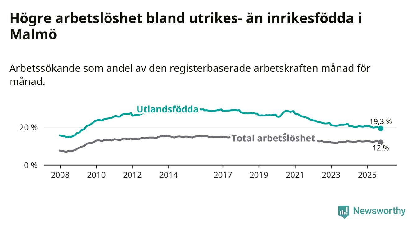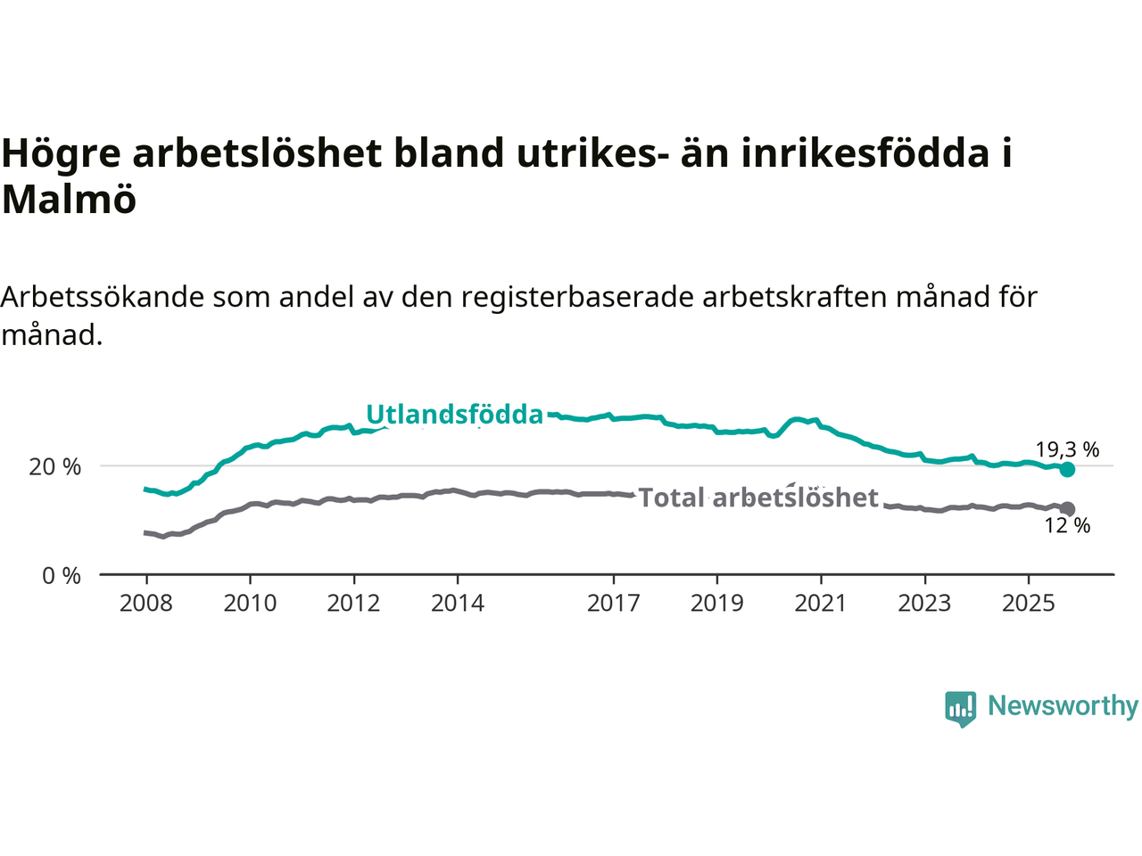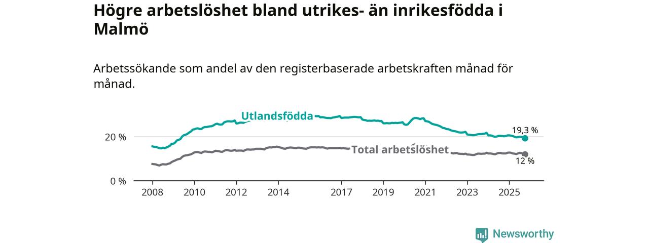 Arbetslösheten bland utlandsfödda var 19,3 procent i Malmö under oktober månad, motsvarande 15 111 av 78 295 personer. Det är 0,9 procentenheter färre än vid samma tidpunkt i fjol (−401 om man räknar personer). Därmed är de utlandsföddas arbetslöshet lägre än vid samma tidpunkt i fjol för nionde månaden i följd. Sedan januari har arbetslösheten bland utlandsfödda minskat från 20,6 till 19,3 procent. Den nuvarande arbetslöshetsnivån är den lägsta sedan maj 2009.