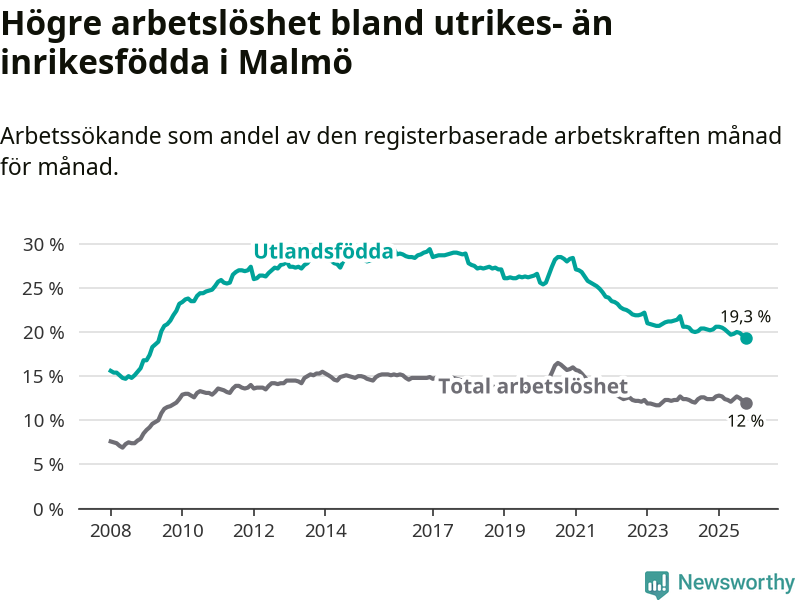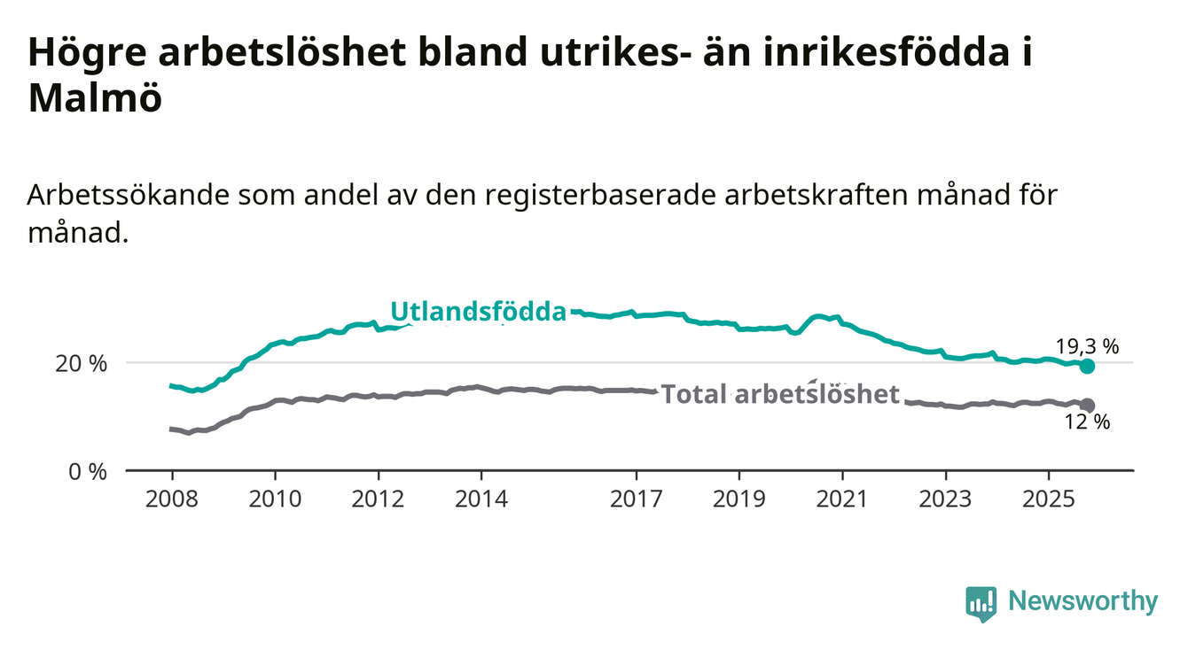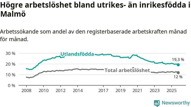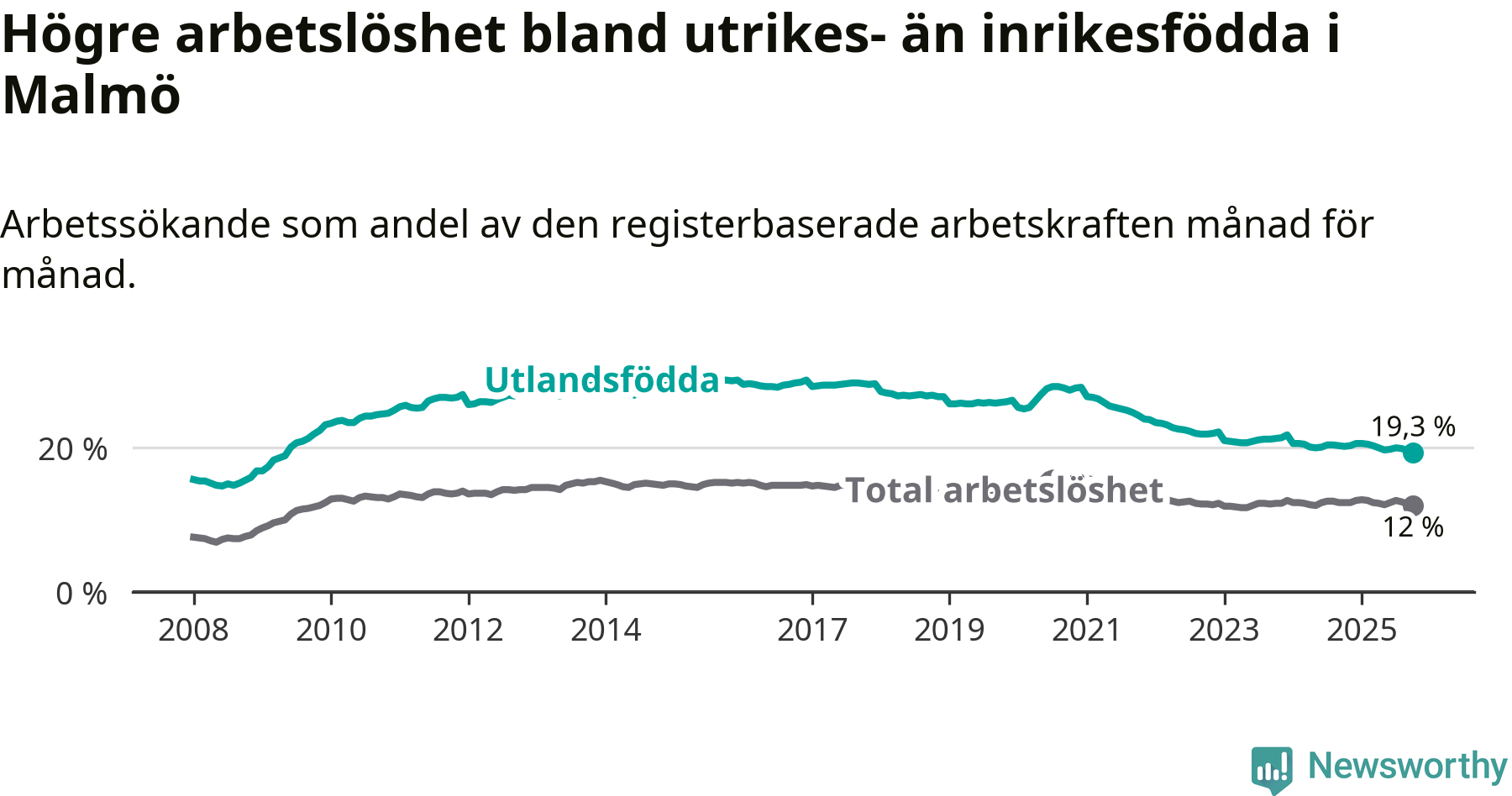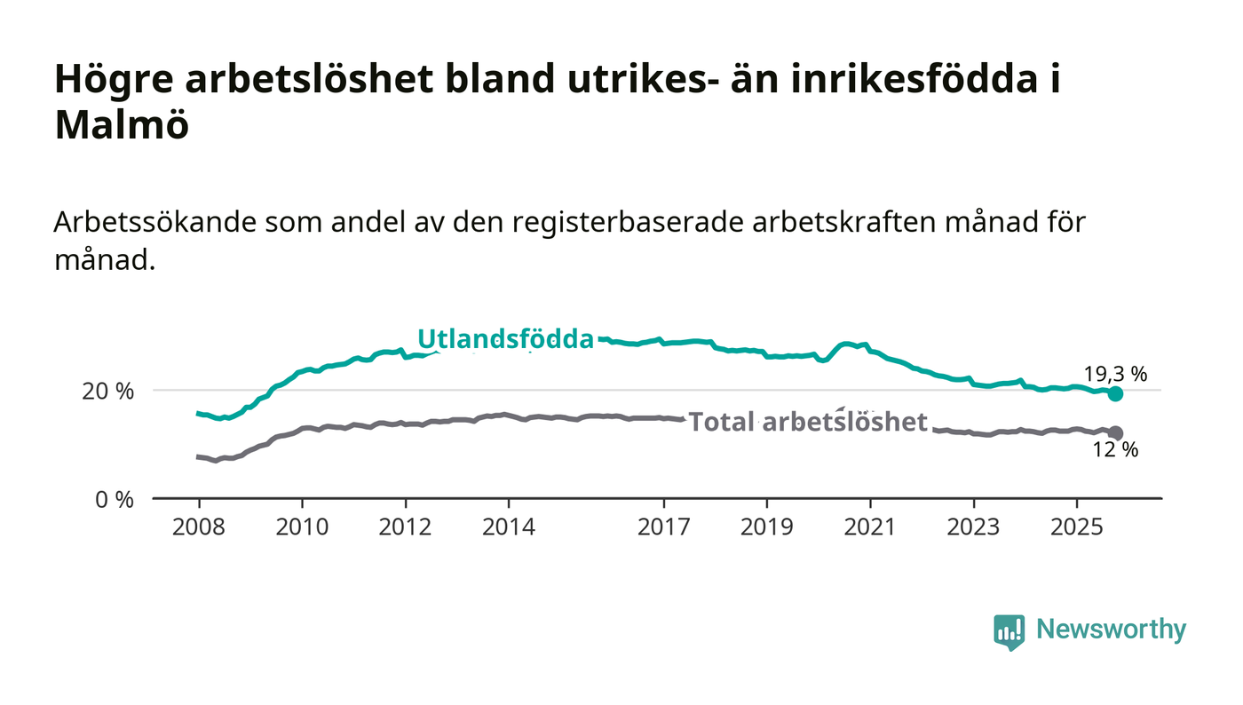 Arbetslösheten bland utlandsfödda var 19,3 procent i Malmö under oktober månad, motsvarande 15 111 av 78 295 personer. Det är 0,9 procentenheter färre än vid samma tidpunkt i fjol (−401 om man räknar personer). Därmed är de utlandsföddas arbetslöshet lägre än vid samma tidpunkt i fjol för nionde månaden i följd. Sedan januari har arbetslösheten bland utlandsfödda minskat från 20,6 till 19,3 procent. Den nuvarande arbetslöshetsnivån är den lägsta sedan maj 2009.