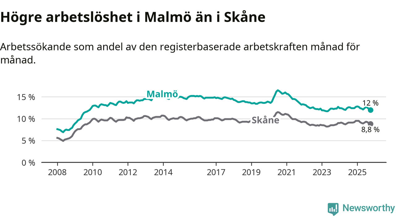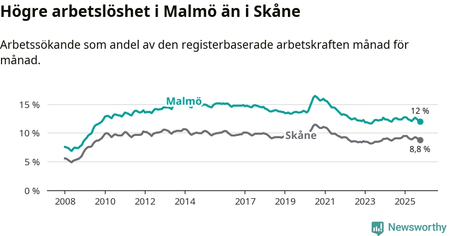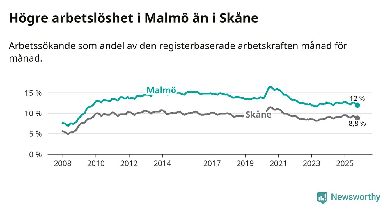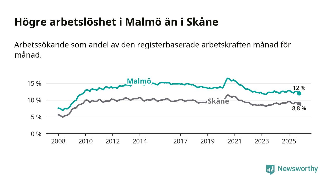 Även om arbetslösheten i Malmö alltså minskar, så ligger den fortfarande över snittet i hela Skåne län (12,0 procent i kommunen, jämfört med 8,8 procent i hela länet). Lomma har den lägsta arbetslösheten i länet (4,1 procent), medan Perstorp har den högsta (13,6 procent). För att Malmö skulle komma ner i samma arbetslöshetsnivå som Lomma skulle 14 943 personer behöva sysselsättas.