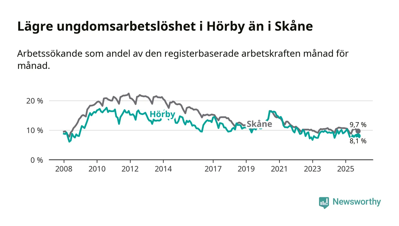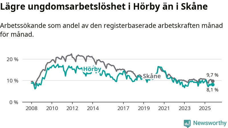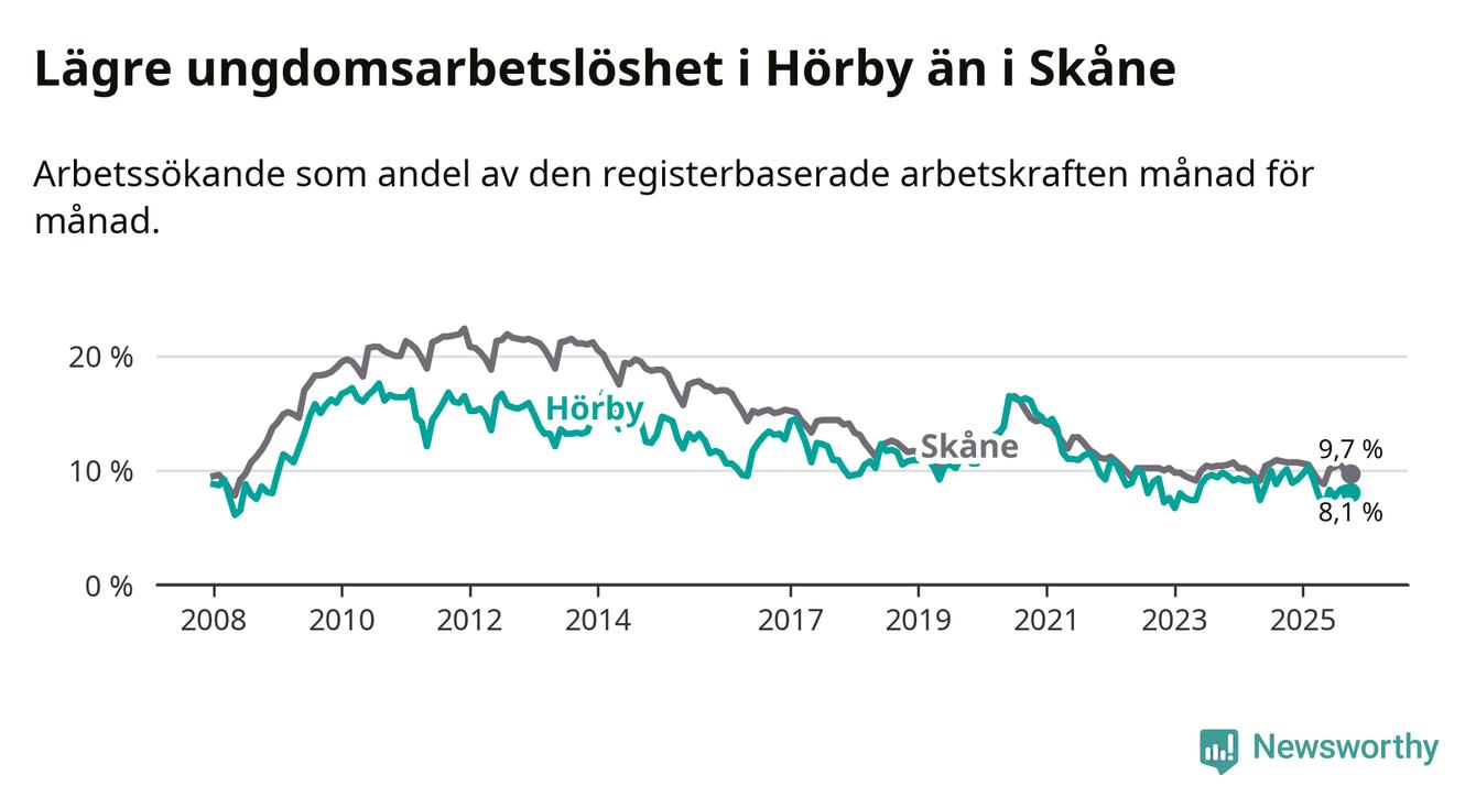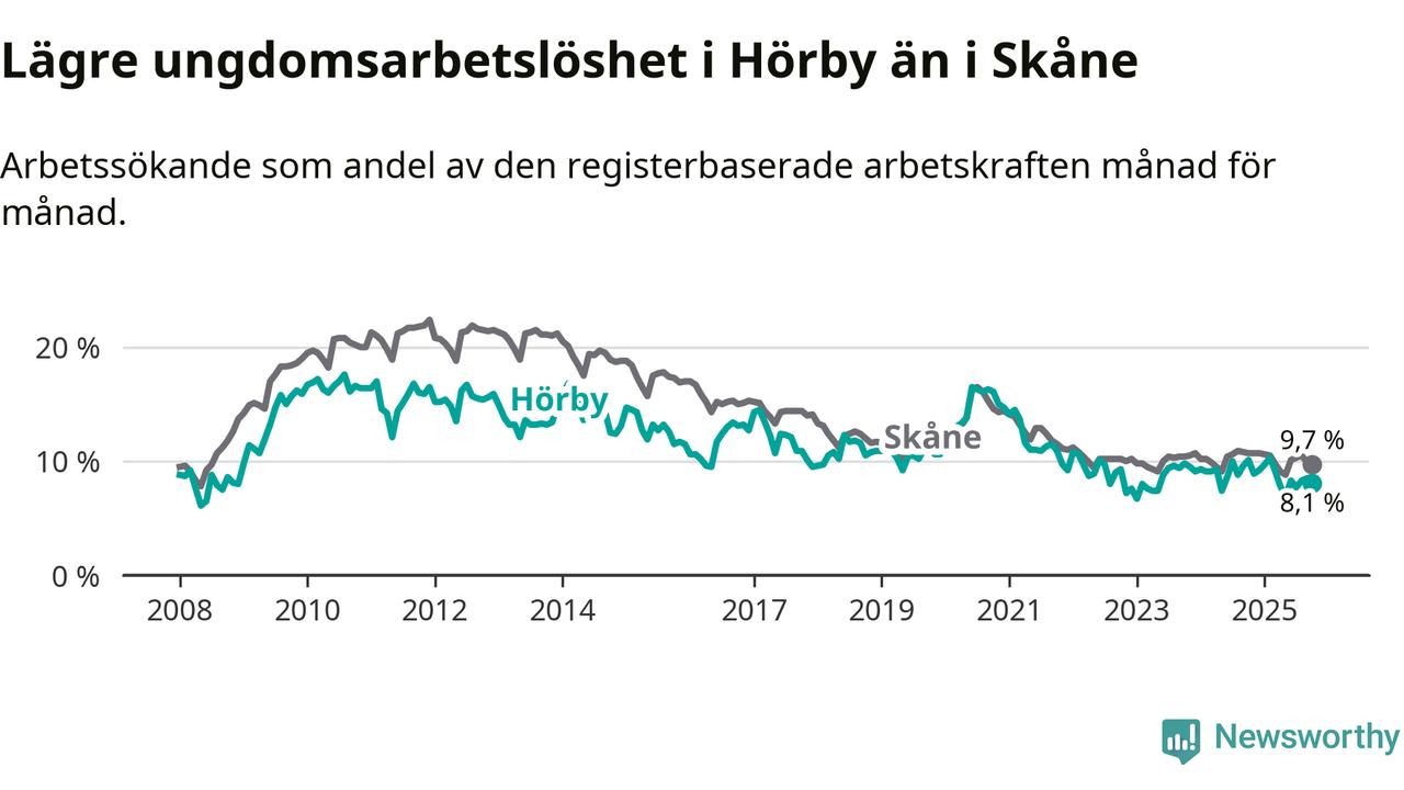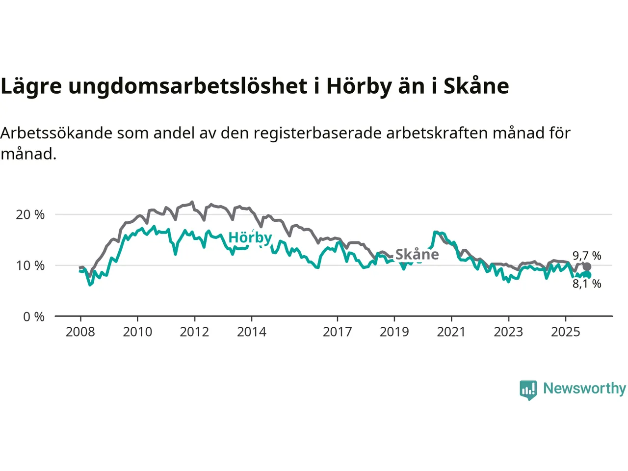 Precis som den totala arbetslösheten ligger ungdomsarbetslösheten i Hörby lägre än i Skåne som helhet. Skillnaden mellan kommunen och länet är 1,6 procentenheter.