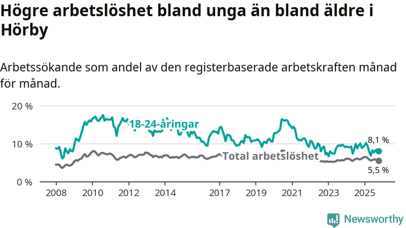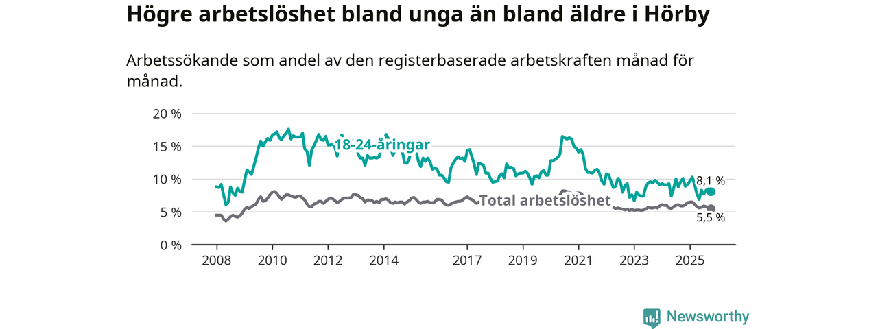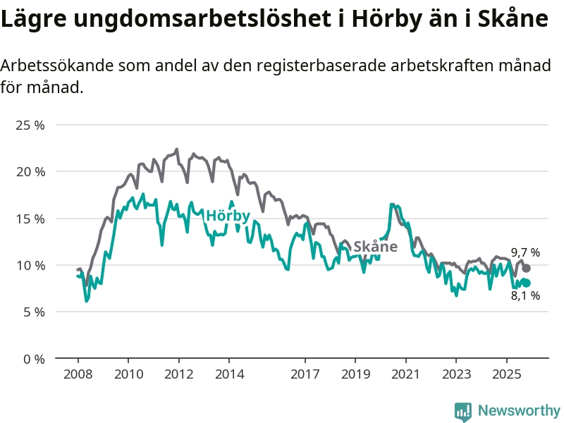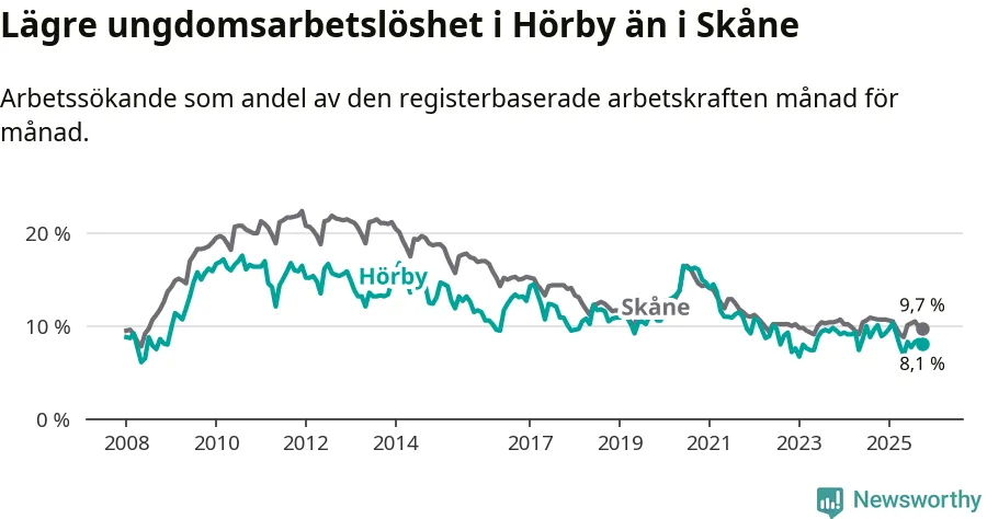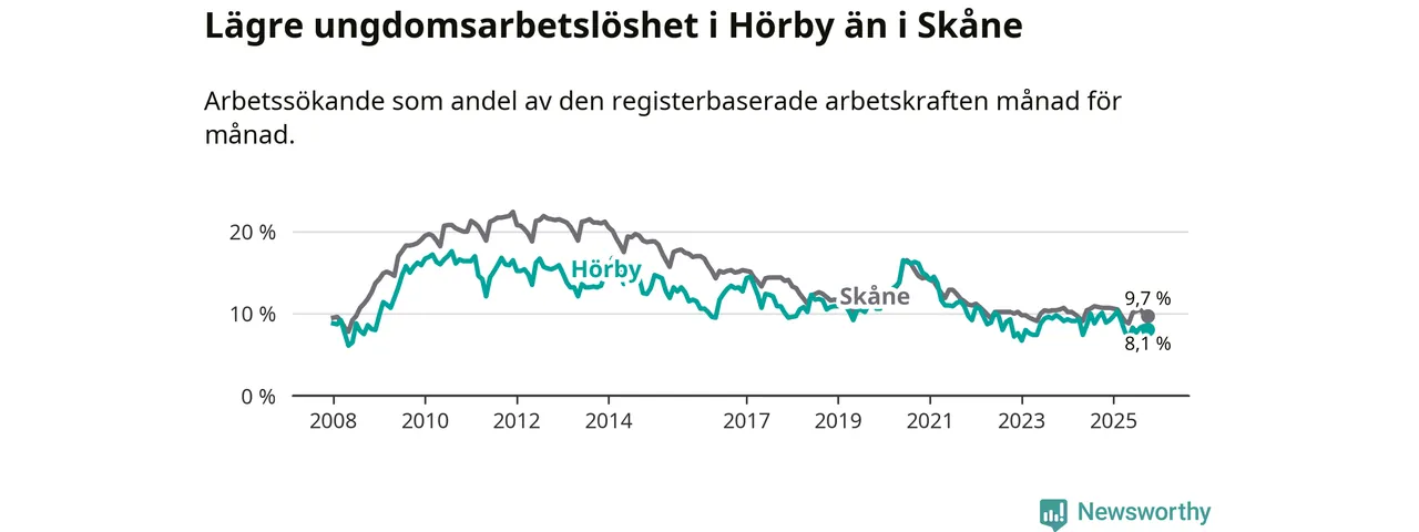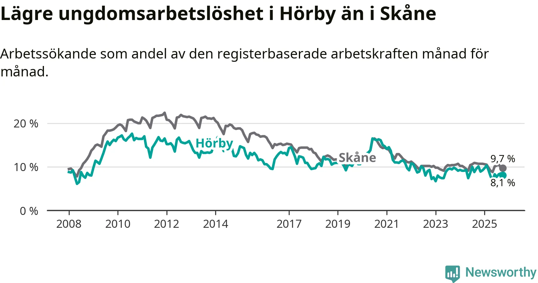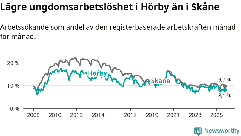 Precis som den totala arbetslösheten ligger ungdomsarbetslösheten i Hörby lägre än i Skåne som helhet. Skillnaden mellan kommunen och länet är 1,6 procentenheter.