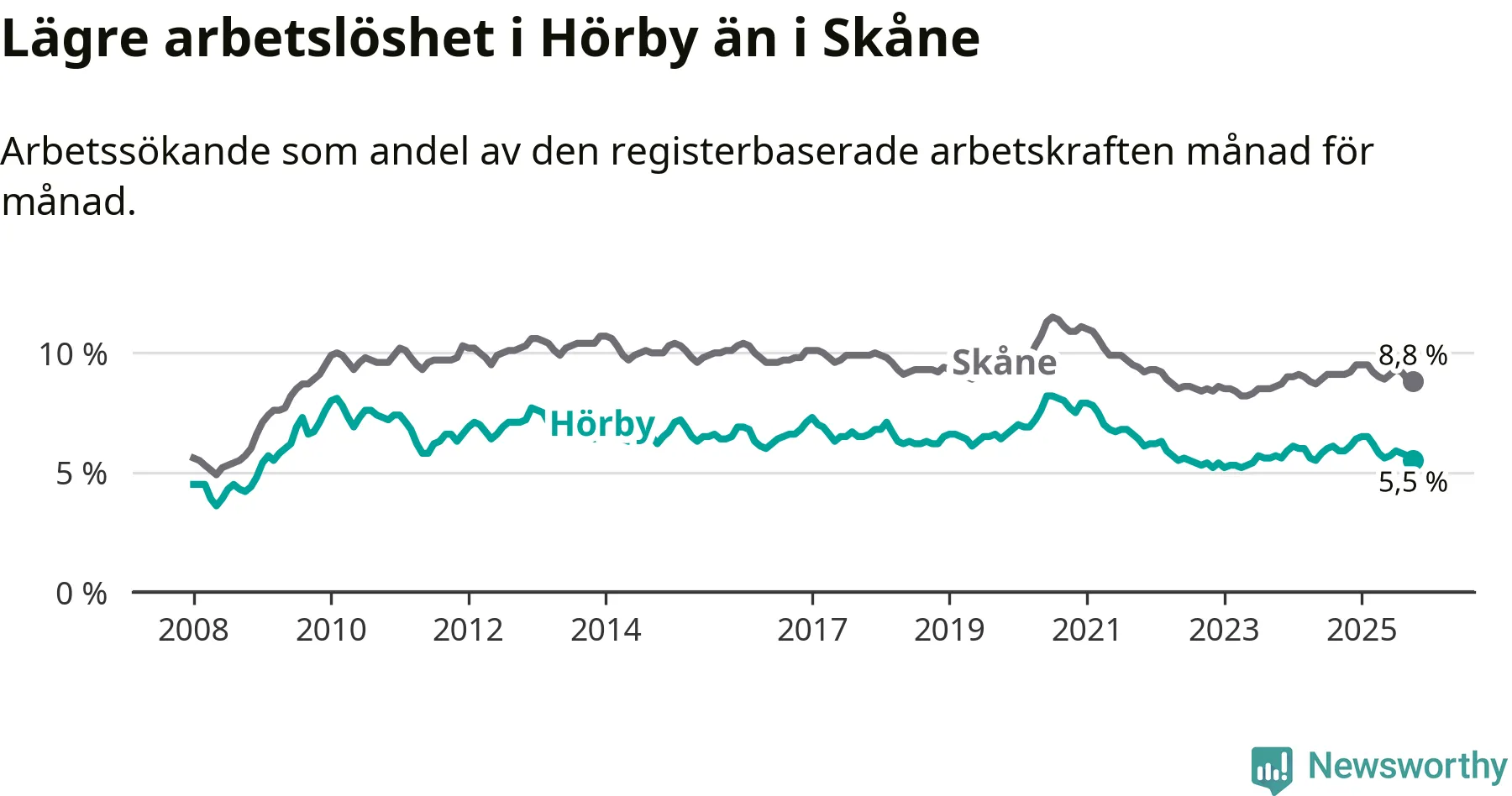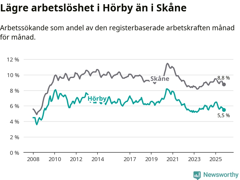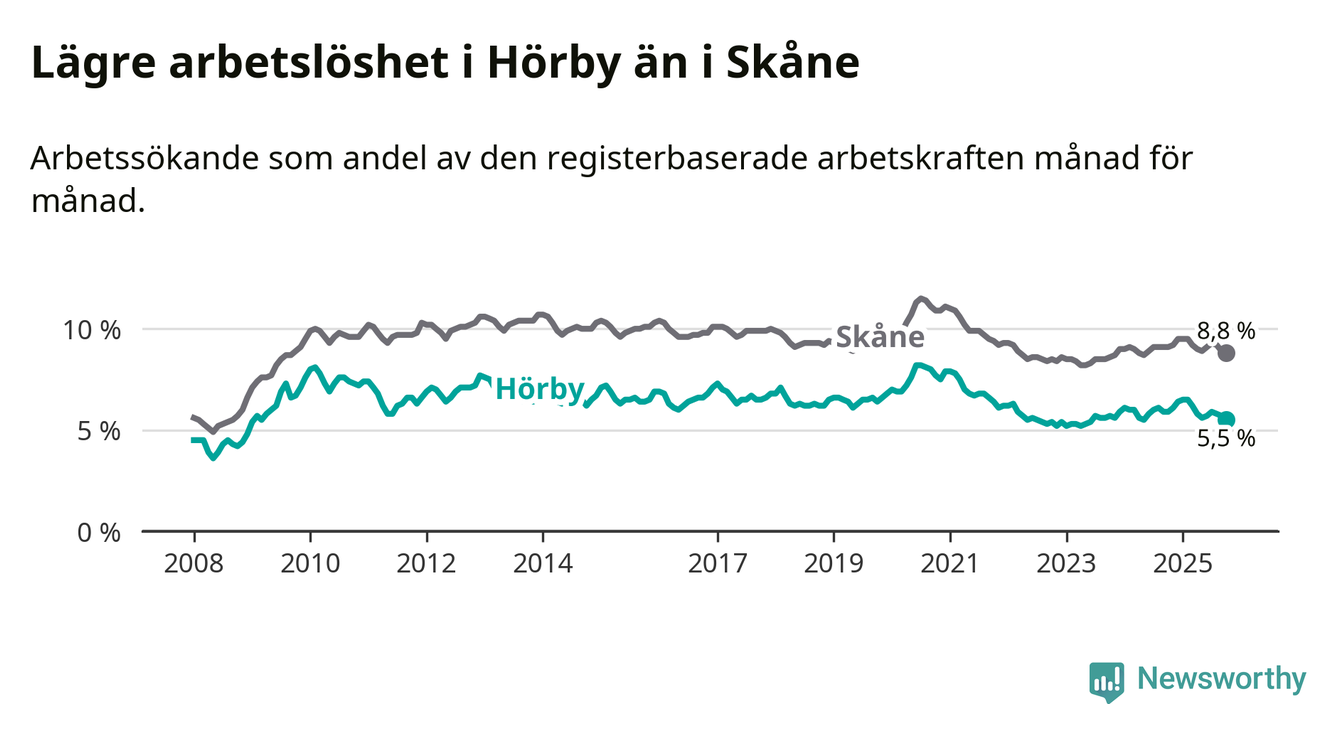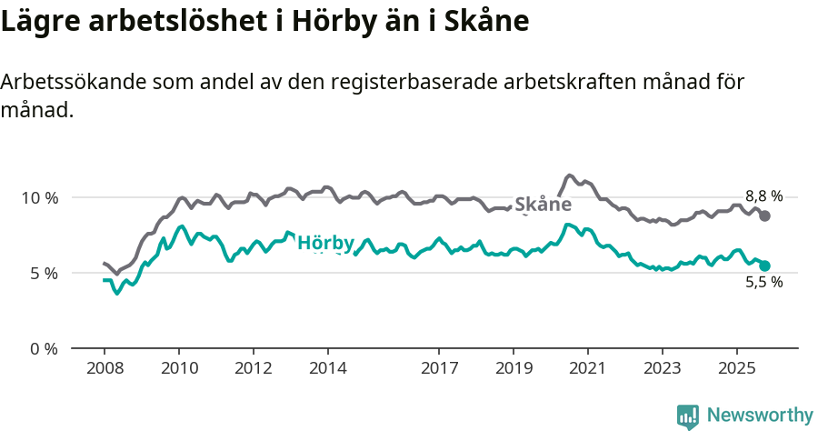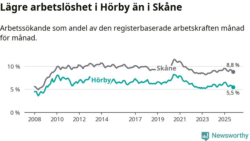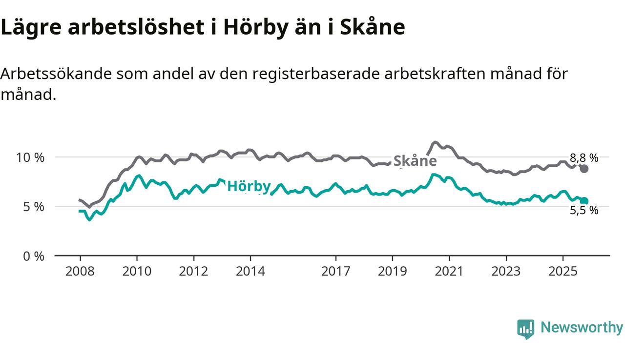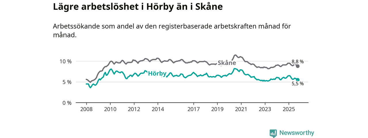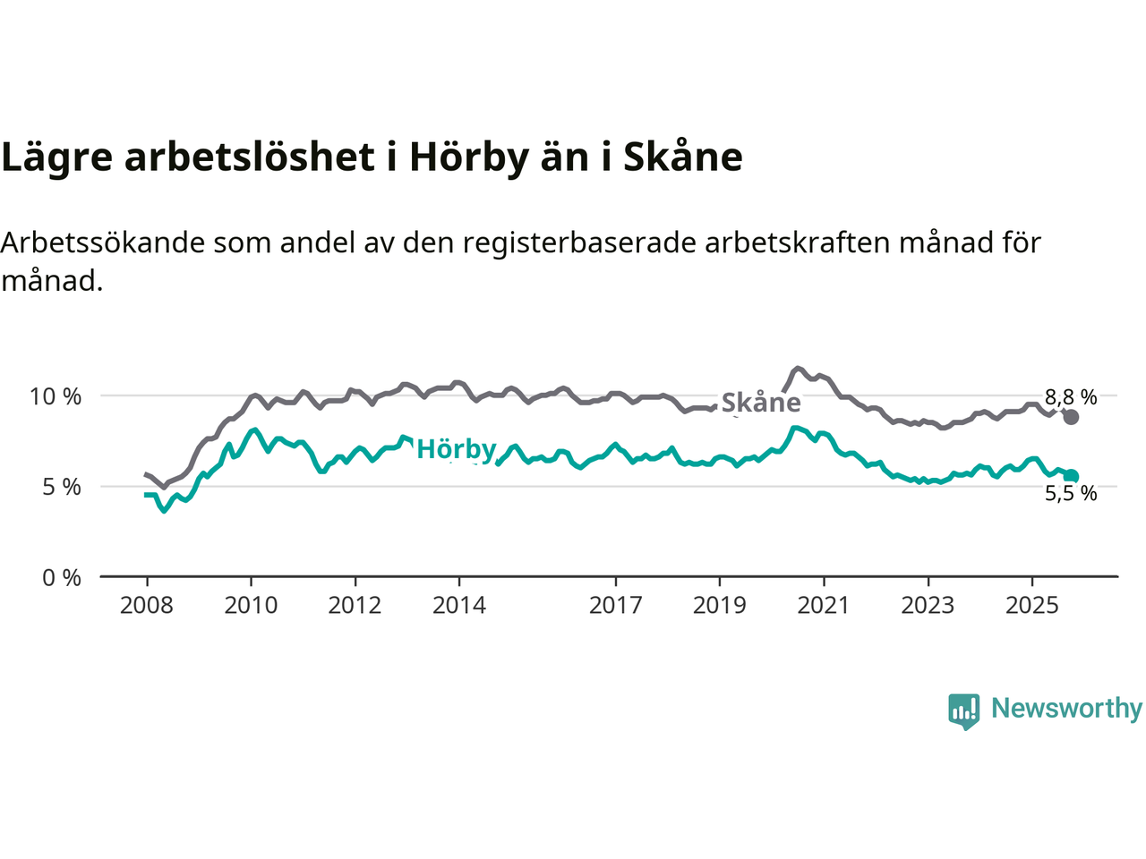 Under oktober månad rapporterade Hörby kommun en total arbetslöshet på 5,5 procent. Det är en minskning jämfört med samma tidpunkt i fjol (−0,4 procentenheter). Även i Skåne län sjunker arbetslösheten .