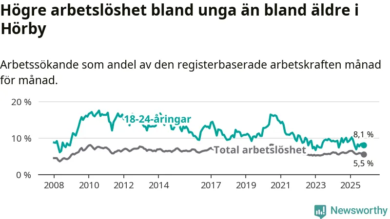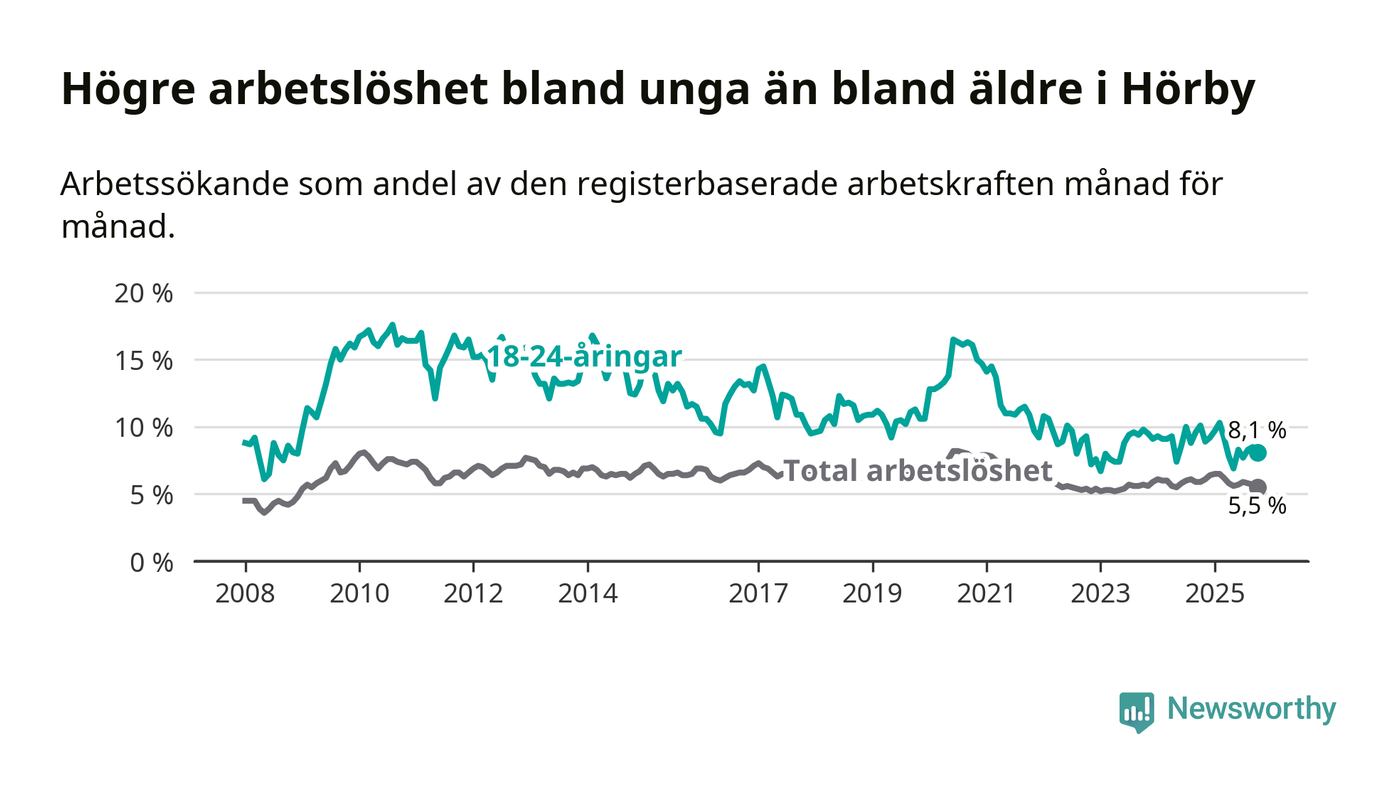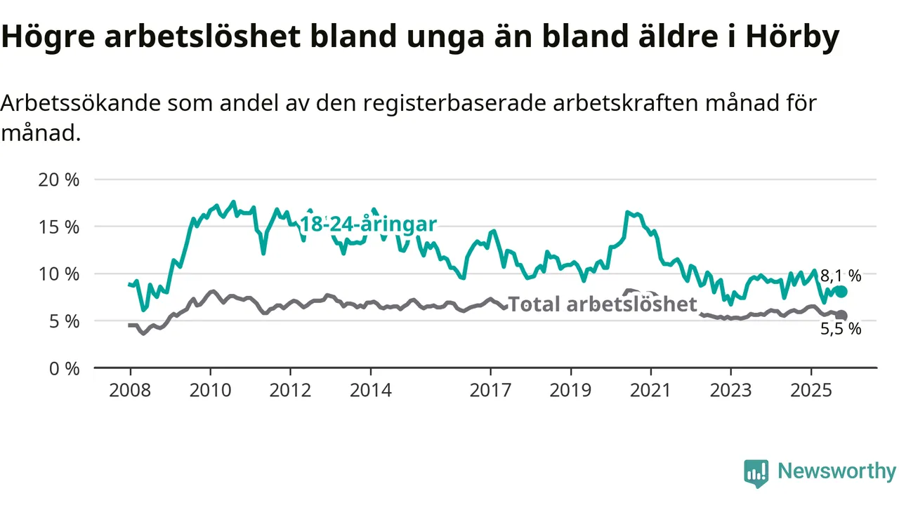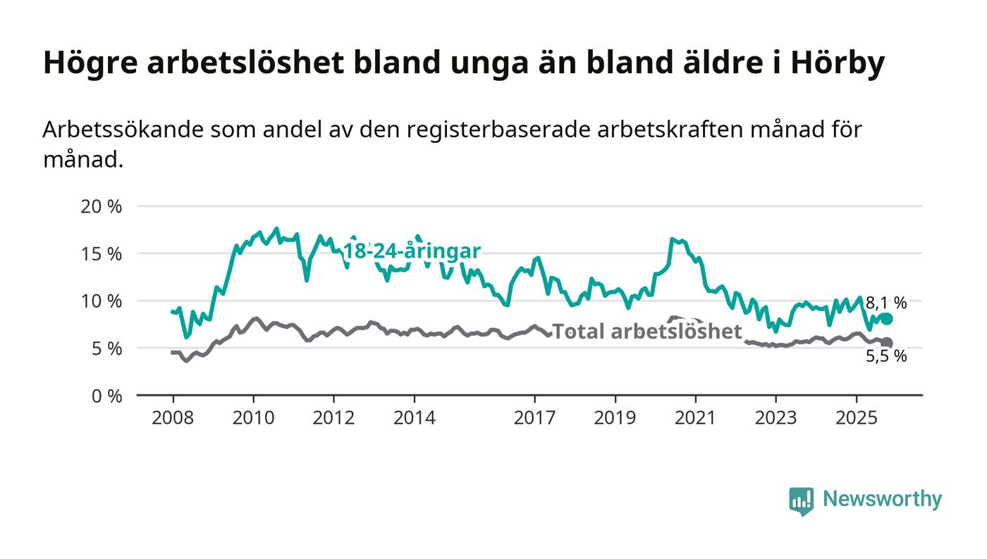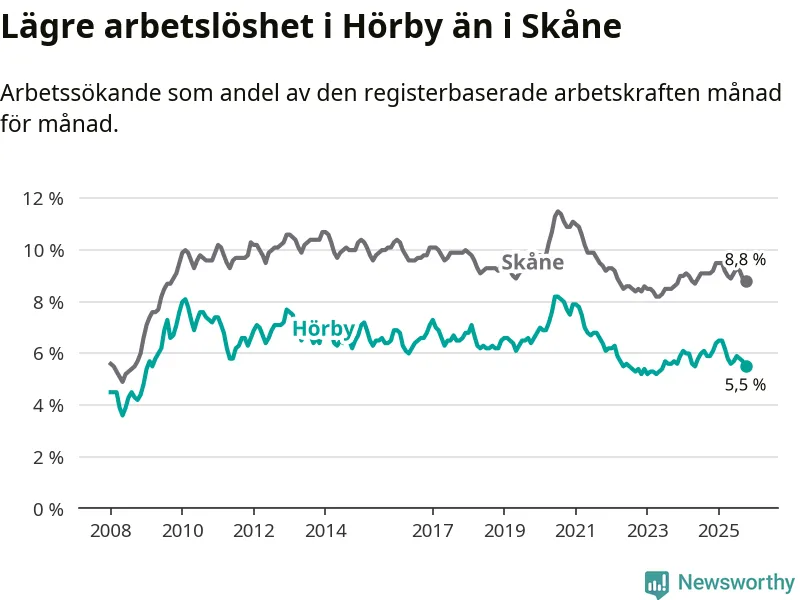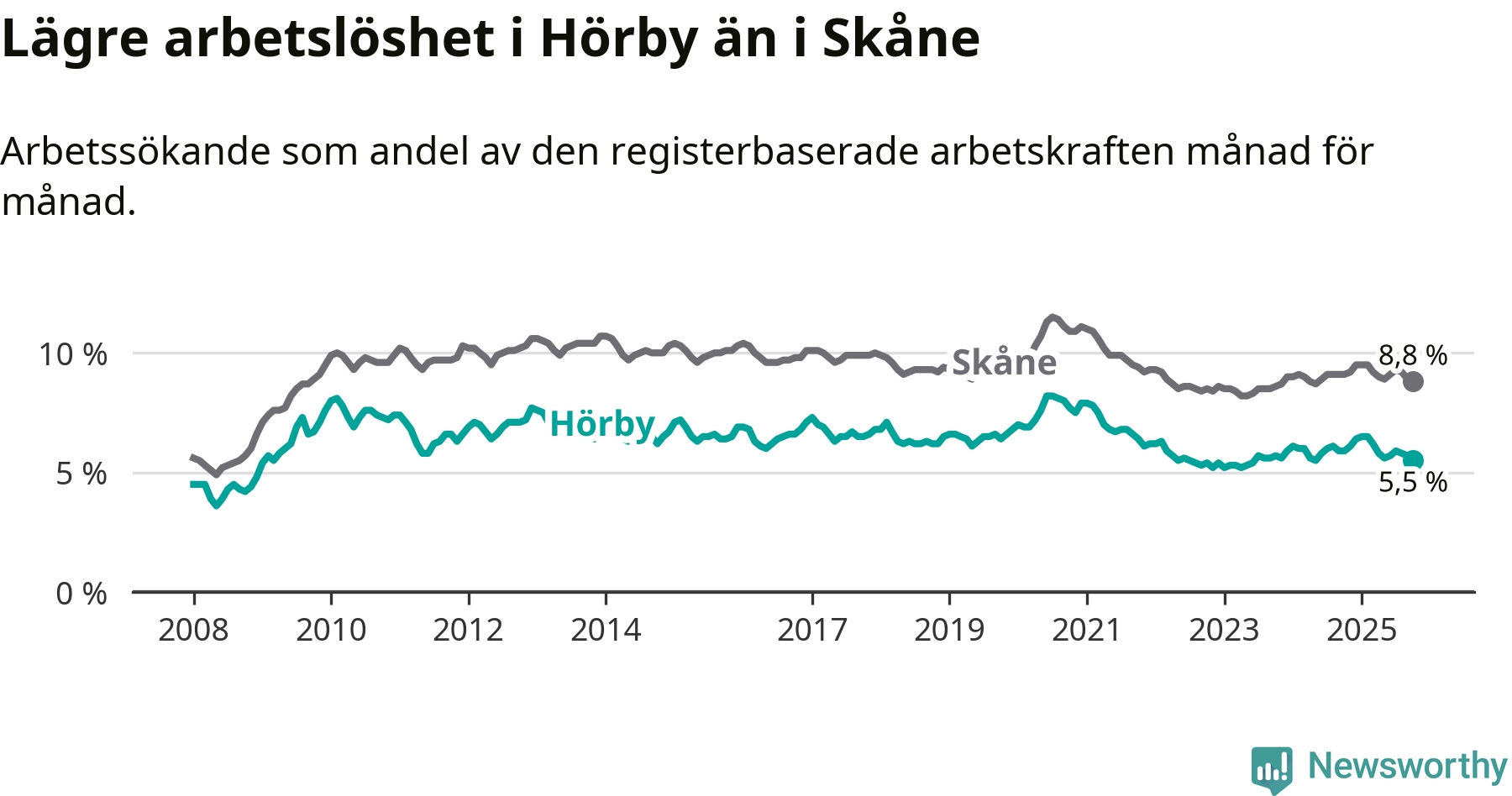 Under oktober månad rapporterade Hörby kommun en total arbetslöshet på 5,5 procent. Det är en minskning jämfört med samma tidpunkt i fjol (−0,4 procentenheter). Även i Skåne län sjunker arbetslösheten .