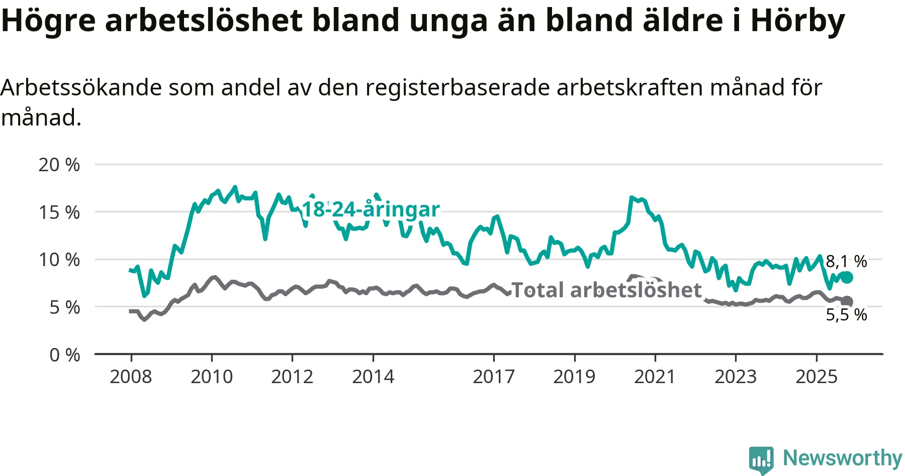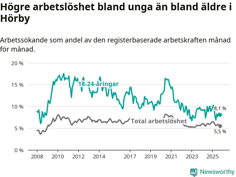 I och med den senaste månadens nedgång har de ungas arbetslöshet i Hörby sjunkit sju månader i följd (ner från 9,2 procent i mars till 8,1 procent nu).