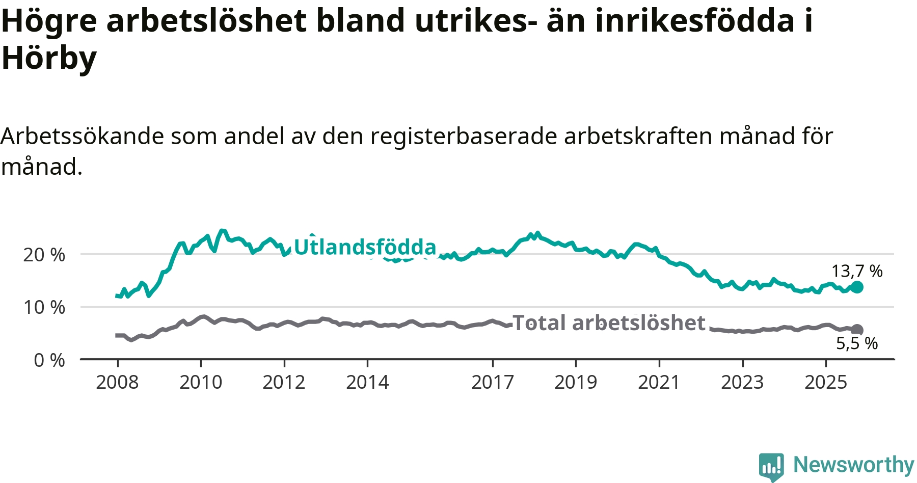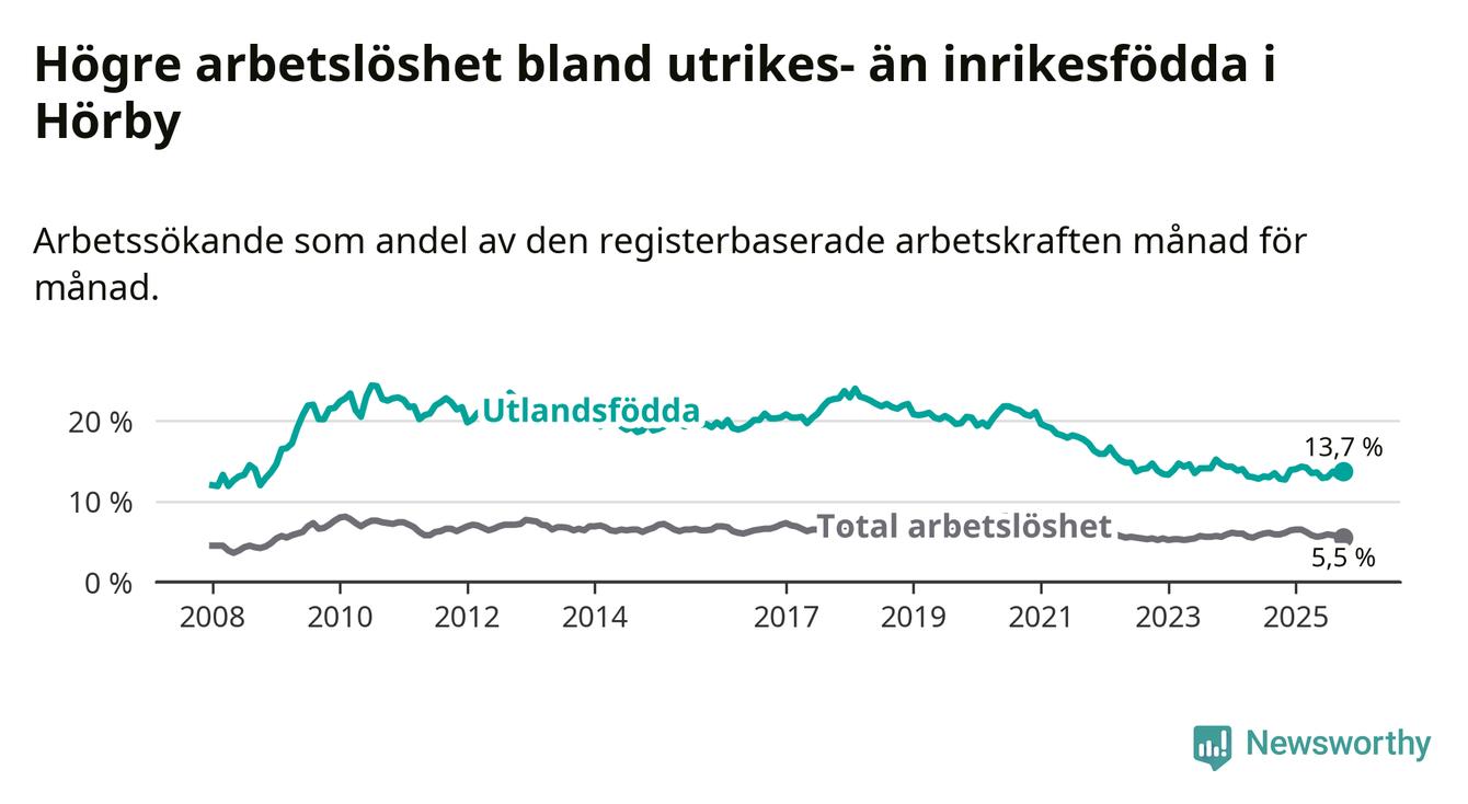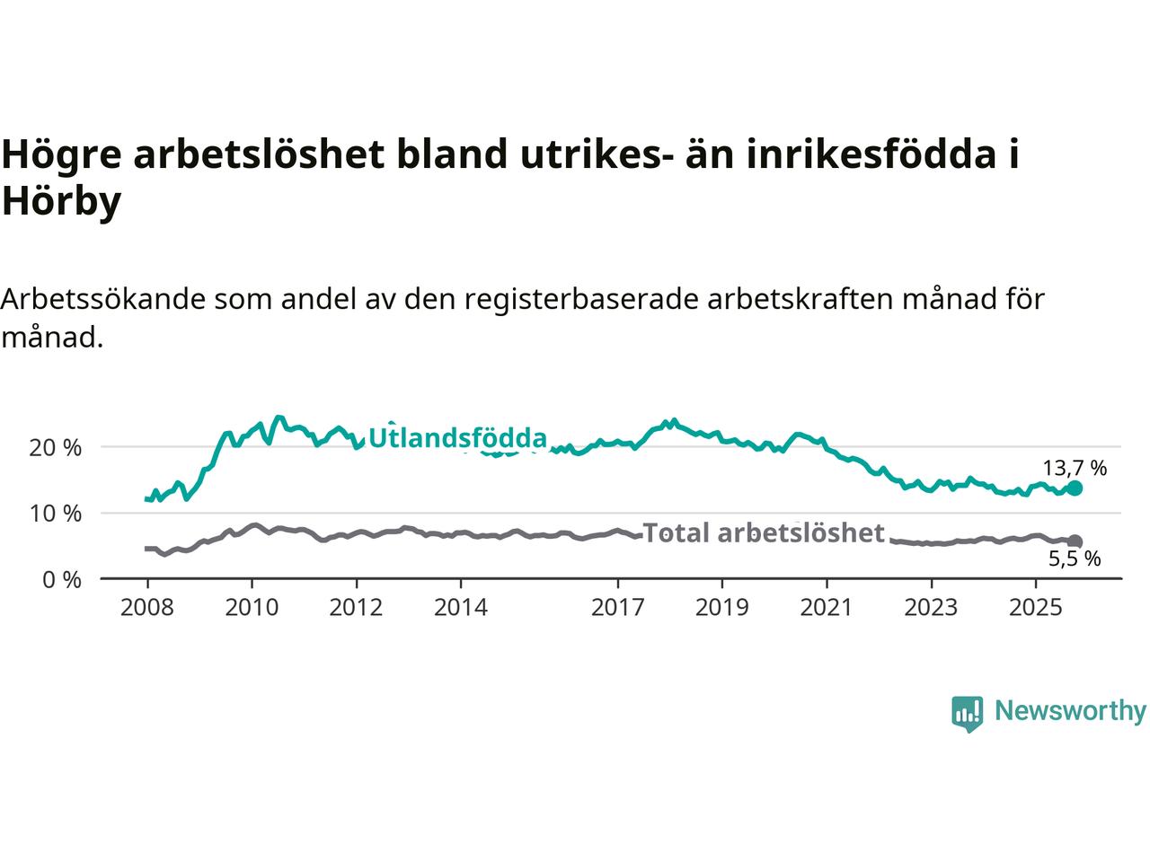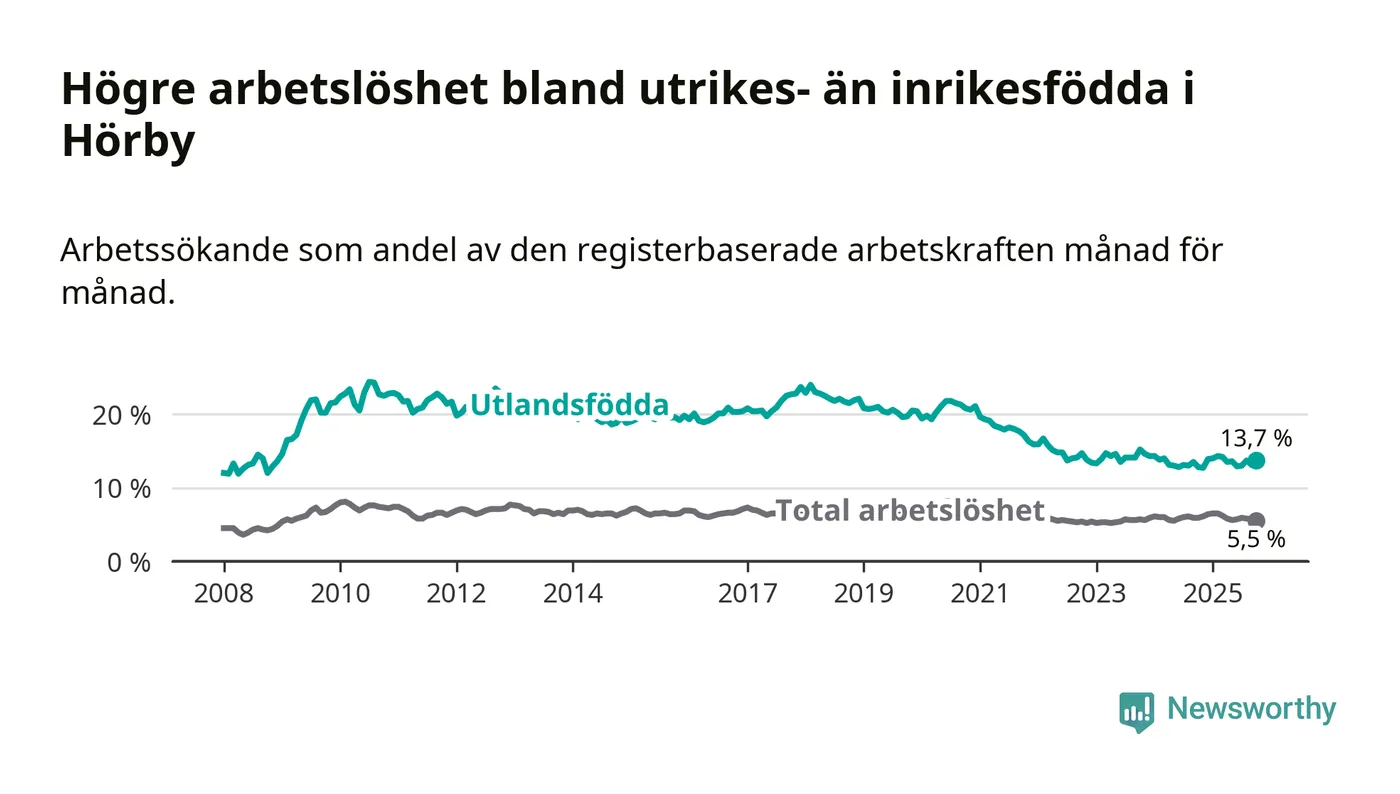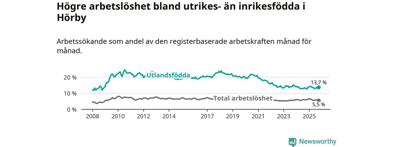 Arbetslösheten bland utlandsfödda var 13,7 procent i Hörby under oktober månad, motsvarande 156 av 1 139 personer. Det är 0,9 procentenheter fler än vid samma tidpunkt i fjol (+9 om man räknar personer). Den senaste månadens uppgång innebär ett trendbrott. Under de ett föregående månaderna hade arbetslösheten bland utlandsfödda varit lägre än motsvarande tidpunkt året innan.
