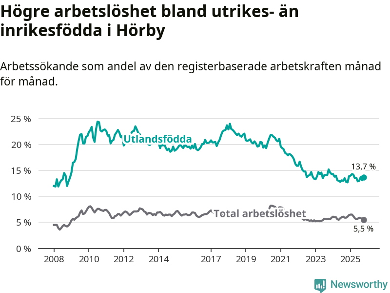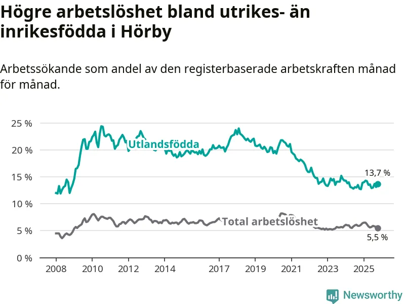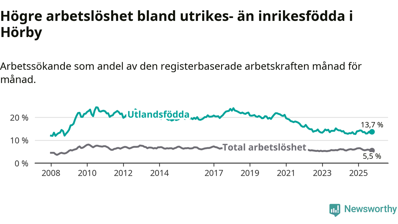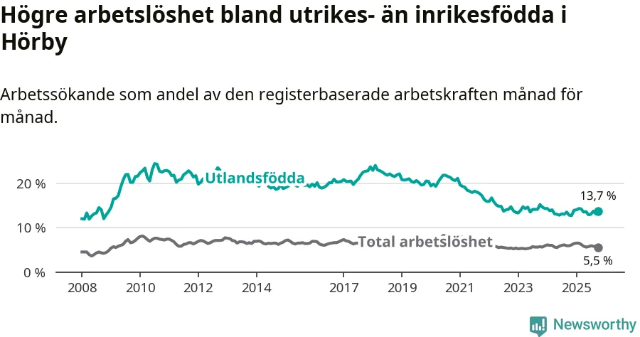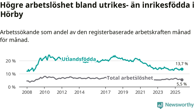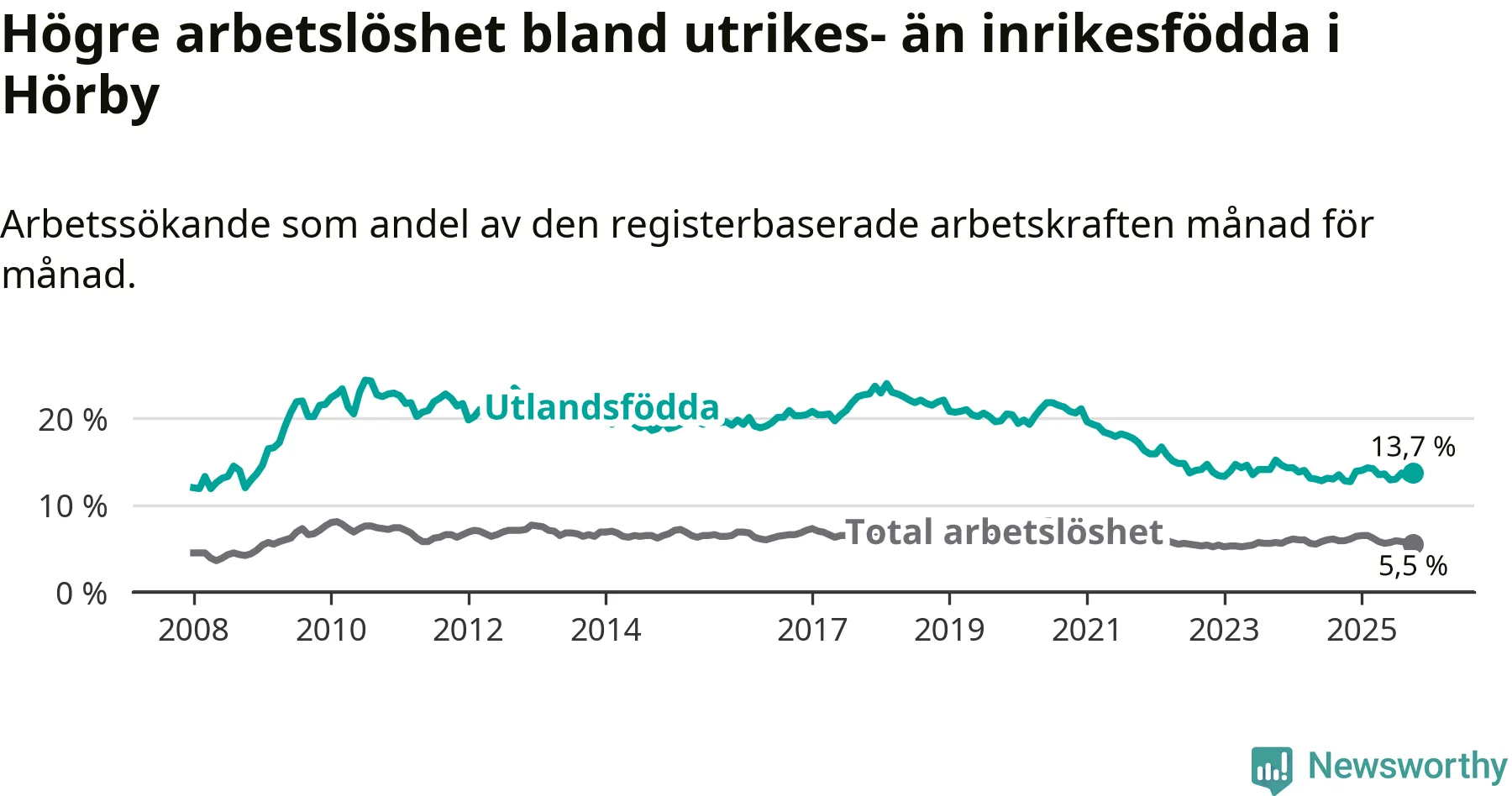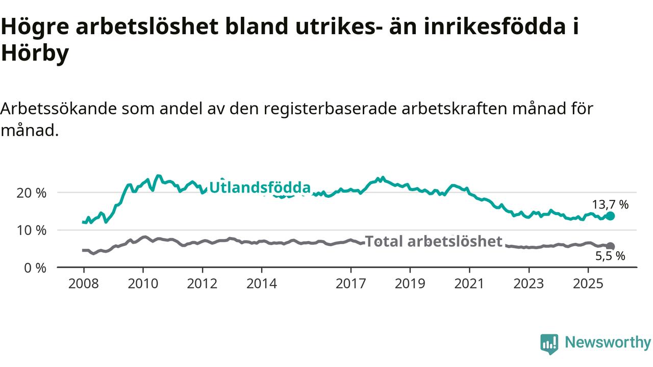 Arbetslösheten bland utlandsfödda var 13,7 procent i Hörby under oktober månad, motsvarande 156 av 1 139 personer. Det är 0,9 procentenheter fler än vid samma tidpunkt i fjol (+9 om man räknar personer). Den senaste månadens uppgång innebär ett trendbrott. Under de ett föregående månaderna hade arbetslösheten bland utlandsfödda varit lägre än motsvarande tidpunkt året innan.
