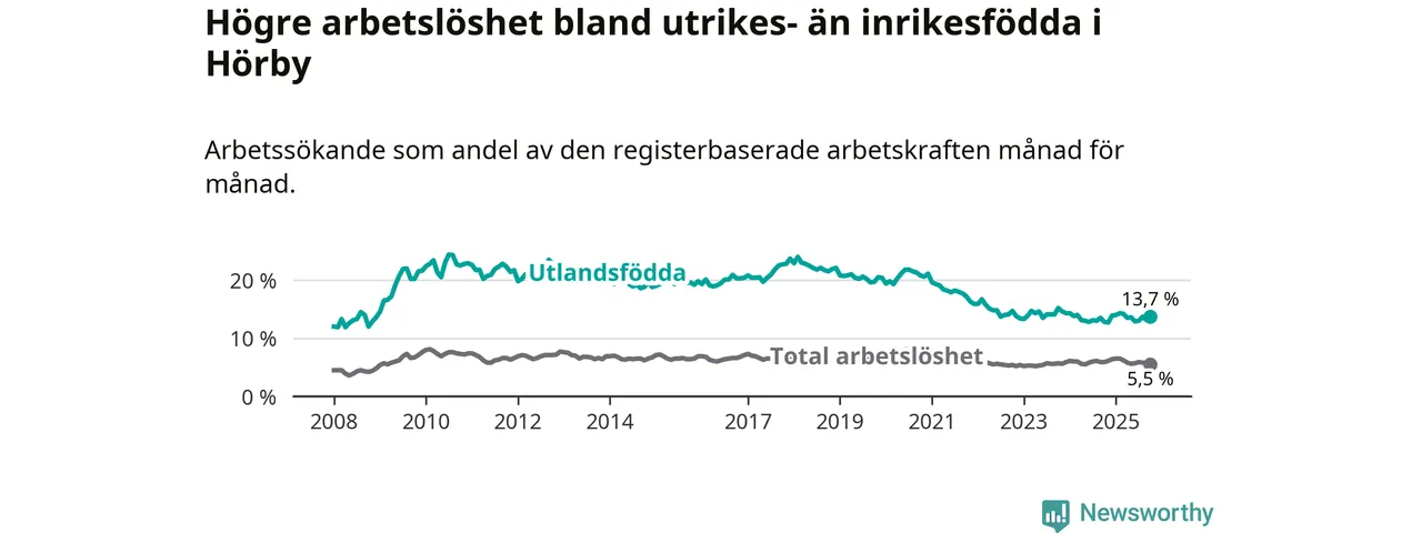 Den senaste månadsstatistiken från Arbetsförmedlingen visar på en uppgång i arbetslöshet bland utlandsfödda i Hörby kommun med 0,9 procentenheter. Arbetslösheten bland invånare födda i ett annat land låg i oktober på 13,7 procent.