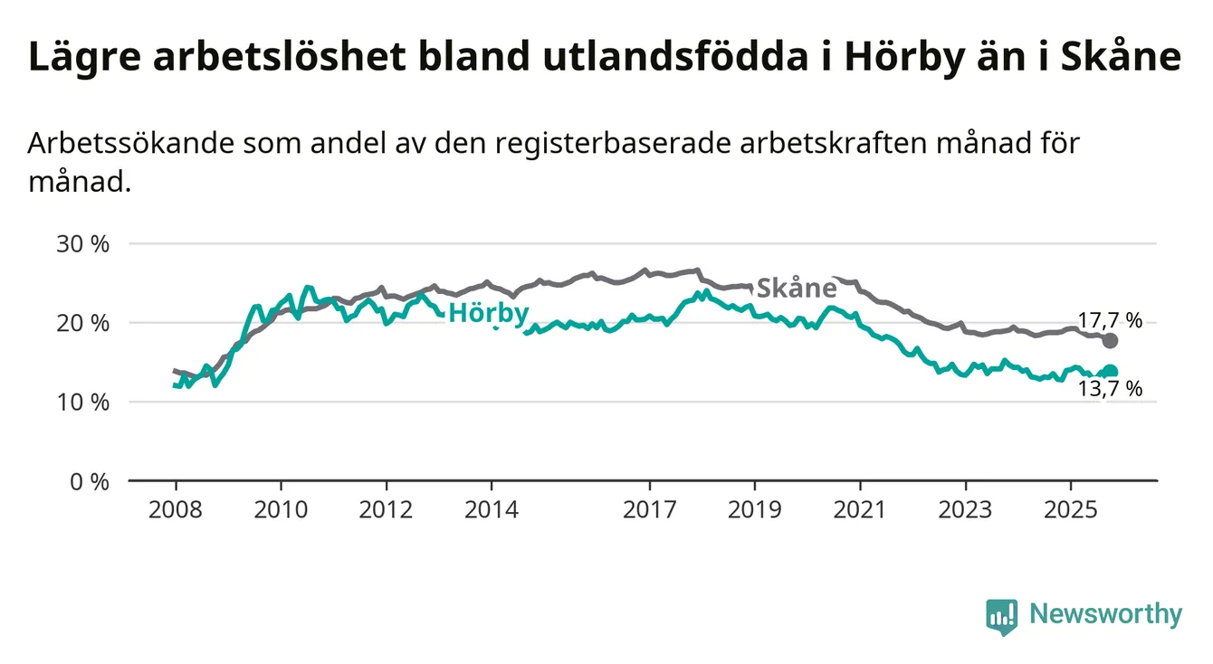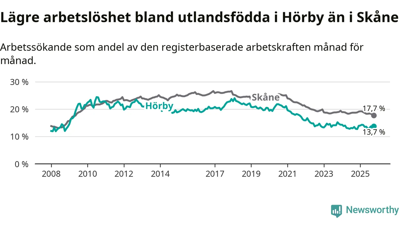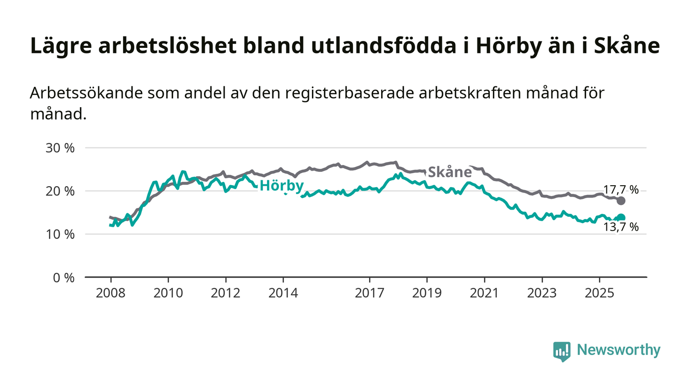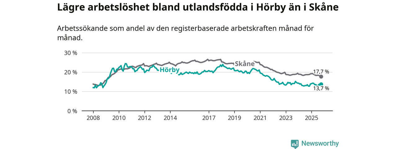 Medan arbetslösheten bland utlandsfödda alltså ökar i Hörby så minskar den i Skåne. Jämfört med oktober förra året har andelen arbetslösa utlandsfödda i länet minskat med 1,0 procentenheter (till 17,7 procent). Trots den senaste uppgången har Hörby med andra ord fortfarande lägre arbetslöshet bland utlandsfödda än Skåne.